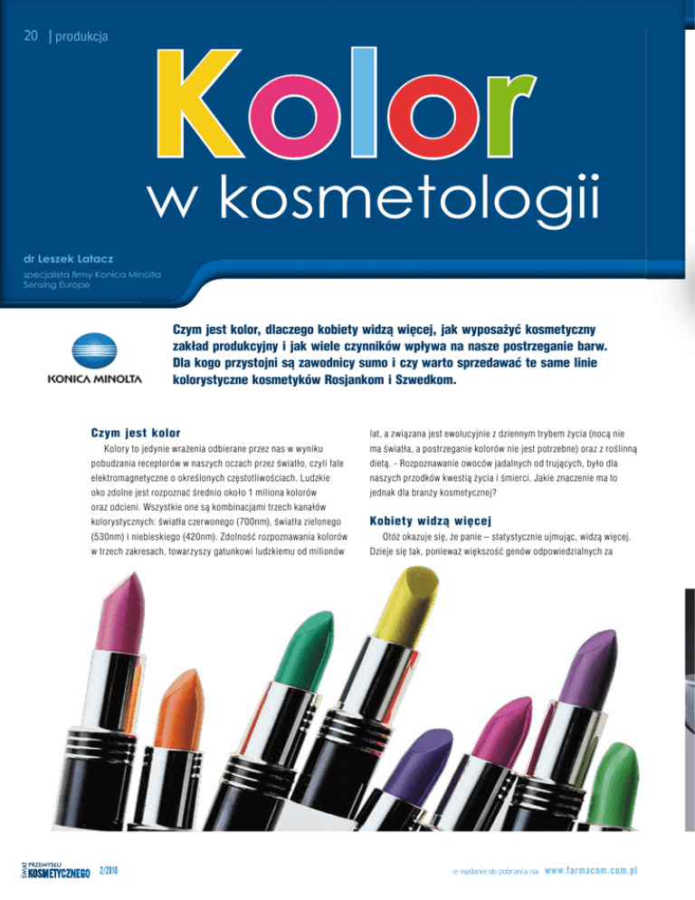 20 | produkcja Kolor w kosmetologii dr Leszek Latacz specjalista firmy Konica Minolta Sensing Europe Czym jest kolor, dlaczego kobiety widzą więcej, jak wyposażyć kosmetyczny zakład produkcyjny i jak wiele czynników wpływa na nasze postrzeganie barw. Dla kogo przystojni są zawodnicy sumo i czy warto sprzedawać te same linie kolorystyczne kosmetyków Rosjankom i Szwedkom. Czym jest kolor Kolory to jedynie wrażenia odbierane przez nas w wyniku lat, a związana jest ewolucyjnie z dziennym trybem życia (nocą nie ma światła, a postrzeganie kolorów nie jest potrzebne) oraz z roślinną pobudzania receptorów w naszych oczach przez światło, czyli fale dietą. - Rozpoznawanie owoców jadalnych od trujących, było dla elektromagnetyczne o określonych częstotliwościach. Ludzkie naszych przodków kwestią życia i śmierci. Jakie znaczenie ma to oko zdolne jest rozpoznać średnio około 1 miliona kolorów jednak dla branży kosmetycznej? oraz odcieni. Wszystkie one są kombinacjami trzech kanałów kolorystycznych: światła czerwonego (700nm), światła zielonego (530nm) i niebieskiego (420nm). Zdolność rozpoznawania kolorów w trzech zakresach, towarzyszy gatunkowi ludzkiemu od milionów 2/2010 Kobiety widzą więcej Otóż okazuje się, że panie – statystycznie ujmując, widzą więcej. Dzieje się tak, ponieważ większość genów odpowiedzialnych za e-w ydanie do pobrania na: w w w.farmacom.com.pl 21 percepcję barw znajduje się w chromosomie X. Mężczyźni mają nych, to kobiety. Tym samym wymagania, jakim produkty kosme- w swoich komórkach tylko jeden taki chromosom, kobiety – dwa. tyczne muszą sprostać w zakresie swojej kolorystyki, należą do tych Co więcej, około 2 procent pań widzi kolory jako składową nie najbardziej wyśrubowanych. trzech, a czterech kanałów kolorystycznych (tzw. tetrachromatyzm), co umożliwia obserwację do 100 milionów odcieni i barw. Niektórzy twierdzą, że oglądana przez tatrachromatyczkę tęcza, będzie mieć nawet dziesięć kolorów. Tetrachromatyzm nie zdarza się wśród Pomiar i recepturowanie barw w przemyśle kosmetycznym Jakość kolorystyczna produktów wymaga precyzyjnego receptu- mężczyzn. Ich ewolucyjne przystosowanie (przyjmując w uproszcze- rowania oraz szczegółowych pomiarów – również kontrolnych, niu: polowania a nie zbieractwo), odbyło się kosztem percepcji barw. na etapie przyjmowania dostawy surowców oraz na etapie produkcji. Ma to oczywiście znaczenie także w branży kosmetycznej. Optymalnym rozwiązaniem jest wyposażenie zakładu produkcyjnego Dziś nawet około 80-90% klientów drogerii i sklepów kosmetycz- w nowoczesny spektrofotometr (urządzenie do pomiaru i kontroli Pomiar barwy pasty w odbiciu e-w ydanie do pobrania na: w w w.farmacom.com.pl Układ współrzędnych CIE Lab służący do wyrażania barw 2/2010 22 | produkcja produkcja Pomiar cieczy w transmisji Pomiar transmisji ciał stałych barwy) oraz kompatybilne z nim oprogramowanie komputerowe do recepturowania nowych kolorów. Spektrofotometr powinien umożliwiać pomiar pełnego spektrum barw. Pamiętajmy, że ciemne kolory mogą wymagać zastosowania urządzenia pomiarowego wyposażonego w mocną ksenonową lampę błyskową. Warto także zwrócić uwagę na gamę zastosowań urządzenia: powinno pozwalać ono na kontrolę barwy proszków, cieczy, granulatów, kremów, past i ciał stałych. Precyzja oprogramowania do recepturowania zależy natomiast od wykorzystania wielostrumieniowych modeli matematycznych. Gwarantują one uwzględnienie wszystkich czynników, od jakich zależy barwa próbek. związany z branżą kosmetyczną: kod kulturowy. To w nim kryją się kanony piękna i urody. Postrzeganie Oprócz wspomnianych uwarunkowań fizjologicznych (indywidualna czułość oka, z pewnymi uwarunkowaniami płciowymi), na Kolory i kosmetyki w kulturach W Chinach kanon kobiecej urody wyznaczają małe stopy. postrzeganie wpływ mają przede wszystkim czynniki fizyczne, psy- W sąsiedniej Japonii za przystojnych uchodzą zawodnicy sumo. chologiczne i kulturowe. Z fizycznego punktu widzenia, postrzeganie Japonki pielęgnujące porcelanową, bladą cerę, celowo nawiązują barw zależy w znacznej mierze od światła odbitego. Każdy obiekt, zaś do ideału urody utrwalonego w kulturze przez Gejsze. ze względu na swoje cechy, dysponuje określonym widmem odbicio- – W poszczególnych częściach świata obserwujemy nie tylko zróż- wym, decydującym o jego kolorze (niezależnie od oświetlenia). nicowane pojęcie piękna, ale i określone preferencje kolorystyczno- Już jednak jego jasność, czy nasycenie postrzegane mogą być róż- kosmetyczne. Odnotować możemy zatem m.in. popularność mocnego nie, zależnie od mocy i rodzaju padającego światła (inaczej widzimy makijażu w krajach Europy Wschodniej (jak Rosja), popularność w świetle dziennym, inaczej w świetle jarzeniówki). Na postrzeganie zdobienia paznokci w poszczególnych krajach Ameryki Łacińskiej koloru wpływ mają także tak mierzalne czynniki jak tło, rozmiar (jak Brazylia), czy skłonność do chłodnej tonacji barw kosmetyków obiektu, kierunek oświetlenia i obserwacji, itp. Na przeciwległym kolorowych w krajach skandynawskich. Te i podobne im zjawiska nie biegunie znajdą się z kolei okoliczności subiektywne, psychologicz- odzwierciedlają rzecz jasna pełnego obrazu rynków. Dość dobrze ne: nasz nastrój, kondycja, upodobania. Gdzieś pomiędzy czynnikami ilustrują jednak zróżnicowany potencjał pewnych grup produktów, ze obiektywnymi a subiektywnymi plasuje się trzeci czynnik, najsilniej względu na kryterium kulturowe i kryterium kolorystyczne. 2/2010 e-w ydanie do pobrania na: w w w.farmacom.com.pl