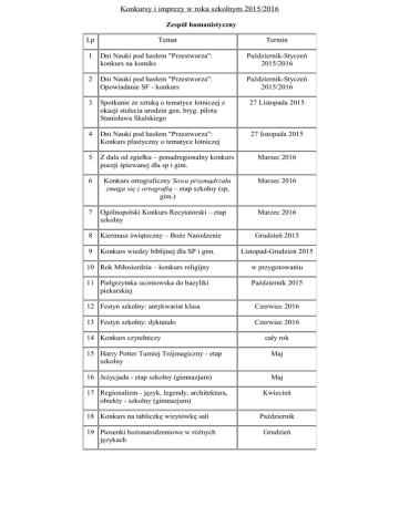 Konkursy i imprezy w roku szkolnym 2015/2016 Zespół humanistyczny Lp Temat Termin 1 Dni Nauki pod hasłem "Przestworza": konkurs na komiks Październik-Styczeń 2015/2016 2 Dni Nauki pod hasłem "Przestworza": Opowiadanie SF - konkurs Październik-Styczeń 2015/2016 3 Spotkanie ze sztuką o tematyce lotniczej z okazji stulecia urodzin gen. bryg. pilota Stanisława Skalskiego 27 Listopada 2015 4 Dni Nauki pod hasłem "Przestworza": Konkurs plastyczny o tematyce lotniczej 27 listopada 2015 5 Z dala od zgiełku – ponadregionalny konkurs poezji śpiewanej dla sp i gim. Marzec 2016 6 Konkurs ortograficzny Sowa przemądrzała zmaga się z ortografią – etap szkolny (sp, gim.) Marzec 2016 7 Ogólnopolski Konkurs Recytatorski – etap szkolny 8 Kiermasz świąteczny – Boże Narodzenie 9 Konkurs wiedzy biblijnej dla SP i gim. Marzec 2016 Grudzień 2015 Listopad-Grudzień 2015 10 Rok Miłosierdzia – konkurs religijny w przygotowaniu 11 Pielgrzymka uczniowska do bazyliki piekarskiej Październik 2015 12 Festyn szkolny: antykwariat klasa Czerwiec 2016 13 Festyn szkolny: dyktando Czerwiec 2016 14 Konkurs czytelniczy cały rok 15 Harry Potter Turniej Trójmagiczny - etap szkolny Maj 16 Jeżycjada - etap szkolny (gimnazjum) Maj 17 Regionalizm - język, legendy, architektura, obiekty - szkolny (gimnazjum) 18 Konkurs na tabliczkę wizytówkę sali 19 Piosenki bożonarodzeniowe w różnych językach Kwiecień Październik Grudzień Zespół języków obcych Lp Temat 1 Dzień Amerykański – konkurs z języka angielskiego 2 dyktando dla szkoły podstawowej i gimnazjum z języka angielskiego 3 Dzień Św. Patryka 4 konkurs multimedialny ,, 14 dni po Europie” w języku angielskim i niemieckim Termin Listopad 2015 Marzec 2016 II półrocze 2016 Zespół przyrodniczy Lp Temat Termin 1 „Dopalacze kradną życie” (gimnazjum) Wrzesień – październik 2015 2 „Zielnik liści drzew” (IV i V SP) Październik 2015 3 „Wpływ człowieka na środowisko” (gimnazjum) Grudzień 2015 – Styczeń 2016 4 „Konkurs fotograficzny – przestworza” (cała szkoła) Październik 2015 5 „Woda i roztwory wodne” (II i III gimnazjum) 6 „Wizytówka substancji organicznej i nieorganicznej” (gimnazjum) kwiecień 2016 7 „Projekt na doświadczenia fizyczne i chemiczne” (gimnazjum) Marzec – kwiecień 2016 Zespół Lp Marzec 2016 matematyczno- informatyczno- techniczny Temat 1 Mistrz liczenia matematycznego dla klas 4,5,6. 2 Szkolny konkurs na kartkę bożonarodzeniową i wielkanocną 3 Przystąpienia do projektu LEPSZA SZKOŁA 4 Międzyszkolny konkurs dla klas 4-6 SP- w ramach przedmiotów :informatyka i j. polski pt. Ilustracja mojej ulubionej lektury. Termin Do końca grudnia eliminacje. Finał konkursu do 15 marca Grudzień 2015-Marzec 2016 Cały rok Październik-Listopad Edukacja wczesnoszkolna WRZESIEŃ1. WYJŚCIE DO BCK-u – KLAS 1 2. DZIEŃ CHŁOPAKA- wych. klas 3. LOTERIA FANTOWA Z OKAZJI DNIA CHŁOPAKA – n-le świetlicy PAŹDZIERNIK 1. PASOWANIE NA UCZNIA KLASY PIERWSZEJ - I. ORAWIEC, A. KASZ, M. KOBIELSKA 2. KLASOWY MISTRZ ; ORTOGRAFII, KALIGRAFII, MATEMATYKI – rozpoczęcie współzawodnictwa – wych. klas. 3. ŚWIATOWY DZIEŃ PRZEMOCY – M. KOBIELSKA, A. KASZ 4. SZKOLNO-PRZEDSZKOLNY KONKURS PLASTYCZNY- ,,JESIEŃ JEST PIĘKNA'' -n-le świetlicy LISTOPAD 1. 2. 3. DYSKOTEKA ANDRZEJKOWA- SU, wych, klas ŚWIATOWY DZIEŃ PLUSZOWEGO MISIA- wych. klas ŚWIATOWY DZIEŃ ŻYCZLIWOŚCI I POZDROWIEŃ- wybór ucznia do otrzymania Orderu ,,Życzliwy dla wszystkich'' GRUDZIEŃ 1. 2. KLASOWE MIKOŁAJKI – wych. klas KIERMASZ ŚWIĄTECZNY NA RZECZ DZIECI NIEWIDOMYCH Z LASEK- n-le świetlicy 3. ,,JASEŁKA'' -E. NIŻNIK, M. ILNICAK 4. KIERMASZ ŚWIĄTECZNY – wych. klasy 5. KLASOWA WIGILIA – wych. klas STYCZEŃ 1. 2. BAL PRZEBIERAŃCÓW -SU, I. ORAWIEC, wych. klas VI EDUCJA SZKOLNEGO KONKURSU WIEDZY O ZDROWIU ,, ZDROWIE TO NASZ SKARB'' - n-le świetlicy LUTY 1. ,,TALENT SHOW'' SZKOLNY KONKURS – n-le świetlicy 2. POCZTA WALENTYNKOWA – n-le świetlicy MARZEC – K. KOT, M. POZOWSKA 1. 2. 3. DZIEŃ DZIEWCZYNY – wych. klas DNI OTWARTE SZKOŁY – wych. klas MIĘDZY KLASOWY KONKURS ,,PISANKI, KRASZANKI, JAJKA MALOWANE'' – M. ŚMIAŁECKA, K. KALWAT KWIECIEŃ 1. SZKOLNO-PRZEDSZKOLNY KONKURS PLASTYCZNY -,,WIOSNA” - n-le świetlicy MAJ 1. 2. 3. 4. DZIEŃ MATKI OJCA- wych. klas MIĘDZYŚWIETLICOWY KONKURS POETYCKI – XII edycja n-le świetlicy KONKURS PIĘKNEGO CZYTANIA- I. ORAWIEC SZKOLNY FESTYN RODZINNY – wych. klas CZERWIEC – M. ŚMIAŁECKA. K. KALWAT 1. 2. OLIMPIADA SPOROWA Z OKAZJI DNIA DZIECKA – wych. klas WYŁONIENIE KLASOWYCH MISTRZÓW ORTOGRAFII, KALIGRAFII, MATEMATYKI wych. klas Zespół wychowania fizycznego Pokaz akrobatyczny - Nauka w przestworzach - październik Tenis stołowy – szkoła podstawowa dz. i chł. - listopad/grudzień Mini siatkówka – klasy szóste szkoły podstawowej - luty/marzec Badminton – gimnazjum dz. i chł.- styczeń Dzień Sportu - czerwiec Dni Otwarte - marzec/ kwiecień Konkurs trzymaj formę. - kwiecień / maj Turniej rodzice – dzieciom, dzieci – rodzicom. maj /czerwiec