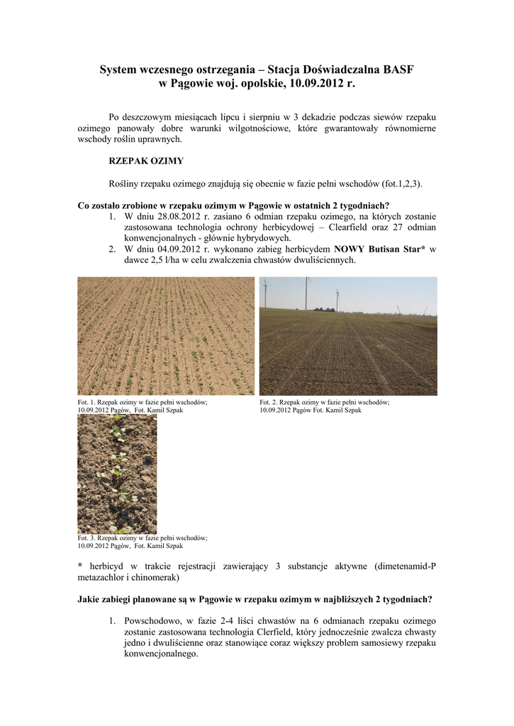 System wczesnego ostrzegania – Stacja Doświadczalna BASF w Pągowie woj. opolskie, 10.09.2012 r. Po deszczowym miesiącach lipcu i sierpniu w 3 dekadzie podczas siewów rzepaku ozimego panowały dobre warunki wilgotnościowe, które gwarantowały równomierne wschody roślin uprawnych. RZEPAK OZIMY Rośliny rzepaku ozimego znajdują się obecnie w fazie pełni wschodów (fot.1,2,3). Co zostało zrobione w rzepaku ozimym w Pągowie w ostatnich 2 tygodniach? 1. W dniu 28.08.2012 r. zasiano 6 odmian rzepaku ozimego, na których zostanie zastosowana technologia ochrony herbicydowej – Clearfield oraz 27 odmian konwencjonalnych - głównie hybrydowych. 2. W dniu 04.09.2012 r. wykonano zabieg herbicydem NOWY Butisan Star* w dawce 2,5 l/ha w celu zwalczenia chwastów dwuliściennych. Fot. 1. Rzepak ozimy w fazie pełni wschodów; 10.09.2012 Pągów, Fot. Kamil Szpak Fot. 2. Rzepak ozimy w fazie pełni wschodów; 10.09.2012 Pągów Fot. Kamil Szpak Fot. 3. Rzepak ozimy w fazie pełni wschodów; 10.09.2012 Pągów, Fot. Kamil Szpak * herbicyd w trakcie rejestracji zawierający 3 substancje aktywne (dimetenamid-P metazachlor i chinomerak) Jakie zabiegi planowane są w Pągowie w rzepaku ozimym w najbliższych 2 tygodniach? 1. Powschodowo, w fazie 2-4 liści chwastów na 6 odmianach rzepaku ozimego zostanie zastosowana technologia Clerfield, który jednocześnie zwalcza chwasty jedno i dwuliścienne oraz stanowiące coraz większy problem samosiewy rzepaku konwencjonalnego. 2. Optymalne warunki wilgotnościowe sprzyjają wschodom samosiewów zbóż (fot.4), dlatego na pozostałych konwencjonalnych odmianach rzepaku ozimego, w fazie 2-3 liści właściwych rzepaku ozimego zostanie zastosowany herbicyd Focus Ultra 100 EC w dawce 1,0-1,5 l/ha. Fot. 4. Wschody samosiewów zbóż w rzepaku ozimym; 07.09.2012 Pągów, Fot. Kamil Szpak 3. W przypadku wystąpienia szkodników tj. pchełka rzepakowa, tantniś krzyżowiaczek, gnatarz rzepakowiec, zastosowany zostanie insektycyd Fastac 100 EC w dawce 0,1 l/ha. 4. Panujące dość wysokie temperatury sprzyjają żerowaniu szkodników glebowych takich jak rolnice. 5. Kiedy rzepak ozimy osiągnie fazę od 4 do 6 liści właściwych zastosowany zostanie wyjątkowy fungicyd o działaniu regulatora wzrostu Caryx 240 SL. Produkt ten stosujemy w dawce 0,7-1,0 l/ha. Pełną dawkę Caryxu, czyli 1,0 l/ha, zaleca się na plantacjach intensywnie rosnących (np. odmiany mieszańcowe) oraz podatnych na choroby. Natomiast redukcja dawki do 0,7 l/ha możliwa jest na plantacjach o mniejszym wigorze wzrostu (np. odmiany półkarłowe) oraz mniej podatnych na choroby grzybowe. Caryx 240 SL stosowany w okresie jesiennym działa z podwójną siłą. Z jednej strony jako regulator wzrostu (poprawa zimotrwałości), a z drugiej jako fungicyd (zwalcza suchą zgniliznę kapustnych oraz pozostałe choroby występujące w okresie jesiennym). Poprawa zimotrwałości polega na ograniczeniu nadmiernego wzrostu pędu głównego, głębokim osadzeniu stożka wzrostu oraz silnym rozwojem systemu korzeniowego (zwiększenie średnicy szyjki korzeniowej i masy korzeni). ZBOŻA OZIME Trwają przygotowania pól do siewu oraz zaprawianie materiału siewnego. Co zostało zrobione na polu pod zboża ozime w Pągowie w ostatnich 2 tygodniach? 1. Wykonano drugi raz zabieg agregatem uprawowym w celu zniszczenia samosiewów rzepaku ozimego, które mogły nadmiernie osuszyć glebę (fot.4 i fot.5). 2. Wysiano nawozy fosforowo-potasowe: Korn - Kali 2,0 q/ha -80 kg/ha K2O, 12 kg/ha MgO, 6 kg/ha Na, 8 kg/ha S Fosforan amonu 1,5 q/ha - 69 kg/ha, P2O5, 27 kg/ha N Fot. 5. Zniszczone samosiewy rzepaku przez agregat uprawowy 07.09.2012r. Pągów Fot. Kamil Szpak Fot. 6. Zniszczone samosiewy rzepaku przez agregat uprawowy 07.09.2012r. Pągów Fot. Kamil Szpak Jakie zabiegi planowane są w Pągowie w pszenicy ozimej w najbliższych 2 tygodniach? 1. Orka z wałem z wałem Campbella oraz staranna uprawa roli do siewu 2. Zaprawianie ziarna zbóż ozimych - do siewu stosujemy kwalifikowany materiał siewny. Do zaprawiania materiału siewnego (wszystkie zboża ozime) zastosujemy doskonałą zaprawę Kinto Duo 080 FS. Zaprawa ta charakteryzuje się bardzo wysoką skutecznością zwalczania m.in. pleśni śniegowej oraz fuzarioz. Dodatkowo formulacja tej zaprawy zapewnia bardzo dobre pokrycie i wybarwienie, a także minimalne pylenie zaprawionych nasion. Dawki na 100 kg ziarna dla poszczególnych gatunków: - jęczmień ozimy – 250 ml; - pszenica ozima – 200 ml - pszenżyto ozime – 200 ml - żyto ozime – 150 ml Jockey New 113 FS – to zaprawa o jeszcze lepszych właściwościach ograniczających infekcję chorób podstawy źdźbła w tym zgorzeli podstawy źdźbła, która dodatkowo ogranicza jeszcze rozwój chorób liści tj. mączniak prawdziwy zbóż, rdza brunatna w początkowym okresie wzrostu rośliny uprawnej. Dawka tej zaprawy wynosi 750 ml/100 kg ziarna. Autorzy: dr Paweł Kazikowski, tel. 0601 759 950 Kamil Szpak, tel. 0601 806 525