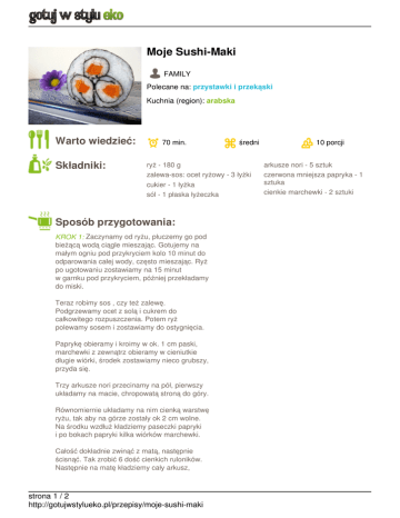 Moje Sushi-Maki FAMILY Polecane na: przystawki i przekąski Kuchnia (region): arabska Warto wiedzieć: Składniki: 70 min. średni ryż - 180 g zalewa-sos: ocet ryżowy - 3 łyżki cukier - 1 łyżka sól - 1 płaska łyżeczka Sposób przygotowania: KROK 1: Zaczynamy od ryżu, płuczemy go pod bieżącą wodą ciągle mieszając. Gotujemy na małym ogniu pod przykryciem kolo 10 minut do odparowania całej wody, często mieszając. Ryż po ugotowaniu zostawiamy na 15 minut w garnku pod przykryciem, później przekładamy do miski. Teraz robimy sos , czy też zalewę. Podgrzewamy ocet z solą i cukrem do całkowitego rozpuszczenia. Potem ryż polewamy sosem i zostawiamy do ostygnięcia. Paprykę obieramy i kroimy w ok. 1 cm paski, marchewki z zewnątrz obieramy w cieniutkie długie wiórki, środek zostawiamy nieco grubszy, przyda się. Trzy arkusze nori przecinamy na pół, pierwszy układamy na macie, chropowatą stroną do góry. Równomiernie układamy na nim cienką warstwę ryżu, tak aby na górze zostały ok 2 cm wolne. Na środku wzdłuż kładziemy paseczki papryki i po bokach papryki kilka wiórków marchewki. Całość dokładnie zwinąć z matą, następnie ścisnąć. Tak zrobić 6 dość cienkich ruloników. Następnie na matę kładziemy cały arkusz, strona 1 / 2 http://gotujwstylueko.pl/przepisy/moje-sushi-maki 10 porcji arkusze nori - 5 sztuk czerwona mniejsza papryka - 1 sztuka cienkie marchewki - 2 sztuki rozprowadzamy na nim cienką warstwę ryżu. Na arkusz w małych odstępach kładziemy trzy ruloniki, przerwy wypełniamy ryżem, na środkowy rulonik nakładamy zostawiony grubszy środek z marchewki. Całość zwijamy. Tak też postępujemy z drugim arkuszem. Potem rulony kroimy na 6-7 części. strona 2 / 2 http://gotujwstylueko.pl/przepisy/moje-sushi-maki Powered by TCPDF (www.tcpdf.org)