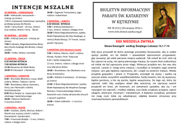 29 SIERPNIA – PONIEDZIAŁEK 6:30 + Aleksander Januszewski – miesiąc po śmierci 7:00 O uratowanie małżeństwa i pomyślny przebieg sprawy dla Renaty 18:00 + Jerzy Kocoł – 10 rocz. śmierci oraz rodzice: Antoni i Anna Banaś 30 SIERPNIA - WTOREK 6:30 + Andrzej Sawczuk – miesiąc po śmierci 7:00 O zdrowie, błogosławieństwo Boże, dary Ducha świętego dla Renaty z okazji urodzin 18:00 + Feliks, Helena i Jarosław 31 SIERPNIA - ŚRODA 6:30 WOLNA INTENCJA 7:00 WOLNA INTENCJA 17:30 Nowenna do Matki Bożej 18:00 W intencjach z Nowenny 1 WRZEŚNIA– CZWARTEK 6:30 + Bronisław Błażewicz, Łucja, Adolf, Juliana, Wiktor, Tadeusz i Janina 7:00 + Bronisława, Maria, Kazimierz, Anna, Jan i Romuald z rodziny Kondratowiczów 8:00 Msza Święta na rozpoczęcie roku szkolnego i katechetycznego 18:00 + Mariusz Radomski – 5 rocznica śmierci 2 WRZEŚNIA - PIĄTEK 6:30 + Czesław, Józefa, Mariusz, Robert i Marek oraz wszyscy zmarli z rodziny Domańskich i Semborskich 7:00 + Franciszek Butajło – 2 rocz. śmierci, rodzice z obojga stron 18:00 + Zygmunt Tomasiewicz, jego rodzice i rodzeństwo 3 WRZEŚNIA – SOBOTA 6:30 WOLNA INTENCJA 7:00 + Andrzej Stankiewicz – 3 rocz. śmierci, rodzice z obojga stron 18:00 O Boże błogosławieństwo, opiekę Matki Najświętszej dla Ojca Świętego, w intencji Radia Maryja, TV Trwam, naszej parafii i Ojczyzny BIULETYN INFORMACYJNY PARAFII ŚW. KATARZYNY W KĘTRZYNIE NR 30 (431) 28 sierpnia 2016 r. www.swk.olsztyn.opoka.org.pl XXII NIEDZIELA ZWYKŁA Słowa Ewangelii według Świętego Łukasza 14,1.7-14 4 WRZEŚNIA XXIII Niedziela Zwykła 7:00 + Helena, Marian, Józef z rodziny Klimek, Paulina i Piotr Tokarczyk 8:30 + Stefan Kobylański – 13 rocz. śmierci, rodzice z obojga stron oraz Marianna Wołos 10:00 + Bronisława i Jan Obolewicz oraz Anna Anisimowicz 11:30 + Elżbieta Frankiewicz – 8 miesięcy po śmierci 13:00 O Boże błogosławieństwo i opiekę Matki Najświętszej dla Wspólnot Żywego Różańca i Franciszkańskiego Zakonu Świeckich oraz o łaskę zdrowia dla chorych z naszych wspólnot 18:00 + Edwin Jabłoński – 1 rocznica śmierci Gdy Jezus przyszedł do domu pewnego przywódcy faryzeuszów, aby w szabat spożyć posiłek, oni Go śledzili. I opowiedział zaproszonym przypowieść, gdy zauważył, jak sobie pierwsze miejsca wybierali. Tak mówił do nich: Jeśli cię kto zaprosi na ucztę, nie zajmuj pierwszego miejsca, by czasem ktoś znakomitszy od ciebie nie był zaproszony przez niego. Wówczas przyjdzie ten, kto was obu zaprosił, i powie ci: Ustąp temu miejsca; i musiałbyś ze wstydem zająć ostatnie miejsce. Lecz gdy będziesz zaproszony, idź i usiądź na ostatnim miejscu. Wtedy przyjdzie gospodarz i powie ci: Przyjacielu, przesiądź się wyżej; i spotka cię zaszczyt wobec wszystkich współbiesiadników. Każdy bowiem, kto się wywyższa, będzie poniżony, a kto się poniża, będzie wywyższony. Do tego zaś, który Go zaprosił, rzekł: Gdy wydajesz obiad albo wieczerzę, nie zapraszaj swoich przyjaciół ani braci, ani krewnych, ani zamożnych sąsiadów, aby cię i oni nawzajem nie zaprosili, i miałbyś odpłatę. Lecz kiedy urządzasz przyjęcie, zaproś ubogich, ułomnych, chromych i niewidomych. A będziesz szczęśliwy, ponieważ nie mają czym tobie się odwdzięczyć; odpłatę bowiem otrzymasz przy zmartwychwstaniu sprawiedliwych. BOGACZ DUCHOWY? „Nie Wobec spektakularnego charakteru różnych akcji i rozgłosu, który próbują z d o b yć so b ie lud z ie u d ający społeczników, a także hałasu, jaki towarzyszy wszystkiemu, co chce się przebić, wielu wierzących pyta: co ja mogę zrobić dla ewangelizacji? W jaki sposób służyć Chrystusowi i Kościołowi, mając do dyspozycji „wdowi grosz”? Na te pytania otrzymujemy dziś odpowiedź: „Synu, z łagodnością wykonuj swe sprawy, a każdy, kto jest prawy, będzie cię miłował” (I czytanie). Chrystus uczy pokory. Świat zmieniają nie krzykacze, kolorowe reklamy, wielkie imprezy, ale święci, ludzie o wielkim duchowym formacie. Na wzór Chrystusa „cisi i pokornego serca”, zawsze i wszędzie będący sobą, żyjący według zasad ewangelicznych, modlący się „w swej izdebce”, ich „lewa ręka nie wie, co daje prawa”. Niestety, „na chorobę pyszałka nie ma lekarstwa” – przestrzega Syracydes. Brońmy się przed tą niebezpieczną chorobą za pomocą „rozumnego serca” (I czytanie). Warto zapamiętać słowa Maxa Schellera: „Pokora otwiera spojrzenie duchowe na wszystkie wartości tego świata. Pokorny staje się duchowym bogaczem”. Dietrich von Hildebrand napisał: „Pokora jest nie tylko warunkiem autentyczności i prawdziwości wszystkich cnót, lecz także warunkiem przemienienia w Jezusie. Ale ma ona w sobie samej wysoką wartość, nadaje człowiekowi szczególne piękno”. Kard. George Basil Hume powiedział wprost: „Pokora jest fundamentem życia duchowego, bo stanowi jego początek”. Zechciejmy mieć to na uwadze w naszej codzienności. Parafia p.w. św. Katarzyny ul. Powstańców Warszawy 5 11-400 Kętrzyn Parafia (89) 753-19-60 ks. Proboszcz (0-89) 753-19-64 ks. Mariusz (0-89) 753-19-66 ks. Zbigniew (0-89) 753-19-63 Kancelaria Parafialna tel. (89) 753-19-70 poniedziałek, wtorek, środa 9:00 - 12:00 czwartek, piątek, sobota 14:00 - 17:00 Konto Bankowe Bank Millenium 10 1160 2202 0000 0001 7117 0704 Taca: Ofiary składane na tacę przeznaczamy na Seminarium Duchowne w Olsztynie. 1. W ubiegłym tygodniu odeszli do wieczności Adam Wtulich i Stanisław Naływajko. Módlmy się w intencji zmarłych, którzy oczekują naszej pomocy – wieczny odpoczynek racz im dać Panie… 2. To już ostatnia wakacyjna niedziela. Cieszmy się z ostatnich wolnych dni, ze sprzyjającej pogody. Wykorzystajmy je, aby nabrać sił do codziennych obowiązków w nowym roku szkolnym i katechetycznym. 3. W czwartek, 1 września, dzieci i młodzież rozpoczynają nowy rok szkolny. Zatroszczmy się, by rozpoczęły g
