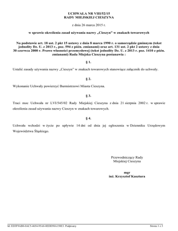 UCHWAŁA NR VIII/52/15 RADY MIEJSKIEJ CIESZYNA z dnia 26 marca 2015 r. w sprawie określenia zasad używania nazwy „Cieszyn” w znakach towarowych Na podstawie art. 18 ust. 2 pkt 15 ustawy z dnia 8 marca 1990 r. o samorządzie gminnym (tekst jednolity Dz. U. z 2013 r., poz. 594 z późn. zmianami) oraz art. 131 ust. 2 pkt 2 ustawy z dnia 30 czerwca 2000 r. Prawo własności przemysłowej (tekst jednolity Dz. U. z 2013 r. poz. 1410 z późn. zmianami) Rada Miejska Cieszyna postanawia : § 1. Ustalić zasady używania nazwy „Cieszyn” w znakach towarowych stanowiące załącznik do uchwały. § 2. Wykonanie Uchwały powierzyć Burmistrzowi Miasta Cieszyna. § 3. Traci moc Uchwała nr LVI/545/02 Rady Miejskiej Cieszyna z dnia 21 sierpnia 2002 r. w sprawie określenia zasad używania nazwy Cieszyn w znakach towarowych. § 4. Uchwała wchodzi w życie po upływie 14 dni od dnia jej ogłoszenia w Dzienniku Urzędowym Województwa Śląskiego. Przewodniczący Rady Miejskiej Cieszyna mgr inż. Krzysztof Kasztura Id: ED3F9AB8-0AC5-4654-95A8-8EDD50A150E3. Podpisany Strona 1 z 3 Załącznik do Uchwały Nr VIII/52/15 Rady Miejskiej Cieszyna z dnia 26 marca 2015 r. Zasady używania nazwy "Cieszyn" w znakach towarowych 1. O zgodę na używania nazwy „Cieszyn” w formie rzeczownikowej i przymiotnikowej w znakach towarowych mogą ubiegać się podmioty mające swą siedzibę bądź prowadzące działalność gospodarczą lub inną działalność w granicach administracyjnych Powiatu Cieszyńskiego. 2. Pisemny wniosek podmiotu musi zawierać: a) nazwę i siedzibę wnioskodawcy, b) opis wnioskodawcy i jego działalności, c) wskazanie towarów, dla których znak towarowy jest przeznaczony, d) wskazanie celu, zakresu i sposobu korzystania ze znaku towarowego, e) klas towarów lub usług, dla których ma być dokonane lub zostało dokonane zgłoszenie znaku towarowego do Urzędu Patentowego Rzeczpospolitej Polskiej, f) określenie znaku towarowego. 3. Określenie znaku towarowego, w zależności od jego rodzaju polega na: a) dołączeniu projektu graficznego - jeśli jest napisem, rysunkiem lub kompozycją kolorystyczną wraz z opisem - jeśli samo przedstawienie graficzne nie jest wystarczające, b) dołączeniu rysunku lub rysunków przedstawiających znak - jeśli znak towarowy ma formę przestrzenną, lub kilku rysunków - gdy jego cechy wyróżniające znajdują się na różnych płaszczyznach, c) wyrażeniu pośrednio przez zapis graficzny, pozwalający na odtworzenie (słowa, nuty, litery obrazujące dźwięki artykułowane) - jeśli znak nie nadaje się do bezpośredniego graficznego przedstawienia, d) dołączeniu w opisie znaku tłumaczenia na język polski – jeśli w znaku zawarte są słowa obcojęzyczne, e) dołączeniu transliteracji na litery alfabetu łacińskiego i cyfry arabskie i rzymskie – jeśli w znaku towarowym użyto liter innego alfabetu niż łaciński lub cyfr innych niż arabskie i rzymskie. 4. Zgody na użycie nazwy „Cieszyn” udziela Burmistrz Miasta Cieszyna w formie zarządzenia. 5. Zgodę wydaje się na czas obejmujący okres udzielonej ochrony na znak towarowy podmiotu uprawnionego. 6. Nazwa „Cieszyn” nie może być używana w sposób godzący w dobre imię i wizerunek miasta, ani w sposób mogący prowadzić do deprecjacji nazwy lub obniżenia prestiżu Miasta Cieszyna. 7. Nazwa „Cieszyn” może być używana jeśli : a) znak towarowy nie narusza praw osobistych lub majątkowych osób trzecich, b) nie jest to sprzeczne z porządkiem publicznym, dobrymi obyczajami lub zasadami współżycia społecznego; c) nie narusza to tradycji narodowej, lokalnej oraz innych wartości identyfikujących Miasto Cieszyn, d) przyczynia się to do utrwalenia i rozpowszechniania wizerunku Miasta Cieszyna, w szczególności w zakresie kultury, dziedzictwa narodowego i zabytków, turystyki, sportu, edukacji i innych dziedzin życia społecznego. Id: ED3F9AB8-0AC5-4654-95A8-8EDD50A150E3. Podpisany Strona 1 z 3 8. Cofnięcie zgody nastąpi w przypadku stwierdzenia użycia nazwy „Cieszyn” w znaku towarowym w sposób inny niż wskazany w zarządzeniu o jej udzieleniu. 9. Postępowanie wbrew zasadom traktowane będzie jako naruszenie dóbr osobistych Miasta Cieszyna. Id: ED3F9AB8-0AC5-4654-95A8-8EDD50A150E3. Podpisany Strona 2 z 3