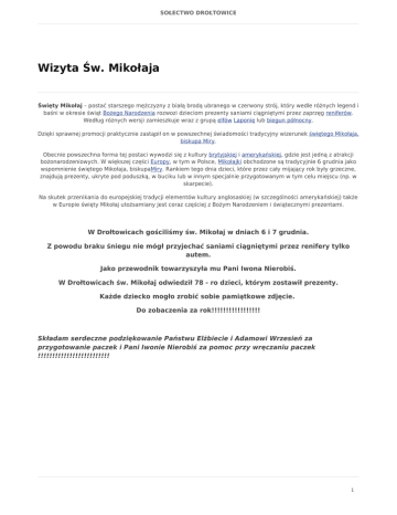 SOŁECTWO DROŁTOWICE Wizyta Św. Mikołaja Święty Mikołaj – postać starszego mężczyzny z białą brodą ubranego w czerwony strój, który wedle różnych legend i baśni w okresie świąt Bożego Narodzenia rozwozi dzieciom prezenty saniami ciągniętymi przez zaprzęg reniferów. Według różnych wersji zamieszkuje wraz z grupą elfów Laponię lub biegun północny. Dzięki sprawnej promocji praktycznie zastąpił on w powszechnej świadomości tradycyjny wizerunek świętego Mikołaja, biskupa Miry. Obecnie powszechna forma tej postaci wywodzi się z kultury brytyjskiej i amerykańskiej, gdzie jest jedną z atrakcji bożonarodzeniowych. W większej części Europy, w tym w Polsce, Mikołajki obchodzone są tradycyjnie 6 grudnia jako wspomnienie świętego Mikołaja, biskupaMiry. Rankiem tego dnia dzieci, które przez cały mijający rok były grzeczne, znajdują prezenty, ukryte pod poduszką, w buciku lub w innym specjalnie przygotowanym w tym celu miejscu (np. w skarpecie). Na skutek przenikania do europejskiej tradycji elementów kultury anglosaskiej (w szczególności amerykańskiej) także w Europie święty Mikołaj utożsamiany jest coraz częściej z Bożym Narodzeniem i świątecznymi prezentami. W Drołtowicach gościliśmy św. Mikołaj w dniach 6 i 7 grudnia. Z powodu braku śniegu nie mógł przyjechać saniami ciągniętymi przez renifery tylko autem. Jako przewodnik towarzyszyła mu Pani Iwona Nierobiś. W Drołtowicach św. Mikołaj odwiedził 78 - ro dzieci, którym zostawił prezenty. Każde dziecko mogło zrobić sobie pamiątkowe zdjęcie. Do zobaczenia za rok!!!!!!!!!!!!!!!!! Składam serdeczne podziękowanie Państwu Elżbiecie i Adamowi Wrzesień za przygotowanie paczek i Pani Iwonie Nierobiś za pomoc przy wręczaniu paczek !!!!!!!!!!!!!!!!!!!!!!!!! 1
