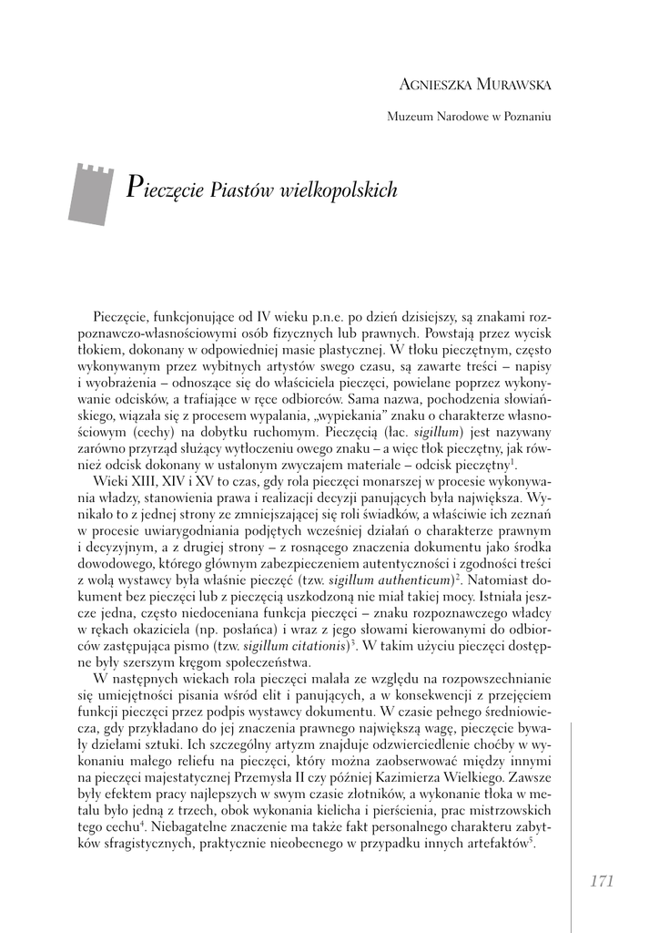 AGNIESZKA MURAWSKA Muzeum Narodowe w Poznaniu Piecz´cie Piastów wielkopolskich Piecz´cie, funkcjonujàce od IV wieku p.n.e. po dzieƒ dzisiejszy, sà znakami rozpoznawczo-w∏asnoÊciowymi osób fizycznych lub prawnych. Powstajà przez wycisk t∏okiem, dokonany w odpowiedniej masie plastycznej. W t∏oku piecz´tnym, cz´sto wykonywanym przez wybitnych artystów swego czasu, sà zawarte treÊci – napisy i wyobra˝enia – odnoszàce si´ do w∏aÊciciela piecz´ci, powielane poprzez wykonywanie odcisków, a trafiajàce w r´ce odbiorców. Sama nazwa, pochodzenia s∏owiaƒskiego, wiàza∏a si´ z procesem wypalania, „wypiekania” znaku o charakterze w∏asnoÊciowym (cechy) na dobytku ruchomym. Piecz´cià (∏ac. sigillum) jest nazywany zarówno przyrzàd s∏u˝àcy wyt∏oczeniu owego znaku – a wi´c t∏ok piecz´tny, jak równie˝ odcisk dokonany w ustalonym zwyczajem materiale – odcisk piecz´tny1. Wieki XIII, XIV i XV to czas, gdy rola piecz´ci monarszej w procesie wykonywania w∏adzy, stanowienia prawa i realizacji decyzji panujàcych by∏a najwi´ksza. Wynika∏o to z jednej strony ze zmniejszajàcej si´ roli Êwiadków, a w∏aÊciwie ich zeznaƒ w procesie uwiarygodniania podj´tych wczeÊniej dzia∏aƒ o charakterze prawnym i decyzyjnym, a z drugiej strony – z rosnàcego znaczenia dokumentu jako Êrodka dowodowego, którego g∏ównym zabezpieczeniem autentycznoÊci i zgodnoÊci treÊci z wolà wystawcy by∏a w∏aÊnie piecz´ç (tzw. sigillum authenticum)2. Natomiast dokument bez piecz´ci lub z piecz´cià uszkodzonà nie mia∏ takiej mocy. Istnia∏a jeszcze jedna, cz´sto niedoceniana funkcja piecz´ci – znaku rozpoznawczego w∏adcy w r´kach okaziciela (np. pos∏aƒca) i wraz z jego s∏owami kierowanymi do odbiorców zast´pujàca pismo (tzw. sigillum citationis)3. W takim u˝yciu piecz´ci dost´pne by∏y szerszym kr´gom spo∏eczeƒstwa. W nast´pnych wiekach rola piecz´ci mala∏a ze wzgl´du na rozpowszechnianie si´ umiej´tnoÊci pisania wÊród elit i panujàcych, a w konsekwencji z przej´ciem funkcji piecz´ci przez podpis wystawcy dokumentu. W czasie pe∏nego Êredniowiecza, gdy przyk∏adano do jej znaczenia prawnego najwi´kszà wag´, piecz´cie bywa∏y dzie∏ami sztuki. Ich szczególny artyzm znajduje odzwierciedlenie choçby w wykonaniu ma∏ego reliefu na piecz´ci, który mo˝na zaobserwowaç mi´dzy innymi na piecz´ci majestatycznej Przemys∏a II czy póêniej Kazimierza Wielkiego. Zawsze by∏y efektem pracy najlepszych w swym czasie z∏otników, a wykonanie t∏oka w metalu by∏o jednà z trzech, obok wykonania kielicha i pierÊcienia, prac mistrzowskich tego cechu4. Niebagatelne znaczenie ma tak˝e fakt personalnego charakteru zabytków sfragistycznych, praktycznie nieobecnego w przypadku innych artefaktów5. 171 Piecz´cie Piastów wielkopolskich Piecz´ç herbowa z lwem, zdj´cie z oryginalnego odcisku przy dokumencie Przemys∏a II z 1289 r. (sygn. 15), ze zbiorów Archiwum Paƒstwowego w Bydgoszczy, fot. K. Klapka. 172 W tym te˝ kontekÊcie nale˝y interpretowaç funkcje i charakter piecz´ci ostatnich Piastów wielkopolskich. Z dzisiejszego natomiast punktu widzenia piecz´cie, ich odciski i odlewy sà niezastàpionym êród∏em poznania i uzupe∏niania naszej wiedzy o przesz∏oÊci, zw∏aszcza wieku XIII, kiedy to inne êród∏a pisane i ikonograficzne sà stosunkowo skromnie reprezentowane. Zwyczajem kancelarii wielkopolskich tego czasu by∏o u˝ywanie odcisków w wosku naturalnego koloru, jedynie odciski piecz´ci majestatycznej Przemys∏a II sà koloru ceglastoczerwonego. By∏y to wy∏àcznie piecz´cie okràg∏e (poza contrasigillum, przy tworzeniu którego skorzystano z pod∏u˝nie owalnego antycznego intaglio), o Êrednicach mi´dzy 26 a 90 mm. Za bezpieczeƒstwo i w∏aÊciwe u˝ycie piecz´ci odpowiada∏ kanclerz (cancellarius), natomiast odciskania dokonywa∏ ni˝szy rangà piecz´tarz (signator)6 lub gdy kancelaria nie by∏a liczna, notariusz odpowiadajàcy za sformu∏owanie i napisanie dokumentu7. Nie sà znani wykonawcy t∏oków piecz´tnych z tego czasu. Mo˝na domniemywaç, ˝e byli to zarówno rzemieÊlnicy miejscowi, jak i obcy. Tu przyk∏adem jest piecz´ç majestatyczna Przemys∏a II, zapewne zamówiona poza granicami kraju, byç mo˝e na W´grzech8, choç jej program ideowy musia∏ si´ narodziç tu, w Wielkopolsce9. Piecz´ciami opatrywano „wygotowany” dokument, przywieszajàc na wiàzadle wykonanym z jedwabnych sznurków przeciàgni´tych przez specjalnie wykonane otwory w tzw. plice – zagi´ciu pergaminu u do∏u dokumentu. Dwaj ostatni m´scy przedstawiciele wielkopolskiej linii Piastów10 ∏àcznie pozostawili po sobie 10 piecz´ci ró˝nych pod wzgl´dem ikonograficznym typów. Licznà grup´ stanowià piecz´cie portretowe (piesze, konne) i majestatyczna (6 t∏oków); oprócz nich znamy trzy herbowe i jednà powsta∏à z wykorzystaniem antycznego intaglio. Synowie W∏adys∏awa Odonica – Przemys∏ I i Boles∏aw Pobo˝ny – w pierwszych latach swych rzàdów nie mieli ani w∏asnej kancelarii, ani w∏asnych piecz´ci, a wszystkie wtedy powsta∏e u odbiorców dokumenty opatrywali piecz´ciami ojca i stryja – W∏adys∏awa Laskonogiego. Ka˝dy taki fakt by∏ odnotowany w formule koroboracyjnej dokumentu, cz´sto z zastrze˝eniem przywieszenia w∏aÊciwej piecz´ci w czasie póêniejszym11. Pierwsze u˝ycie piecz´ci wykonanej dla Przemys∏a I jest poÊwiadczone dokumentem z 25 lutego 1247 roku, jednak badacz kancelarii Piastów wielkopolskich F. Sikora czas powstania pierwszej piecz´ci w∏asnej datuje na rok 1243, wià˝àc to z uzyskaniem Piecz´ç z tarczà z or∏em i tytu∏em ET CRA, zdj´cie z oryginalnego odcisku zamieszczonego przy dokumencie Przemys∏a II dotyczàcego lokacji m.in. Mieczewa, wystawionego w Karminie w 1294 r. (Dokumenty wiejskie – zbiór sygn. 18/pergamin + piecz´ç wielka Przemys∏a II), ze zbiorów Archiwum