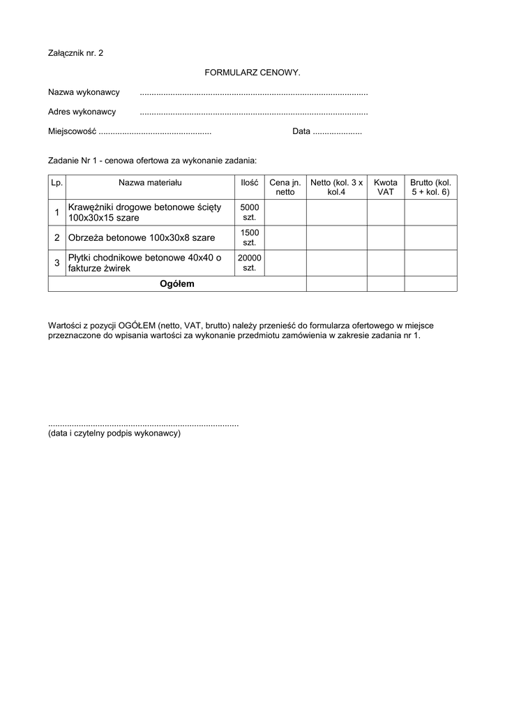 Załącznik nr. 2 FORMULARZ CENOWY. Nazwa wykonawcy ................................................................................................. Adres wykonawcy ................................................................................................. Miejscowość ................................................ Data ..................... Zadanie Nr 1 - cenowa ofertowa za wykonanie zadania: Lp. 1 Nazwa materiału Ilość Krawężniki drogowe betonowe ścięty 100x30x15 szare Płytki chodnikowe betonowe 40x40 o fakturze żwirek Netto (kol. 3 x kol.4 Kwota VAT Brutto (kol. 5 + kol. 6) 5000 szt. 1500 szt. 2 Obrzeża betonowe 100x30x8 szare 3 Cena jn. netto 20000 szt. Ogółem Wartości z pozycji OGÓŁEM (netto, VAT, brutto) należy przenieść do formularza ofertowego w miejsce przeznaczone do wpisania wartości za wykonanie przedmiotu zamówienia w zakresie zadania nr 1. ................................................................................. (data i czytelny podpis wykonawcy)