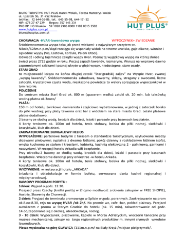 BIURO TURYSTYKI HUT-PLUS Marek Wolak, Teresa Manterys-Wolak ul. Ujastek 5b, 31-752 Kraków tel/fax: 12 644-36-86, tel. 643-55-98, 644-17- 52 NIP: 678 27 47 229 Regon: 357 145 331 PKO BP II O/Kraków 59 1020 2906 0000 1102 0015 3502 www.hutplus.com.pl [email protected] CHORWACJA -HVAR-lawendowa wyspa WYPOCZYNEK+ ZWIEDZANIE Śródziemnomorska wyspa taka jak przed wiekami- z najwyższym szczytem sv. Nikola/628m.n.p.m/skąd rozciąga się wspaniały widok na strome urwiska, gaje oliwne, winnice i sąsiednie wyspy (Vis, Lastovo, Korčula, Paleni Otoci). Odwiedź i odkryj tajemnicze zakątki wyspy Hvar. Poznaj tę wyjątkową wyspę na której słońce świeci przez 2715 godzin w roku. Poczuj zapach lawendy, rozmarynu. Wyrusz na wyprawę dawno zapomnianymi szlakami i poznaj ukryte w głębi wyspy, niedostępne, stare osady. STARI GRAD to miejscowość leżąca na końcu długiej zatoki “Starigradskij zaljev” na Wyspie Hvar, zwanej „wyspą lawendy”. Śródziemnomorska zabudowa, tawerny, sklepy, stragany z owocami, liczne zatoczki, kryształowo czysta woda, nieskażone powietrze to walory sprzyjające wypoczynkowi w tym rejonie. POŁOŻENIE Do centrum miasta Stari Grad ok. 800 m (spacerem wzdłuż zatoki ok. 20 min. lub taksówką wodną-płatna ok.3euro/ PLAŻA: 150 m od hotelu, żwirkowo -kamienista i częściowo wybetonowana, w jednej z zatoczek boisko do piłki wodnej; przy plaży tawerna oraz bar z widokiem na stare miasto Grad. Leżaki plażowe płatne dodatkowo. 2 baseny ze słodką wodą, brodzik dla dzieci, leżaki i parasole przy basenach bezpłatnie. 4 korty tenisowe ok. 100m od hotelu, tenis stołowy, boiska do piłki nożnej, siatkówki i koszykówki, klub dla dzieci. ZAKWATEROWANIE:BUNGALOWY HELIOS WYPOSAŻENIE: parterowe budynki z tarasem o standardzie turystycznym, usytuowane miedzy drzewami piniowymi; sypialnia z dwoma łóżkami, pokój dzienny z rozkładanym łóżkiem (sofa), wnęka kuchenna ze stołem i krzesłami, lodówką, kuchnią elektryczną 2 - palnikową, garnkami i naczyniami. W recepcji hotelu Arkadia wifi bezpłatnie. Przy ośrodku:2 baseny ze słodką wodą, brodzik dla dzieci, leżaki i parasole przy basenach bezpłatnie. Wieczorne dancingi przy orkiestrze -w hotelu Arkada. 4 korty tenisowe ok. 100m od hotelu, tenis stołowy, boiska do piłki nożnej, siatkówki i koszykówki, klub dla dzieci. WYŻYWIENIE: w restauracji hotelu „ARKADA” śniadania i obiadokolacje w formie bufetu, serwowane dania kuchni regionalnej i międzynarodowej. RAMOWY PROGRAM POBYTU : 1dzień: Wyjazd o godz. 12:30. Przejazd przez Czechy (krótki postój w Znojmo możliwość zrobienia zakupów w FREE SHOPIE), Austrię, Słowenię do Chorwacji. 2 dzień: Przyjazd do terminalu promowego w Splicie w godz. porannych. Zaokrętowanie na prom ok.8.oo-8.30, rejs na wyspę HVAR /ok 2h/. Na promie wc, cafe -bar, pokład plażowy. Przejazd autokarem z promu w Starym Gradzie do hotelu (ok. 15 min), zakwaterowanie od godz. 14.oo,zapoznanie się z okolicą, obiadokolacja, nocleg. 3 - 10 dzień: Wypoczynek, plażowanie, kąpiele w Morzu Adriatyckim, wieczorki taneczne przy muzyce mechanicznej, zakupy na targu regionalnych produktów m. innymi słynnych wyrobów lawendowych. Piesza wycieczka na górę GLAWICA /111m.n.p.m/ na Biały Krzyż /miejsce pielgrzymek/. BIURO TURYSTYKI HUT-PLUS Marek Wolak, Teresa Manterys-Wolak ul. Ujastek 5b, 31-752 Kraków tel/fax: 12 644-36-86, tel. 643-55-98, 644-17- 52 NIP: 678 27 47 229 Regon: 357 145 331 PKO BP II O/Kraków 59 1020 2906 0000 1102 0015 3502 www.hutplus.com.pl [email protected] Piesza wycieczka po mieście Stari Grad, wpisanym na listę UNESCO. Pomnik i letnia rezydencja pisarza Petera Hektorovića /pisarza 1487-1572/, muzeum ze starymi murami miasta, Kościoły: św Roka z 1569 r, św. Iwana z XII wieku, św. Stjepana z 1605r klasztor dominikański z 1482r, barokowy rynek SKOR. Wycieczka autokarowa po wyspie HVAR: 4 godz. zwiedzanie miasta HVAR - miasta dla milionerów -wejście na Twierdze Spaniola ,po drodze przepiękna przyroda i roślinność śródziemnomorska -zwiedzanie największego rynku na wyspie Hvar :katedra św Stjepana, Pałac biskupi, Klasztor Franciszkanów, najstarszy teatr w Europie, zabytkowa studnia, Muzeum serwetek z nici agawy/płatne/,przepiękna promenada z najbogatszymi jachtami, 1 godz zwiedzania : VRBOSKA zwana Małą Wenecją-miasta ciszy i spokoju, najmniejsze miasteczko na wyspie HVAR mosty „weneckie” wejście na twierdze -kościołów św. Marii od Miłosierdzia z XVI w Muzeum Rybołóstwa /płatne/. 1 godz zwiedzania:JELSA- chorwacka Madera, gdzie stara budowla miesza się z nowoczesnością: -przepiękny park Perivoj założony w 1870r -kościół NMP z 1331r renesansowe i barokowe kamienice ,plac św. Jana z ośmiokątnym kościółkiem z XVII w -pomnik wody źródlanej -najstarszy hotel Jordan z 1911rWyspa Powrót do hotelu, 11 dzień: Śniadanie, wykwaterowanie, 10:oo wyjazd z hotelu na prom w Starym Gradzie, 11:oo zaokrętowanie na prom, rejs w kierunku Splitu /ok. 2h/. 2h zwiedzanie SPLITU - PAŁAC DOKLECJANA (wpisany na listę UNESCO), zbudowanego na przełomie III i IV w, przejście przez miasto w kierunku pomnika Grzegorza Ninskiego - biskupa Ninu w latach 900-929, ostatnie zakupy na bazarze w Splicie /pamiątki z białego kamienia z wyspy Brać/. W godzinach popołudniowych wyjazd. Przejazd przez Chorwację, Słowenię, Czechy do Polski (po drodze możliwość zatrzymania się na płatny posiłek tranzytowy). 12 dzień: Przyjazd w godzinach rannych. CENA ZAWIERA: transport komfortowym autokarem, prom SPLIT-STARI GRAD-SLPT , 9 noclegów, wyżywienie: śniadania + obiadokolacje, opiekę pilota, opiekę rezydenta, taksę klimatyczną, realizacje programu, ubezpieczenie: KL+ NNW + bagaż, podatek VAT. CENA NIE ZAWIERA: ubezpieczenia od chorób przewlekłych; ubezpieczenia od kosztów rezygnacji z imprezy; dopłaty do połączeń antenowych, wycieczek fakultatywnych ZNIŻKI: osoba dorosła na dostawce: 10%