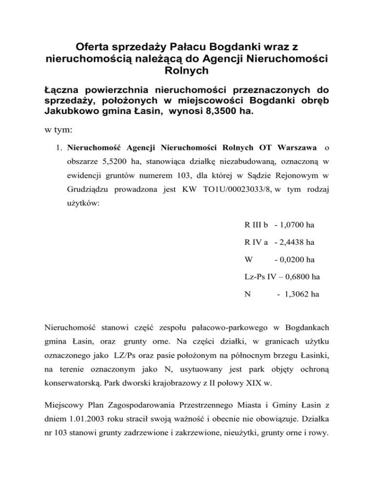 Oferta sprzedaży Pałacu Bogdanki wraz z nieruchomością należącą do Agencji Nieruchomości Rolnych Łączna powierzchnia nieruchomości przeznaczonych do sprzedaży, położonych w miejscowości Bogdanki obręb Jakubkowo gmina Łasin, wynosi 8,3500 ha. w tym: 1. Nieruchomość Agencji Nieruchomości Rolnych OT Warszawa o obszarze 5,5200 ha, stanowiąca działkę niezabudowaną, oznaczoną w ewidencji gruntów numerem 103, dla której w Sądzie Rejonowym w Grudziądzu prowadzona jest KW TO1U/00023033/8, w tym rodzaj użytków: R III b - 1,0700 ha R IV a - 2,4438 ha W - 0,0200 ha Lz-Ps IV – 0,6800 ha N - 1,3062 ha Nieruchomość stanowi część zespołu pałacowo-parkowego w Bogdankach gmina Łasin, oraz grunty orne. Na części działki, w granicach użytku oznaczonego jako LZ/Ps oraz pasie położonym na północnym brzegu Łasinki, na terenie oznaczonym jako N, usytuowany jest park objęty ochroną konserwatorską. Park dworski krajobrazowy z II połowy XIX w. Miejscowy Plan Zagospodarowania Przestrzennego Miasta i Gminy Łasin z dniem 1.01.2003 roku stracił swoją ważność i obecnie nie obowiązuje. Działka nr 103 stanowi grunty zadrzewione i zakrzewione, nieużytki, grunty orne i rowy. Zgodnie ze Studium Uwarunkowań i Kierunków Zagospodarowania Przestrzennego Miasta i Gminy Łasin z dnia 30 grudnia 1999 roku w/w tereny nie zmieniły swojego przeznaczenia. Nieruchomość Stadniny Koni Nowe Jankowice Spółka z o.o. w 2. miejscowości Bogdanki gmina Łasin , nieruchomość zabudowana, oznaczona geodezyjnie jako działka 105/1 o powierzchni 2,83000 ha dla której w Sądzie Rejonowym w Grudziądzu prowadzona jest KW TO1U/00028137/2, w tym rodzaj użytków: LZ – PsIV – 0,2500 ha B – R IV b - 2,5800 ha Nieruchomość stanowiąca działkę nr 105/1 , stanowi część zespołu pałacowoparkowego w Bogdankach gmina Łasin, położona jest przy szosie z Mędrzyc do Łasina. Opis istniejącej zabudowy na działce 105/1 A. zapisano do rejestru zabytków PAŁAC Budynek wolno stojący, częściowo podpiwniczony, z poddaszem użytkowym, złożony z korpusu głównego z Budynek trzykondygnacyjnym ryzalitem na osi głównej, przylegającej do niego w części północno-zachodniej kondygnacyjnej wieży oraz skrzydła bocznego od wschodu. 4 Wyposażony w instalacje – elektryczną, odgromową, wodociągową, kanalizacyjną oraz centralnego ogrzewania z kotłownią olejową w piwnicy i kominem stalowym od strony północnej pałacu. SZPICHLERZ SZKIELETOWY Wolno stojący, dwukondygnacyjny, z poddaszem użytkowym, podpiwniczenia. Wyposażenie w instalacje – energii elektrycznej, odgromowej. bez