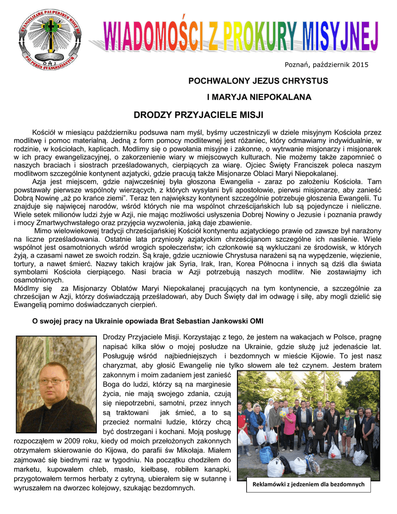 Poznań, październik 2015 POCHWALONY JEZUS CHRYSTUS I MARYJA NIEPOKALANA DRODZY PRZYJACIELE MISJI Kościół w miesiącu październiku podsuwa nam myśl, byśmy uczestniczyli w dziele misyjnym Kościoła przez modlitwę i pomoc materialną. Jedną z form pomocy modlitewnej jest różaniec, który odmawiamy indywidualnie, w rodzinie, w kościołach, kaplicach. Modlimy się o powołania misyjne i zakonne, o wytrwanie misjonarzy i misjonarek w ich pracy ewangelizacyjnej, o zakorzenienie wiary w miejscowych kulturach. Nie możemy także zapomnieć o naszych braciach i siostrach prześladowanych, cierpiących za wiarę. Ojciec Święty Franciszek poleca naszym modlitwom szczególnie kontynent azjatycki, gdzie pracują także Misjonarze Oblaci Maryi Niepokalanej. Azja jest miejscem, gdzie najwcześniej była głoszona Ewangelia - zaraz po założeniu Kościoła. Tam powstawały pierwsze wspólnoty wierzących, z których wysyłani byli apostołowie, pierwsi misjonarze, aby zanieść Dobrą Nowinę „aż po krańce ziemi”. Teraz ten największy kontynent szczególnie potrzebuje głoszenia Ewangelii. Tu znajduje się najwięcej narodów, wśród których nie ma wspólnot chrześcijańskich lub są pojedyncze i nieliczne. Wiele setek milionów ludzi żyje w Azji, nie mając możliwości usłyszenia Dobrej Nowiny o Jezusie i poznania prawdy i mocy Zmartwychwstałego oraz przyjęcia wyzwolenia, jaką daje zbawienie. Mimo wielowiekowej tradycji chrześcijańskiej Kościół kontynentu azjatyckiego prawie od zawsze był narażony na liczne prześladowania. Ostatnie lata przyniosły azjatyckim chrześcijanom szczególne ich nasilenie. Wiele wspólnot jest osamotnionych wśród wrogich społeczeństw; ich członkowie są wykluczani ze środowisk, w których żyją, a czasami nawet ze swoich rodzin. Są kraje, gdzie uczniowie Chrystusa narażeni są na wypędzenie, więzienie, tortury, a nawet śmierć. Nazwy takich krajów jak Syria, Irak, Iran, Korea Północna i innych są dziś dla świata symbolami Kościoła cierpiącego. Nasi bracia w Azji potrzebują naszych modlitw. Nie zostawiajmy ich osamotnionych. Módlmy się za Misjonarzy Oblatów Maryi Niepokalanej pracujących na tym kontynencie, a szczególnie za chrześcijan w Azji, którzy doświadczają prześladowań, aby Duch Święty dał im odwagę i siłę, aby mogli dzielić się Ewangelią pomimo doświadczanych cierpień. O swojej pracy na Ukrainie opowiada Brat Sebastian Jankowski OMI Drodzy Przyjaciele Misji. Korzystając z tego, że jestem na wakacjach w Polsce, pragnę napisać kilka słów o mojej posłudze na Ukrainie, gdzie służę już jedenaście lat. Posługuję wśród najbiedniejszych i bezdomnych w mieście Kijowie. To jest nasz charyzmat, aby głosić Ewangelię nie tylko słowem ale też czynem. Jestem bratem zakonnym i moim zadaniem jest zanieść Boga do ludzi, którzy są na marginesie życia, nie mają swojego zdania, czują się niepotrzebni, samotni, przez innych są traktowani jak śmieć, a to są przecież normalni ludzie, którzy chcą być dostrzegani i kochani. Moją posługę rozpocząłem w 2009 roku, kiedy od moich przełożonych zakonnych otrzymałem skierowanie do Kijowa, do parafii św Mikołaja. Miałem zajmować się biednymi raz w tygodniu. Na początku chodziłem do marketu, kupowałem chleb, masło, kiełbasę, robiłem kanapki, przygotowałem termos herbaty z cytryną, ubierałem się w sutannę i Reklamówki z jedzeniem dla bezdomnych wyruszałem na dworzec kolejowy, szukając bezdomnych. Można ich było szybko znaleźć; widać z daleka, że ktoś chodzi brudny, w podartych spodniach, bez butów, zarośnięty, albo gdzieś leży na podłodze w kącie i śpi. Podchodziłem do tych ludzi i pytałem, czy chcą jeść. Początkowo byli wystraszeni i zdziwieni - brali te kanapki ode mnie, w oczach mieli łzy i mówili spasiba /dziękuję/. Trzy lub cztery razy sam poszedłem, lecz po miesiącu młodzież z parafii zaczęła się interesować; zapytali się, czy mogą ze mną raz pójść? Umówiliśmy się na sobotę na godz. 18.00; zrobiliśmy kanapki i pojechaliśmy metrem na dworzec. Chodzili ze mną i patrzyli, jak ja to robię; pomagali roznosić. Gdy rozdaliśmy wszystkie kanapki, pomodliliśmy się na koniec. Młodzież zaproponowała, że chcą mi pomagać i w każdą sobotę na godz. Zupa dla biednych 18.00 będą przychodzić do kościoła; tam w salce katechetycznej będziemy wspólnie wszystko przygotowywać. Ja kupowałem prowiant, młodych przychodziło pięciu. Na początku rozdawaliśmy czterdzieści kanapek, lecz za każdym razem było coraz więcej ludzi, nas było sześciu wolontariuszy a ludzi 50 osób. Nie mogliśmy nadążyć. Kiedy przyszła sobota, bezdomni już na nas czekali na godz. 20.00. Jeśli przychodziliśmy na 21.00 lub 21.30, to nadal czekali, wiedząc, że dostaną tę kromkę chleba i herbatę ciepłą zupę. Chociaż przychodził tam ktoś z cerkwi i też dawał, oni jednak czekali na nas, bo wiedzieli, że my zawsze z nimi porozmawiamy. Mój główny przełożony zaproponował mi następnie, żebym pojechał do Krzywego Rogu i tam coś organizował. To jest największe miasto w Europie, położone na wschodzie Ukrainy 300 km. od Kijowa, ma 130 km długości. W Kijowie młodzież razem z Ojcem, który pracował w parafii jako wikariusz i opiekun młodzieży, chodzili teraz na dworzec i kontynuowali pracę wśród bezdomnych, a ja rozpocząłem posługę w Krzywym Rogu. O tym opowiem w następnym liście a na razie proszę Was, Drodzy Przyjaciele Misji, módlcie się za mnie, abym całym sercem służył tym ludziom i żeby Oni widzieli we mnie brata. Szczęść Boże. Brat Sebastian Jankowski OMI Przypominamy o spotkaniu Przyjaciół Misji Oblackich: Obra k/Wolsztyna – niedziela 11 października 2015 o godzinie 12.00 Z Prokury Misyjnej kierujemy do Was, Drodzy Przyjaciele Misji Oblackich, gorące podziękowania za wszystkie dary duchowe i materialne. Zapewniamy o