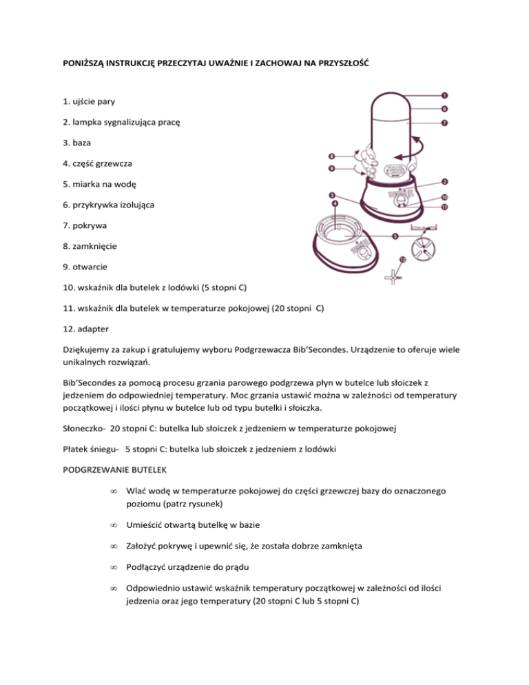 PONIŻSZĄ INSTRUKCJĘ PRZECZYTAJ UWAŻNIE I ZACHOWAJ NA PRZYSZŁOŚĆ 1. ujście pary 2. lampka sygnalizująca pracę 3. baza 4. część grzewcza 5. miarka na wodę 6. przykrywka izolująca 7. pokrywa 8. zamknięcie 9. otwarcie 10. wskaźnik dla butelek z lodówki (5 stopni C) 11. wskaźnik dla butelek w temperaturze pokojowej (20 stopni C) 12. adapter Dziękujemy za zakup i gratulujemy wyboru Podgrzewacza Bib’Secondes. Urządzenie to oferuje wiele unikalnych rozwiązań. Bib’Secondes za pomocą procesu grzania parowego podgrzewa płyn w butelce lub słoiczek z jedzeniem do odpowiedniej temperatury. Moc grzania ustawić można w zależności od temperatury początkowej i ilości płynu w butelce lub od typu butelki i słoiczka. Słoneczko- 20 stopni C: butelka lub słoiczek z jedzeniem w temperaturze pokojowej Płatek śniegu- 5 stopni C: butelka lub słoiczek z jedzeniem z lodówki PODGRZEWANIE BUTELEK • Wlać wodę w temperaturze pokojowej do części grzewczej bazy do oznaczonego poziomu (patrz rysunek) • Umieścić otwartą butelkę w bazie • Założyć pokrywę i upewnić się, że została dobrze zamknięta • Podłączyć urządzenie do prądu • Odpowiednio ustawić wskaźnik temperatury początkowej w zależności od ilości jedzenia oraz jego temperatury (20 stopni C lub 5 stopni C) • Wciśnij wskaźnik by rozpocząć grzanie. Lampka sygnalizuje rozpoczęcie grzania. • Jedzenie jest podgrzanie po wyłączeniu się lampki. Sygnał dźwiękowy również informuje o zakończeniu procesu grzania • Ostrożnie odkręć pokrywę wraz z przykrywką izolującą (para jest gorąca). Wyjmij butelkę trzymając za wypełnioną jej część (pusta część butelki jest bardzo gorąca). Butelka może być bardziej gorąca niż jej zawartość. • Zamknij i wstrząśnij • Niezbędne jest sprawdzenie temperatury jedzenia przed podaniem go dziecku • Nie ustawiaj większej temperatury niż ta, która jest potrzebna • Ze względów higienicznych oraz by uniknąć rozwoju bakterii, jedzenie powinno być podawane od razu po przygotowaniu (maksimum 2 h). Przed przygotowaniem jakiegokolwiek jedzenia dla dziecka skonsultuj się z lekarzem lub diabetykiem. • Jeśli jedzenie po podgrzaniu nie ma odpowiedniej temperatury powtórz krótki cykl podgrzewania jeszcze raz. PODGRZEWANIE SŁOICZKÓW Z JEDZENIEM • Postępuj tak jak powyżej, upewniając się, że słoiczek jest bez przykrywki • Ustaw wskaźnik w zależności od temperatury początkowej słoiczka. Jedzenie będzie podgrzane gdy lampka sygnalizująca pracę zgaśnie • Zamieszaj i spróbuj jedzenia ze słoiczka przed podaniem • Jeśli jedzenie po podgrzaniu nie ma odpowiedniej temperatury powtórz krótki cykl podgrzewania jeszcze raz. CZYSZCZENIE • Po odłączeniu urządzenia od prądu i wylaniu wody czyścić bazę czystą i wilgotną szmatką lub gąbką. Delikatnie wytrzeć do sucha. UWAGA: Nie myć pokrywy w zmywarce. Myć pod bieżącą wodą i wytrzeć do sucha. • Regularnie należy odkamieniać bazę przy użyciu octu wypełniając ją do odpowiedniego poziomu i zostawiając dopóki osad całkowicie nie zniknie. Następnie przemyć kilka razy czystą wodą. Nie wolno czyścić urządzenia pod bieżącą wodą. UWAGA • Nie pozostawiaj urządzenia w zasięgu dzieci (włączonego i wyłączonego). Upewnij się, że dziecko nie będzie miało do niego dostępu • Zawsze korzystaj z urządzenia ustawionego na płaskiej powierzchni • Zawsze korzystaj z gniazdek elektrycznych 230V z uziemieniem • Nie włączaj urządzenia bez wody w podgrzewaczu • Wody w bazie nie może być więcej niż wskazuje na to oznaczony poziom • Regularnie należy upewniać się czy ujście pary nie jest zapchane (zapchanie może spowodować ryzyko poparzenia) • Podany czas grzania i temperatura są przybliżone i zależą od metody przygotowywania jedzenia. Zawsze sprawdzaj temperaturę jedzenia przed podaniem go dziecku. Moc Bib’Secondes jest dostosowana do podgrzewania samej wody, bez mleka w proszku. • Nie czyścić zewnętrznych powierzchni podgrzewacza detergentami; należy w tym celu używać miękkiej ściereczki i wody z delikatnym płynem • Nie czyścić zewnętrznych powierzchni podgrzewacza kiedy jest on gorący • Nie pozostawiaj urządzenia w zasięgu dzieci • Urządzenie to zaprojektowano do użytku domowego • Urządzenia nie zanurzać w wodzie • Nie używaj urządzenia gdy jest ono uszkodzone lub nie działa odpowiednio. W takim przypadku skontaktuj się z Twoim sprzedawcą Beaba. WAŻNE: Przeczytaj przed użyciem. Moc urządzenia ustawiana była dla przykładowej plastikowej butelki marki Beaba. Niektóre butelki po podgrzaniu mogą mieć znaczącą różnice w temperaturze. Dlatego też ważne jest by dostosować moc urządzenia do rodzaju butelki, np. zmniejszyć temperaturę podgrzewania dla butelek z szeroką szyjką, lub znacznie zmniejszyć temperaturę dla butelek szklanych • Czas podgrzewania dla przykładowej butelki Beaba został zaprogramowany przy temperaturze początkowej 20 stopni C. Dlatego też jakiekolwiek różnice w temperaturze początkowej będą miały wpływ na temperaturę końcową • Dla otrzymania idealnej temperatury butelka powinna zostać wyjęta z urządzenia po wyłączeniu się lampki Dystrybutor: Solution Michał Lenarczyk Ul. Biedronki 41/4 02-959 Warszawa Tel. 500 000 528 [email protected]