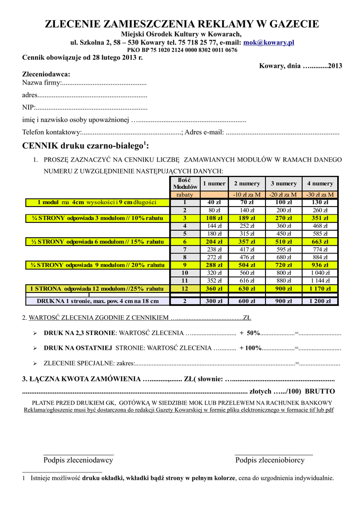 ZLECENIE ZAMIESZCZENIA REKLAMY W GAZECIE Miejski Ośrodek Kultury w Kowarach, ul. Szkolna 2, 58 – 530 Kowary tel. 75 718 25 77, e-mail: [email protected] PKO BP 75 1020 2124 0000 8302 0011 0676 Cennik obowiązuje od 28 lutego 2013 r. Kowary, dnia …..........2013 Zleceniodawca: Nazwa firmy:............................................... adres............................................................. NIP:.............................................................. imię i nazwisko osoby upoważnionej …............................................................ Telefon kontaktowy:.......................................................; Adres e-mail: ............................................................... CENNIK druku czarno-białego1: 1. PROSZĘ ZAZNACZYĆ NA CENNIKU LICZBĘ ZAMAWIANYCH MODUŁÓW W RAMACH DANEGO NUMERU Z UWZGLĘDNIENIE NASTĘPUJĄCYCH DANYCH: 1 moduł ma 4cm wysokości i 9 cm długości ¼ STRONY odpowiada 3 modułom // 10% rabatu ½ STRONY odpowiada 6 modułom // 15% rabatu ¾ STRONY odpowiada 9 modułom // 20% rabatu 1 STRONA odpowiada 12 modułom //25% rabatu DRUK NA 1 stronie, max. pow. 4 cm na 18 cm Ilość 1 numer Modułów rabaty 1 40 zł 2 80 zł 3 108 zł 4 144 zł 5 180 zł 6 204 zł 7 238 zł 8 272 zł 9 288 zł 10 320 zł 11 352 zł 12 360 zł 2 300 zł 2 numery 3 numery 4 numery -10 zł za M 70 zł 140 zł 189 zł 252 zł 315 zł 357 zł 417 zł 476 zł 504 zł 560 zł 616 zł 630 zł -20 zł za M 100 zł 200 zł 270 zł 360 zł 450 zł 510 zł 595 zł 680 zł 720 zł 800 zł 880 zł 900 zł -30 zł za M 130 zł 260 zł 351 zł 468 zł 585 zł 663 zł 774 zł 884 zł 936 zł 1 040 zł 1 144 zł 1 170 zł 600 zł 900 zł 1 200 zł 2. WARTOSĆ ZLECENIA ZGODNIE Z CENNIKIEM …........................................ZŁ DRUK NA 2,3 STRONIE: WARTOSĆ ZLECENIA …........................... + 50%.....................=.......................... DRUK NA OSTATNIEJ STRONIE: WARTOSĆ ZLECENIA ….......... + 100%....................=.......................... ZLECENIE SPECJALNE: zakres:.................................................................................................=......................... 3. ŁĄCZNA KWOTA ZAMÓWIENIA …..........,....... ZŁ( słownie: …......................................................... ............................................................................................................................. złotych ….../100) BRUTTO PŁATNE PRZED DRUKIEM GK, GOTÓWKĄ W SIEDZIBIE MOK LUB PRZELEWEM NA RACHUNEK BANKOWY Reklama/ogłoszenie musi być dostarczona do redakcji Gazety Kowarskiej w formie pliku elektronicznego w formacie tif lub pdf __________________ Podpis zleceniodawcy ____________________ Podpis zleceniobiorcy 1 Istnieje możliwość druku okładki, wkładki bądź strony w pełnym kolorze, cena do uzgodnienia indywidualnie.