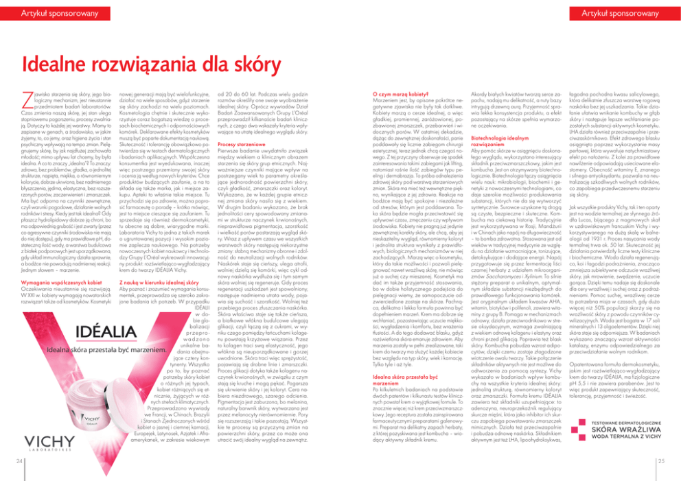Artykuł sponsorowany Artykuł sponsorowany Idealne rozwia˛zania dla skóry Z jawisko starzenia się skóry, jego biologiczny mechanizm, jest nieustannie przedmiotem badań laboratoriów. Czas zmienia naszą skórę, jej stan ulega stopniowemu pogorszeniu, procesy zwalniają. Dotyczy to każdej jej warstwy. Mamy to zapisane w genach, a środowisko, w jakim żyjemy, to, co jemy, oraz higiena życia i stan psychiczny wpływają na tempo zmian. Pielęgnujemy skórę, by jak najdłużej zachowała młodość; mimo upływu lat chcemy, by była idealna. A co to znaczy „idealna”? To znaczy: zdrowa, bez problemów, gładka, o jednolitej strukturze, napięta, miękka, o równomiernym kolorycie, dobrze ukrwiona, bez nadmiernego błyszczenia, jędrna, elastyczna, bez rozszerzonych porów, zaczerwienień i zmarszczek. Ma być odporna na czynniki zewnętrzne, czyli warunki pogodowe, działanie wolnych rodników i stresy. Kiedy jest tak idealna? Gdy płaszcz hydrolipidowy dobrze ją chroni, bo ma odpowiednią grubość i jest zwarty (przez co agresywne czynniki środowiska nie mają do niej dostępu), gdy ma prawidłowe pH, dostateczną ilość wody, a warstwa budulcowa z białek podporowych jest uporządkowana, gdy układ immunologiczny działa sprawnie, a bodźce nie powodują nadmiernej reakcji. Jednym słowem – marzenie. nowej generacji mają być wielofunkcyjne, działać na wiele sposobów, gdyż starzenie się skóry zachodzi na wielu poziomach. Kosmetologia chętnie i skutecznie wykorzystuje coraz bogatszą wiedzę o procesach biochemicznych i odpornościowych komórek. Deklarowane efekty kosmetyków muszą być poparte dokumentacją naukową. Skuteczność i tolerancję obowiązkowo potwierdza się w testach dermatologicznych i badaniach aplikacyjnych. Współczesna konsumentka jest wyedukowana, inaczej więc postrzega przemiany swojej skóry i ocenia ją według nowych kryteriów. Chce produktów budzących zaufanie, a na to składa się także marka, jak i miejsce zakupu. Apteki to właśnie takie miejsce. Tu przychodzi się po zdrowie, można poprosić farmaceutę o poradę – krótko mówiąc, jest to miejsce cieszące się zaufaniem. Tu sprzedaje się również dermokosmetyki, tu obecne są dobre, wiarygodne marki. Laboratoria Vichy to jedna z takich marek o ugruntowanej pozycji i wysokim poziomie zaplecza naukowego. Na potrzeby nowoczesnych kobiet naukowcy i technolodzy Grupy L’Oréal wykreowali innowacyjny produkt: rozświetlająco-wygładzający krem do twarzy IDÉALIA Vichy. Wymagania współczesnych kobiet Oczekiwania nieustannie się rozwijają. W XXI w. kobiety wymagają nowatorskich rozwiązań także od kosmetyków. Kosmetyki Z nauką w kierunku idealnej skóry Aby poznać i zrozumieć wymagania konsumentek, przeprowadza się szeroko zakrojone badania ich potrzeb. W przypadku IDÉALII w dobie globalizacji p r ze p ro wadzono unikalne baIdealna skóra przestała być marzeniem. dania obejmujące cztery kontynenty. Wszystko po to, by poznać potrzeby skóry kobiet o różnych jej typach, kobiet różniących się etnicznie, żyjących w różnych strefach klimatycznych. Przeprowadzono wywiady we Francji, w Chinach, Brazylii i Stanach Zjednoczonych wśród kobiet o jasnej i ciemnej karnacji, Europejek, Latynosek, Azjatek i Afroamerykanek, w zakresie wiekowym IDÉALIA 24 od 20 do 60 lat. Podczas wielu godzin rozmów określiły one swoje wyobrażenie idealnej skóry. Oprócz wywiadów Dział Badań Zaawansowanych Grupy L’Oréal przeprowadził kilkanaście badań klinicznych, z czego dwa wskazały kryteria wpływające na utratę idealnego wyglądu skóry. Procesy starzeniowe Pierwsze badanie uwydatniło związek między wiekiem a klinicznym obrazem starzenia się skóry grup etnicznych. Najważniejsze czynniki mające wpływ na postrzegany wiek to parametry określające jednorodność powierzchni skóry, czyli gładkość, zmarszczki oraz koloryt. Wykazano, że w każdej grupie etnicznej zmiana skóry nasila się z wiekiem. W drugim badaniu wykazano, że brak jednolitości cery spowodowany zmianami w strukturze naczynek krwionośnych, nieprawidłowa pigmentacja, szorstkość i wielkość porów postarzają wygląd skóry. Wraz z upływem czasu we wszystkich warstwach skóry następują niekorzystne zmiany: słabną mechanizmy obronne i zdolność do neutralizacji wolnych rodników. Naskórek staje się cieńszy, ulega atrofii, wolniej dzielą się komórki, więc cykl odnowy naskórka wydłuża się i tym samym skóra wolniej się regeneruje. Gdy proces regeneracji uszkodzeń jest spowolniony, następuje nadmierna utrata wody, pojawia się suchość i szorstkość. Wolniej też przebiega proces złuszczania naskórka. Skóra właściwa staje się także cieńsza, a białkowe włókna budulcowe ulegają glikacji, czyli łączą się z cukrami, w wyniku czego pomiędzy łańcuchami kolagenu powstają krzyżowe wiązania. Przez to kolagen traci swą elastyczność, jego włókna są nieuporządkowane i gorzej uwodnione. Skóra traci więc sprężystość, pojawiają się drobne linie i zmarszczki. Proces glikacji dotyka także kolagenu naczynek krwionośnych, w związku z czym stają się kruche i mogą pękać. Pogarsza się ukrwienie skóry i jej koloryt. Cera nabiera niezdrowego, szarego odcienia. Pigmentacja jest zaburzona, bo melanina, naturalny barwnik skóry, wytwarzana jest przez melanocyty nierównomiernie. Pory się rozszerzają i takie pozostają. Wszystkie te procesy są przyczyną zmian na powierzchni skóry, przez co może ona utracić swój idealny wygląd na zewnątrz. O czym marzą kobiety? Marzeniem jest, by opisane pokrótce negatywne zjawiska nie były tak dotkliwe. Kobiety marzą o cerze idealnej, a więc gładkiej, promiennej, zaróżowionej, pozbawionej zmarszczek, przebarwień i widocznych porów. W ostatniej dekadzie, dążąc do zewnętrznej doskonałości, panie poddawały się licznie zabiegom chirurgii estetycznej, teraz jednak chcą czegoś no