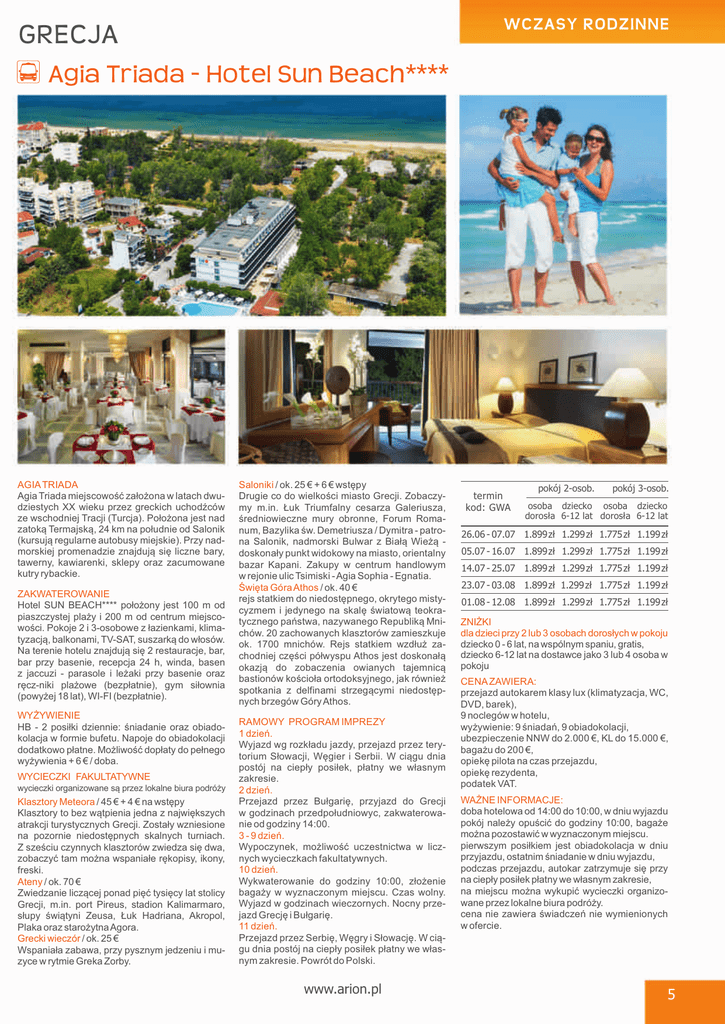 WCZASY RODZINNE GRECJA Agia Triada - Hotel Sun Beach **** AGIA TRIADA Agia Triada miejscowoœæ za³o¿ona w latach dwudziestych XX wieku przez greckich uchodŸców ze wschodniej Tracji (Turcja). Po³o¿ona jest nad zatok¹ Termajsk¹, 24 km na po³udnie od Salonik (kursuj¹ regularne autobusy miejskie). Przy nadmorskiej promenadzie znajduj¹ siê liczne bary, tawerny, kawiarenki, sklepy oraz zacumowane kutry rybackie. ZAKWATEROWANIE Hotel SUN BEACH**** po³o¿ony jest 100 m od piaszczystej pla¿y i 200 m od centrum miejscowoœci. Pokoje 2 i 3-osobowe z ³azienkami, klimatyzacj¹, balkonami, TV-SAT, suszark¹ do w³osów. Na terenie hotelu znajduj¹ siê 2 restauracje, bar, bar przy basenie, recepcja 24 h, winda, basen z jaccuzi - parasole i le¿aki przy basenie oraz rêcz-niki pla¿owe (bezp³atnie), gym si³ownia (powy¿ej 18 lat), WI-FI (bezp³atnie). WY¯YWIENIE HB - 2 posi³ki dziennie: œniadanie oraz obiadokolacja w formie bufetu. Napoje do obiadokolacji dodatkowo p³atne. Mo¿liwoœæ dop³aty do pe³nego wy¿ywienia + 6 € / doba. WYCIECZKI FAKULTATYWNE wycieczki organizowane s¹ przez lokalne biura podró¿y Klasztory Meteora / 45 € + 4 € na wstêpy Klasztory to bez wàtpienia jedna z najwiækszych atrakcji turystycznych Grecji. Zosta³y wzniesione na pozornie niedostêpnych skalnych turniach. Z szeœciu czynnych klasztorów zwiedza siê dwa, zobaczyæ tam mo¿na wspania³e rêkopisy, ikony, freski. Ateny / ok. 70 € Zwiedzanie licz¹cej ponad piêæ tysiêcy lat stolicy Grecji, m.in. port Pireus, stadion Kalimarmaro, s³upy œwi¹tyni Zeusa, £uk Hadriana, Akropol, Plaka oraz staro¿ytna Agora. Grecki wieczór / ok. 25 € Wspania³a zabawa, przy pysznym jedzeniu i muzyce w rytmie Greka Zorby. Saloniki / ok. 25 € + 6 € wstêpy Drugie co do wielkoœci miasto Grecji. Zobaczymy m.in. £uk Triumfalny cesarza Galeriusza, œredniowieczne mury obronne, Forum Romanum, Bazylika œw. Demetriusza / Dymitra - patrona Salonik, nadmorski Bulwar z Bia³¹ Wie¿¹ doskona³y punkt widokowy na miasto, orientalny bazar Kapani. Zakupy w centrum handlowym w rejonie ulic Tsimiski - Agia Sophia - Egnatia. Œwiêta Góra Athos / ok. 40 € rejs statkiem do niedostêpnego, okrytego mistycyzmem i jedynego na skalê œwiatow¹ teokratycznego pañstwa, nazywanego Republik¹ Mnichów. 20 zachowanych klasztorów zamieszkuje ok. 1700 mnichów. Rejs statkiem wzd³u¿ zachodniej czêœci pó³wyspu Athos jest doskona³¹ okazj¹ do zobaczenia owianych tajemnic¹ bastionów koœcio³a ortodoksyjnego, jak równie¿ spotkania z delfinami strzeg¹cymi niedostêpnych brzegów Góry Athos. RAMOWY PROGRAM IMPREZY 1 dzieñ. Wyjazd wg rozk³adu jazdy, przejazd przez terytorium S³owacji, Wêgier i Serbii. W ci¹gu dnia postój na ciep³y posi³ek, p³atny we w³asnym zakresie. 2 dzieñ. Przejazd przez Bu³gariê, przyjazd do Grecji w godzinach przedpo³udniowyc, zakwaterowanie od godziny 14:00. 3 - 9 dzieñ. Wypoczynek, mo¿liwoœæ uczestnictwa w licznych wycieczkach fakultatywnych. 10 dzieñ. Wykwaterowanie do godziny 10:00, z³o¿enie baga¿y w wyznaczonym miejscu. Czas wolny. Wyjazd w godzinach wieczornych. Nocny przejazd Grecjê i Bu³gariê. 11 dzieñ. Przejazd przez Serbiê, Wêgry i S³owacjê. W ci¹gu dnia postój na ciep³y posi³ek p³atny we w³asnym zakresie. Powrót do Polski. www.arion.pl termin kod: GWA pokój 2-osob. pokój 3-osob. osoba dziecko osoba dziecko doros³a 6-12 lat doros³a 6-12 lat 26.06 - 07.07 1.899 z³ 1.299 z³ 1.775 z³ 1.199 z³ 05.07 - 16.07 1.899 z³ 1.299 z³ 1.775 z³ 1.199 z³ 14.07 - 25.07 1.899 z³ 1.299 z³ 1.775 z³ 1.199 z³ 23.07 - 03.08 1.899 z³ 1.299 z³ 1.775 z³ 1.199 z³ 01.08 - 12.08 1.899 z³ 1.299 z³ 1.775 z³ 1.199 z³ ZNI¯KI dla dzieci przy 2 lub 3 osobach doros³ych w pokoju dziecko 0 - 6 lat, na wspólnym spaniu, gratis, dziecko 6-12 lat na dostawce jako 3 lub 4 osoba w pokoju CENA ZAWIERA: przejazd autokarem klasy lux (klimatyzacja, WC, DVD, barek), 9 noclegów w hotelu, wy¿ywienie: 9 œniadañ, 9 obiadokolacji, ubezpieczenie NNW do 2.000 €, KL do 15.000 €, baga¿u do 200 €, opiekê pilota na czas przejazdu, opiekê rezydenta, podatek VAT. WA¯NE INFORMACJE: doba hotelowa od 14:00 do 10:00, w dniu wyjazdu pokój nale¿y opuœciæ do godziny 10:00, baga¿e mo¿na pozostawiæ w wyznaczonym miejscu. pierwszym posi³kiem jest obiadokolacja w dniu przyjazdu, ostatnim œniadanie w dniu wyjazdu, podczas przejazdu, autokar zatrzymuje siê przy na ciep³y posi³ek p³atny we w³asnym zakresie, na miejscu mo¿na wykupiæ wycieczki organizowane przez lokalne biura podró¿y. cena nie zawiera œwiadczeñ nie wymienionych w ofercie. 5