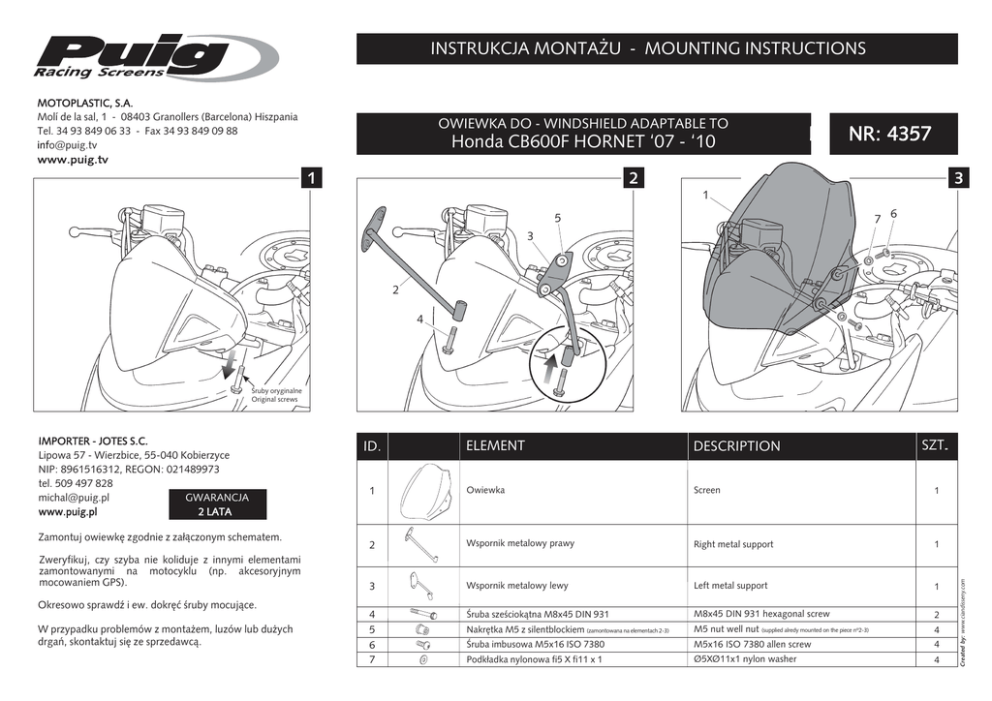 515 1 3 2 1 5 7 6 3 2 4 Original screws SZT.. 1 Owiewka Screen 1 2 Wspornik metalowy prawy Right metal support 1 3 Wspornik metalowy lewy Left metal support 1 M8x45 DIN 931 hexagonal screw 2 M5 nut well nut (supplied alredy mounted on the piece nº2-3) M5x16 ISO 7380 allen screw 4 4 Ø5XØ11x1 nylon washer 4 4 5 6 7 Created by: www.ciandisseny.com DESCRIPTION ID.