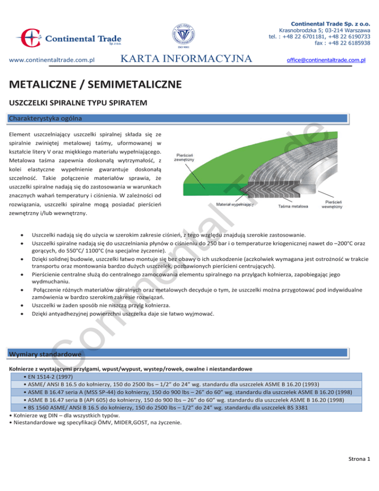 Continental Trade Sp. z o.o. Krasnobrodzka 5; 03-214 Warszawa tel. : +48 22 6701181, +48 22 6190733 fax : +48 22 6185938 www.continentaltrade.com.pl KARTA INFORMACYJNA [email protected] METALICZNE / SEMIMETALICZNE USZCZELKI SPIRALNE TYPU SPIRATEM Charakterystyka ogólna e Element uszczelniający uszczelki spiralnej składa się ze spiralnie zwiniętej metalowej taśmy, uformowanej w ra d kształcie litery V oraz miękkiego materiału wypełniającego. Metalowa taśma zapewnia doskonałą wytrzymałość, z kolei elastyczne wypełnienie gwarantuje doskonałą szczelność. Takie połączenie materiałów sprawia, że znacznych wahań temperatury i ciśnienia. W zależności od • • C on • • en • Uszczelki nadają się do użycia w szerokim zakresie ciśnień, z tego względu znajdują szerokie zastosowanie. Uszczelki spiralne nadają się do uszczelniania płynów o ciśnieniu do 250 bar i o temperaturze kriogenicznej nawet do –200°C oraz gorących, do 550°C/ 1100°C (na specjalne życzenie). Dzięki solidnej budowie, uszczelki łatwo montuje się bez obawy o ich uszkodzenie (aczkolwiek wymagana jest ostrożność w trakcie transportu oraz montowania bardzo dużych uszczelek, pozbawionych pierścieni centrujących). Pierścienie centralne służą do centralnego zamocowania elementu spiralnego na przylgach kołnierza, zapobiegając jego wydmuchaniu. Połączenie różnych materiałów spiralnych oraz metalowych decyduje o tym, że uszczelki można przygotować pod indywidualne zamówienia w bardzo szerokim zakresie rozwiązań. Uszczelki w żaden sposób nie niszczą przylg kołnierza. Dzięki antyadhezyjnej powierzchni uszczelka daje sie łatwo wyjmować. tin • • ta rozwiązania, uszczelki spiralne mogą posiadać pierścień zewnętrzny i/lub wewnętrzny. lT uszczelki spiralne nadają się do zastosowania w warunkach Wymiary standardowe Kołnierze z wystającymi przylgami, wpust/wypust, wystep/rowek, owalne i niestandardowe • EN 1514-2 (1997) • ASME/ ANSI B 16.5 do kołnierzy, 150 do 2500 lbs – 1/2” do 24” wg. standardu dla uszczelek ASME B 16.20 (1993) • ASME B 16.47 seria A (MSS SP-44) do kołnierzy, 150 do 900 lbs – 26” do 60” wg. standardu dla uszczelek ASME B 16.20 (1998) • ASME B 16.47 seria B (API 605) do kołnierzy, 150 do 900 lbs – 26” do 60” wg. standardu dla uszczelek ASME B 16.20 (1998) • BS 1560 ASME/ ANSI B 16.5 do kołnierzy, 150 do 2500 lbs – 1/2” do 24” wg. standardu dla uszczelek BS 3381 • Kołnierze wg DIN – dla wszystkich typów. • Niestandardowe wg specyfikacji ÖMV, MIDER,GOST, na życzenie. Strona 1 Continental Trade Sp. z o.o. Krasnobrodzka 5; 03-214 Warszawa tel. : +48 22 6701181, +48 22 6190733 fax : +48 22 6185938 www.continentaltrade.com.pl KARTA INFORMACYJNA [email protected] D b max t2 Zalecana grubość po zamocowaniu [mm] [mm] [mm] [mm] [mm] [mm] 7,2 +0,35 100 – 3200 33 5 5,3 – 5,6 6,4 +0,30 100- 1600 30 4 4,7 – 4,9 1601 – 3200 25 15 – 630 35 631 – 1600 30 3 3,2 – 3,4 1601 – 2000 20 3,5 3,2 2,5 +0,25 +0,25 15 – 1000 +0,25 15 – 500 25 2 20 10 1,5 Stal nierdzewna 17 240 X5CrNi 18 238-C 40B 1.4301 304 304S15/16/31 Stal nierdzewna 17 247 X10CrNiTi 189 -250 +550 1.4541 321 321S12/49/87 -250 +550 Stal nierdzewna 17 249 X2CrNi 189 Stal nierdzewna 17 251 X15CrNiSi 2012 1.4306 304L 304S11 -250 +550 1.4828 309 309S24 -100 +1000 Stal nierdzewna 17 346 X5CrNiMo 1810 Stal nierdzewna 17 348 X10CrNiMoTi 1810 1.4401 316 316S31/33 -100 +550 1.4571 316Ti 320S31 -100 Stal nierdzewna 17 349 X2CrNiMo 1810 +550 1.4404 316L 316S11/13 -100 +550 DIN Nr. materiału 1.0038 AISI/ASTM ta DIN Spec. RSt. 37.2 CS tin en Stal węglowa CSN Spec. 11 375 1,8 – 2,0 B.S. Standardowe materiały metalowe Materiał 2,3 – 2,5 lT 4,8 ra d Tolerancja Standard Element uszczelniający t1 e Grubość uszczelek Temperatura [°C] Min. Max. -40 +500 Standardowe wypełnienia Temperatura [°C] Max. +500 pH Zastosowanie Kolor 0 – 14 Medium żrące szary PTFE -200 +250 0 – 14 Medium żrące biały Ceramiczny -200 +1100 - Bardzo wysokie temperatury seledyn Mika -200 +1000 - Wysokie temperatury róż C on Min. Materiał Grafit Naprężenie ściskające uszczelki zakres Q 2 Element uszczelniający 2 Jednostronnie zamknięty „Q” (N/mm ) naprężenie ściskające +20°C Obustronnie zamknięty „Q” (N/mm ) naprężenie ściskające +20°C Min. Zalecane Max. Min. Zalecane Max. Grafit 50 90 180 50 122 300 PTFE 50 80 130 50 110 250 Ceramiczny 60 90 150 70 120 300 Strona 2 Continental Trade Sp. z o.o. Krasnobrodzka 5; 03-214 Warszawa tel. : +48 22 6701181, +48 22 6190733 fax : +48 22 6185938 www.continentaltrade.com.pl KARTA INFORMACYJNA [email protected] Standardowe profile/przekroje uszczelek SPIRATEM 23 Jak SPIRATEM 123, ale bez pierścienia zewnętrznego (stosowana do kołnierzy wpust/wypust). ra d e SPIRATEM 123 Uszczelka spiralna składa się z pierścienia zewnętrznego części uszczelniającej z pierścienia wewnętrznego – kompletna uszczelka. SPIRATEM 12 SPIRATEM 2 lT Uszczelka składa się z materiału uszczelniającego oraz spiralnie zwiniętej metalowej taśmy, uformowanej w kształcie litery V (stosowana do kołnierzy wpust/wypust i występ/rowek). en ta Standardowa uszczelka spiralna formatu jak SPIRATEM 2, ale bez zewnętrznego/centralnego pierścienia (stosowana do kołnierzy z wystającymi przylgami). Zalecane wykończenie powierzchni kołnierza C on tin Ra= 3,2 to 12,5 (µm) Uszczelki spiralne dostępne są również w formie owalnej i eliptycznej. Możliwe jest wykonanie uszczelki z przegrodą wg rysunku. Wszystkie przegrody są wspawane. Strona 3 Continental Trade Sp. z o.o. Krasnobrodzka 5; 03-214 Warszawa tel. : +48 22 6701181, +48 22 6190733 fax : +48 22 6185938 www.continentaltrade.com.pl KARTA INFORMACYJNA [email protected] Uszczelnienia wielokrawędziowe • RÓWNOLEGŁE M18L en Standardowe profile uszczelek ra d • lT • Uszczelki wielokrawędziove składają się z metalowego rdzenia zazwyczaj 