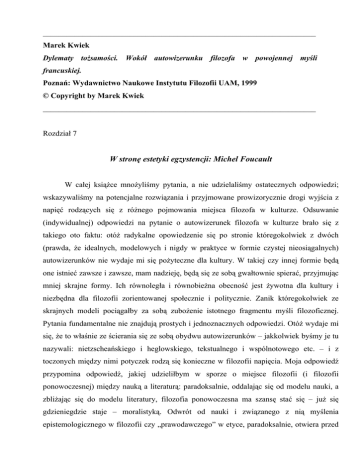 _____________________________________________________________________ Marek Kwiek Dylematy tożsamości. Wokół autowizerunku filozofa w powojennej myśli francuskiej. Poznań: Wydawnictwo Naukowe Instytutu Filozofii UAM, 1999 © Copyright by Marek Kwiek _____________________________________________________________________ Rozdział 7 W stronę estetyki egzystencji: Michel Foucault W całej książce mnożyliśmy pytania, a nie udzielaliśmy ostatecznych odpowiedzi; wskazywaliśmy na potencjalne rozwiązania i przyjmowane prowizorycznie drogi wyjścia z napięć rodzących się z różnego pojmowania miejsca filozofa w kulturze. Odsuwanie (indywidualnej) odpowiedzi na pytanie o autowizerunek filozofa w kulturze brało się z takiego oto faktu: otóż radykalne opowiedzenie się po stronie któregokolwiek z dwóch (prawda, że idealnych, modelowych i nigdy w praktyce w formie czystej nieosiągalnych) autowizerunków nie wydaje mi się pożyteczne dla kultury. W takiej czy innej formie będą one istnieć zawsze i zawsze, mam nadzieję, będą się ze sobą gwałtownie spierać, przyjmując mniej skrajne formy. Ich równoległa i równobieżna obecność jest żywotna dla kultury i niezbędna dla filozofii zorientowanej społecznie i politycznie. Zanik któregokolwiek ze skrajnych modeli pociągałby za sobą zubożenie istotnego fragmentu myśli filozoficznej. Pytania fundamentalne nie znajdują prostych i jednoznacznych odpowiedzi. Otóż wydaje mi się, że to właśnie ze ścierania się ze sobą obydwu autowizerunków – jakkolwiek byśmy je tu nazywali: nietzscheańskiego i heglowskiego, tekstualnego i wspólnotowego etc. – i z toczonych między nimi potyczek rodzą się konieczne w filozofii napięcia. Moja odpowiedź przypomina odpowiedź, jakiej udzieliłbym w sporze o miejsce filozofii (i filozofii ponowoczesnej) między nauką a literaturą: paradoksalnie, oddalając się od modelu nauki, a zbliżając się do modelu literatury, filozofia ponowoczesna ma szansę stać się – już się gdzieniegdzie staje – moralistyką. Odwrót od nauki i związanego z nią myślenia epistemologicznego w filozofii czy „prawodawczego” w etyce, paradoksalnie, otwiera przed W stronę estetyki egzystencji: Michel Foucault 276 częścią filozofii zupełnie nieznane dotąd możliwości, sprowadzając ją, przynajmniej potencjalnie, bliżej jednostki i bliżej wspólnoty. Filozofia sama zdecyduje o tym, jakie weźmie na siebie zobowiązania w obliczu swoich minionych przygód z nowoczesnością. Jeśli w dyskusjach tych zostanie przekroczona masa krytyczna, może dojść do przesilenia, jeżeli natomiast do tego nie dojdzie, być może to, co dzisiaj nazywamy filozofią ponowoczesną – po prostu – filozofią być przestanie. Rzecz przecież w kolejnej redefinicji pojęcia „filozofia” w obliczu wyzwań, jakie niesie z sobą dzisiejsza kultura. Jeśli założy się, że nie istnieje jakiś jej preegzystujący byt, że nie definiują jej całkowicie jedynie klasyczne, odwieczne kwestie filozoficzne, to szansa na taką redefinicję pojęcia jest spora. W przeciwnym razie pozostać może jedynie coraz bardziej wyobcowana z kultury klasyczna dziedzina nauki, która z czasem – jak teologia – przestanie wywoływać społeczny oddźwięk. Doprawdy trudno przesądzać, co dla filozofii byłoby lepsze: czy lepszy byłby jej potencjalny anachronizm czy potencjalna bezsilność, czy przymierze z nauką (ze wszystkimi narzucanymi przez nią ograniczeniami) czy alians z literaturą (ze wszystkimi kierowanymi wobec niej oczekiwaniami). Bodaj najlepsze byłoby dalsze współistnienie wielu odmiennych koncepcji filozofii, ich ciągłe wzajemne ścieranie się i zmaganie. A zatem sytuacja, w której nie można powiedzieć, że filozofia zbliża się do modelu literatury czy też zbliża się do modelu nauki: w której filozofia po prostu wciąż balansuje między jednym a drugim. Hegemonia w kulturze któregokolwiek modelu byłaby niezdrowa, a dla dyscypliny być może wprost, na dłuższą metę, zabójcza (niech więc o jej witalności świadczy wielość zwalczających się, choć starających się szanować głosów, a wtedy nie zagrozi jej ani kulturowa jałowość płynąca z nieuniknionej apodyktyczności tonu nauki, ani kulturowa bezsilność biorąca się z zamierzonej łagodności i wrażliwości tonu literatury). Na podobnej zasadzie radykalna hegemonia jednego z prezentowanych tu autowizerunków filozofa w kulturze byłaby fatalną próbą rozwiązania rodzących się napięć. Są to, przypomnijmy jeszcze raz, autowizerunki polityczne i społeczne: a zatem jedne z bardzo wielu możliwych, których podział jest ponadto jawnie nieostry. Wielu filozofii i wielu filozofów wręcz w ogóle nie obejmuje – jednak dla mnie jest on tutaj ważny, bowiem pytam w tej książce o uwikłania filozofa w politykę. Filozof tutaj to homo politicus – zanurzony w politykę nie jako obywatel, lecz jako filozof właśnie. Dla bardzo dużej części filozofów stawiane tu pytania nie dość, że nie są kluczowe – to wręcz nie pojawiają się nawet na W stronę estetyki egzystencji: Michel Foucault 277 horyzoncie ich zainteresowań. Zajmuję się tu stosunkowo wąskim fragmentem działalności filozoficznej, chociaż posiada ów fragment podstawowe konsekwencje praktyczne, etyczne i polityczne. To właśnie w tych sprawach pojawia się najwięcej emocji, padają najostrzejsze określenia i najcięższe zarzuty, bowiem to one pozostają w bezpośrednim styku ze sferą obywatelskości; dlatego poniekąd w tle rozważanej tu postaci filozofa tkwi wciąż postać intelektualisty, bo w XX wieku to właśnie on najszerzej rozważał analizowane tu kwestie. Tak więc w jakiejś mierze badani tu filozofowie to stosunkowo wąska grupa filozofów-intelektualistów, korzystając z definicji Sartre’a – grupa tych, „którzy mieszają się w nie swoje sprawy”: sprawy polityki, rewolucji, przemocy czy zm