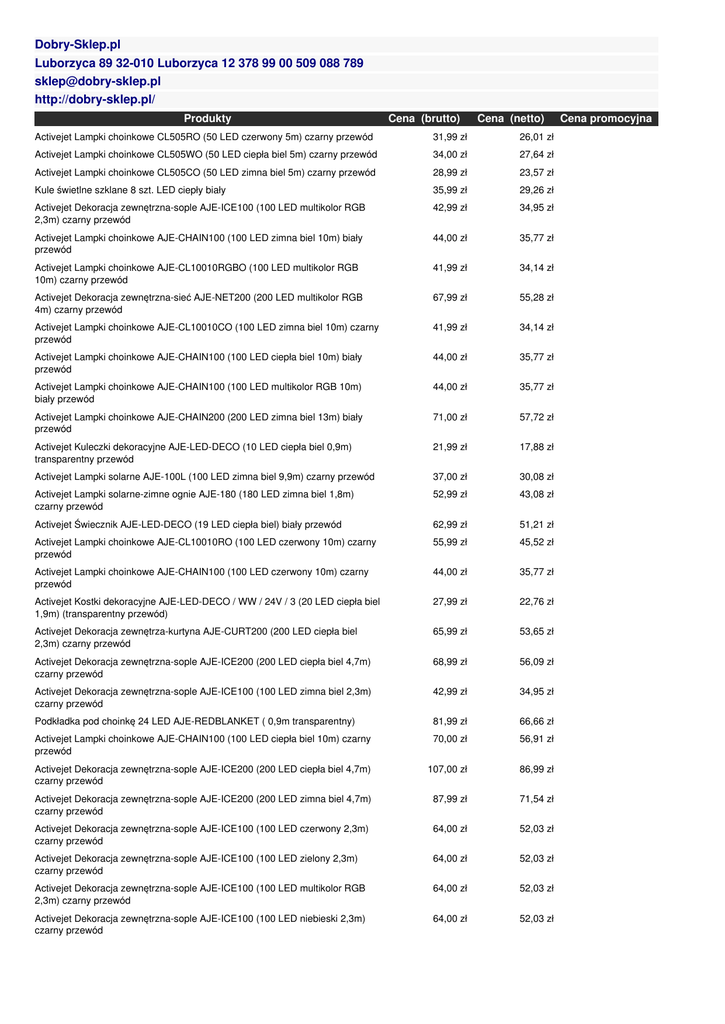 Dobry-Sklep.pl Luborzyca 89 32-010 Luborzyca 12 378 99 00 509 088 789 [email protected] http://dobry-sklep.pl/ Produkty Cena (brutto) Cena (netto) Activejet Lampki choinkowe CL505RO (50 LED czerwony 5m) czarny przewód 31,99 zł 26,01 zł Activejet Lampki choinkowe CL505WO (50 LED ciepła biel 5m) czarny przewód 34,00 zł 27,64 zł Activejet Lampki choinkowe CL505CO (50 LED zimna biel 5m) czarny przewód 28,99 zł 23,57 zł Kule świetlne szklane 8 szt. LED ciepły biały 35,99 zł 29,26 zł Activejet Dekoracja zewnętrzna-sople AJE-ICE100 (100 LED multikolor RGB 2,3m) czarny przewód 42,99 zł 34,95 zł Activejet Lampki choinkowe AJE-CHAIN100 (100 LED zimna biel 10m) biały przewód 44,00 zł 35,77 zł Activejet Lampki choinkowe AJE-CL10010RGBO (100 LED multikolor RGB 10m) czarny przewód 41,99 zł 34,14 zł Activejet Dekoracja zewnętrzna-sieć AJE-NET200 (200 LED multikolor RGB 4m) czarny przewód 67,99 zł 55,28 zł Activejet Lampki choinkowe AJE-CL10010CO (100 LED zimna biel 10m) czarny przewód 41,99 zł 34,14 zł Activejet Lampki choinkowe AJE-CHAIN100 (100 LED ciepła biel 10m) biały przewód 44,00 zł 35,77 zł Activejet Lampki choinkowe AJE-CHAIN100 (100 LED multikolor RGB 10m) biały przewód 44,00 zł 35,77 zł Activejet Lampki choinkowe AJE-CHAIN200 (200 LED zimna biel 13m) biały przewód 71,00 zł 57,72 zł Activejet Kuleczki dekoracyjne AJE-LED-DECO (10 LED ciepła biel 0,9m) transparentny przewód 21,99 zł 17,88 zł Activejet Lampki solarne AJE-100L (100 LED zimna biel 9,9m) czarny przewód 37,00 zł 30,08 zł Activejet Lampki solarne-zimne ognie AJE-180 (180 LED zimna biel 1,8m) czarny przewód 52,99 zł 43,08 zł Activejet Świecznik AJE-LED-DECO (19 LED ciepła biel) biały przewód 62,99 zł 51,21 zł Activejet Lampki choinkowe AJE-CL10010RO (100 LED czerwony 10m) czarny przewód 55,99 zł 45,52 zł Activejet Lampki choinkowe AJE-CHAIN100 (100 LED czerwony 10m) czarny przewód 44,00 zł 35,77 zł Activejet Kostki dekoracyjne AJE-LED-DECO / WW / 24V / 3 (20 LED ciepła biel 1,9m) (transparentny przewód) 27,99 zł 22,76 zł Activejet Dekoracja zewnętrza-kurtyna AJE-CURT200 (200 LED ciepła biel 2,3m) czarny przewód 65,99 zł 53,65 zł Activejet Dekoracja zewnętrzna-sople AJE-ICE200 (200 LED ciepła biel 4,7m) czarny przewód 68,99 zł 56,09 zł Activejet Dekoracja zewnętrzna-sople AJE-ICE100 (100 LED zimna biel 2,3m) czarny przewód 42,99 zł 34,95 zł Podkładka pod choinkę 24 LED AJE-REDBLANKET ( 0,9m transparentny) 81,99 zł 66,66 zł Activejet Lampki choinkowe AJE-CHAIN100 (100 LED ciepła biel 10m) czarny przewód 70,00 zł 56,91 zł Activejet Dekoracja zewnętrzna-sople AJE-ICE200 (200 LED ciepła biel 4,7m) czarny przewód 107,00 zł 86,99 zł Activejet Dekoracja zewnętrzna-sople AJE-ICE200 (200 LED zimna biel 4,7m) czarny przewód 87,99 zł 71,54 zł Activejet Dekoracja zewnętrzna-sople AJE-ICE100 (100 LED czerwony 2,3m) czarny przewód 64,00 zł 52,03 zł Activejet Dekoracja zewnętrzna-sople AJE-ICE100 (100 LED zielony 2,3m) czarny przewód 64,00 zł 52,03 zł Activejet Dekoracja zewnętrzna-sople AJE-ICE100 (100 LED multikolor RGB 2,3m) czarny przewód 64,00 zł 52,03 zł Activejet Dekoracja zewnętrzna-sople AJE-ICE100 (100 LED niebieski 2,3m) czarny przewód 64,00 zł 52,03 zł Cena promocyjna Activejet Dekoracja zewnętrzna-sople AJE-ICE100 (100 LED ciepła biel 2,3m) czarny przewód 64,00 zł 52,03 zł Activejet Dekoracja zewnętrzna-sople AJE-ICE100 (100 LED zimna biel 2,3m) czarny przewód 64,00 zł 52,03 zł Activejet Dekoracja zewnętrza-kurtyna AJE-CURT200 (200 LED zimna biel 2,3m) biały przewód 87,99 zł 71,54 zł Activejet Lampki choinkowe AJE-CURT200 (200 LED multikolor RGB 2,3m) biały przewód 87,99 zł 71,54 zł Activejet Dekoracja zewnętrza-kurtyna AJE-CURT200 (200 LED multikolor RGB 2,3m) biały przewód 87,99 zł 71,54 zł Activejet Dekoracja zewnętrza-kurtyna AJE-CURT200 (200 LED ciepła biel 2,3m) biały przewód 87,99 zł 71,54 zł Activejet Dekoracja zewnętrza-kurtyna AJE-CURT200 (200 LED ciepła biel 2,3m) czarny przewód 87,99 zł 71,54 zł Activejet Dekoracja zewnętrza-kurtyna AJE-CURT200 (200 LED zimna biel 2,3m) czarny przewód 87,99 zł 71,54 zł Activejet Lampki choinkowe AJE-CHAIN200 (200 LED ciepła biel 13m) biały przewód 71,00 zł 57,72 zł Activejet Lampki choinkowe AJE-CHAIN200 (200 LED zimna biel 13m) biały przewód 71,00 zł 57,72 zł Activejet Lampki choinkowe AJE-CHAIN200 (200 LED multikolor RGB 13m) biały przewód 71,00 zł 57,72 zł Activejet Lampki choinkowe AJE-CHAIN100 (100 LED zimna biel 10m) biały przewód 44,00 zł 35,77 zł Activejet Lampki choinkowe AJE-CHAIN100 (100 LED multikolor RGB 10m) biały przewód 44,00 zł 35,77 zł Activejet Lampki choinkowe AJE-CHAIN200 (200 LED zimna biel 13m) czarny przewód 81,99 zł 66,66 zł Activejet Lampki choinkowe AJE-CHAIN200 (200 LED multikolor RGB 13m) czarny przewód 81,99 zł 66,66 zł Activejet Lampki choinkowe AJE-CHAIN100 (100 LED ciepła biel 10m) biały przewód 44,00 zł 35,77 zł Activejet Lampki choinkowe AJE-CHAIN100 (100 LED multikolor RGB 10m) czarny przewód 44,00 zł 35,77 zł Activejet Lampki choinkowe AJE-CHAIN100 (100 LED multikolor RGB 10m) czarny przewód 71,00 zł 57,72 zł Activejet Lampki choinkowe AJE-CHAIN200 (200 LED ciepła biel 13m) czarny przewód 81,99 zł 66,66 zł Activejet Lampki choinkowe AJE-CHAIN100 (100 LED czerwony 10m) czarny przewód 70,00 zł 56,91 zł Activejet Lampki choinkowe AJE-CHAIN100 (100 LED fioletowy 10m) czarny przewód 44,00 zł 35,77 zł Activejet Lampki choinkowe AJE-CHAIN100 (100 LED zielony 10m) czarny przewód 44,00 zł 35,77 zł Activejet Lampki choinkowe AJE-CHAIN100 (100 LED ciepła biel 10m) czarny przewód 70,00 zł 56,91 zł Activejet Lampki choinkowe AJE-CHAIN100 / 10M / CW (100 LED zimna biel 10m) czarny przewód 70,00 zł 56,91 zł Activejet Lampki choinkowe AJE-CHAIN100 (100 LED niebieski 10m) czarny przewód 70,00 zł 56,91 zł Activejet Lampki choinkowe AJE-CL10010WO (100 LED cie