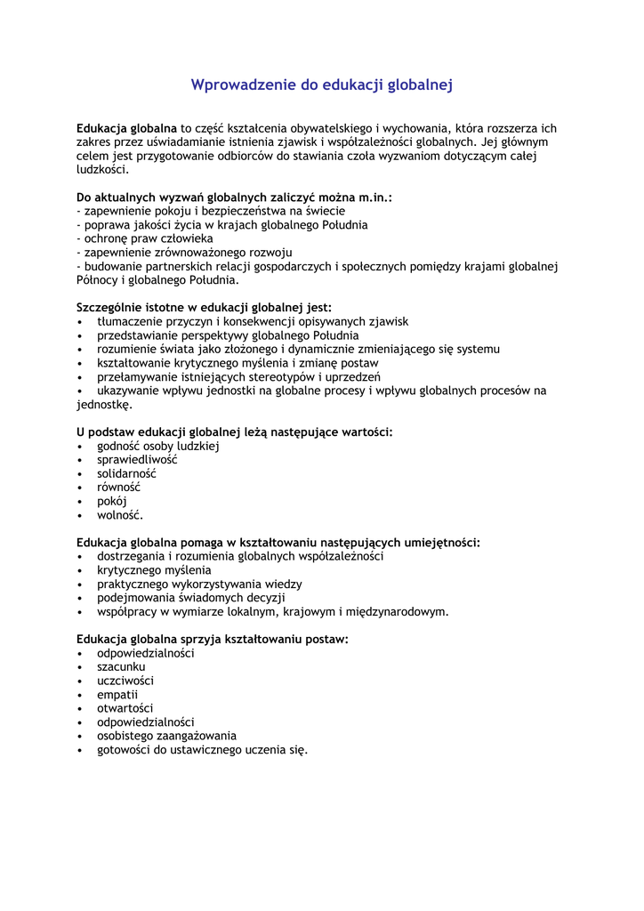 Wprowadzenie do edukacji globalnej Edukacja globalna to część kształcenia obywatelskiego i wychowania, która rozszerza ich zakres przez uświadamianie istnienia zjawisk i współzaleŜności globalnych. Jej głównym celem jest przygotowanie odbiorców do stawiania czoła wyzwaniom dotyczącym całej ludzkości. Do aktualnych wyzwań globalnych zaliczyć moŜna m.in.: - zapewnienie pokoju i bezpieczeństwa na świecie - poprawa jakości Ŝycia w krajach globalnego Południa - ochronę praw człowieka - zapewnienie zrównowaŜonego rozwoju - budowanie partnerskich relacji gospodarczych i społecznych pomiędzy krajami globalnej Północy i globalnego Południa. Szczególnie istotne w edukacji globalnej jest: • tłumaczenie przyczyn i konsekwencji opisywanych zjawisk • przedstawianie perspektywy globalnego Południa • rozumienie świata jako złoŜonego i dynamicznie zmieniającego się systemu • kształtowanie krytycznego myślenia i zmianę postaw • przełamywanie istniejących stereotypów i uprzedzeń • ukazywanie wpływu jednostki na globalne procesy i wpływu globalnych procesów na jednostkę. U podstaw edukacji globalnej leŜą następujące wartości: • godność osoby ludzkiej • sprawiedliwość • solidarność • równość • pokój • wolność. Edukacja globalna pomaga w kształtowaniu następujących umiejętności: • dostrzegania i rozumienia globalnych współzaleŜności • krytycznego myślenia • praktycznego wykorzystywania wiedzy • podejmowania świadomych decyzji • współpracy w wymiarze lokalnym, krajowym i międzynarodowym. Edukacja globalna sprzyja kształtowaniu postaw: • odpowiedzialności • szacunku • uczciwości • empatii • otwartości • odpowiedzialności • osobistego zaangaŜowania • gotowości do ustawicznego uczenia się. Zasady edukacji globalnej Zasady edukacji globalnej to 10 wskazówek, które stworzyliśmy razem z nauczycielami na podstawie kilkuletnich doświadczeń pracy z uczniami i pedagogami. Zasady mogą być punktem odniesienia dla naszych codziennych praktyk. 1. Edukacja globalna kładzie nacisk na współzaleŜności pomiędzy globalną Północą i globalnym Południem, nie ogranicza się do prezentacji problemów globalnych. Jesteśmy powiązani z całym światem. UŜywamy produktów wytworzonych w Indiach, Chinach i Meksyku, pijemy kawę z Etiopii i herbatę z Cejlonu. Polska polityka zagraniczna, handlowa czy rolna ma wpływ na sytuację krajów globalnego Południa. KaŜdy z nas podpisując listy i petycje moŜe przyczynić się do poprawy sytuacji osób, w obronie których zostały napisane. Uświadamiaj uczennicom i uczniom istnienie tych wspólzaleŜności i wskazuj nasze miejsce w globalnej sieci powiązań. Mówiąc o wyzwanaich stojących przed współczesnym światem i jego problemach pokazuj, w jaki sposób wpływają na nie globalne powiązania między krajami i nasze codzienne wybory. 2. Edukacja globalna uczy krytycznego myślenia i formułowania własnych opinii na tematy globalne, nie promuje jednej ideologii, nie oferuje gotowych odpowiedzi. Czy rację mają alterglobaliści czy neoliberałowie? Czy Sprawiedliwy Handel jest na pewno sprawiedliwy? Czy mocarstwa kolonialne ponoszą winę za ubóstwo Afryki? ZłoŜona rzeczywistość współczesnego świata to edukacyjne wyzwanie. Nikt nie ma monopolu na prawdę i nie ma prostych recept na rozwiązanie problemów globalnych. Stwarzaj uczennicom i uczniom okazje do dyskusji, nie unikaj trudnych tematów i pozwalaj na świadome podejmowanie decyzji. Pokazuj swoim uczniom i uczennicom, w jaki sposób krytycznie analizować docierające do nich informacje – kto jest ich autorem, w jakiej sytuacji i w jakim celu zostały stworzone. 3. Edukacja globalna pokazuje procesy globalne w ich wymiarze lokalnym, prezentując ich konsekwencje dla zwykłych ludzi, nie ogranicza się do abstrakcyjnych pojęć. Wszyscy mówimy o globalizacji, migracjach i zmianach klimatu, rzadko jednak uświadamiamy sobie, Ŝe kaŜde z tych zjawisk bezpośrednio wpływa na Ŝycie nasze i innych ludzi. Rolnik z Kamerunu i jego rodzina zmagający się z konsekwencjami niskich cen produktów rolnych na świecie, uchodźczyni z Czeczeni i jej dzieci w drodze do Polski, rodzina uciekająca przed powodzią w Bangladeszu i my korzystający z produktów importowanych z wielu krajów świata – to prawdziwe oblicze współzaleŜności. UŜywaj przykładów i stosuj metody, które pozwolą to zrozumieć. 4. Edukacja globalna pokazuje znaczenie działań jednostek w reakcji na globalne wyzwania, nie utrwala poczucia bezradności. Dzięki prowadzonym przez Amnesty International ogólnoświatowym akcjom wysyłania listów – apeli w obronie osób, których prawa są łamane, udało się w ciągu ostatnich 30 lat uratować ponad 16 000 ludzi. Pozytywny skutek odniosło takŜe wiele akcji konsumenckich mających na celu zmuszenie korporacji międzynarodowych do przstrzegania praw człowieka w krajach globalnego Południa. Zachęcaj uczennice i uczniów do działania, podając przykłady sukcesów oddolnych działań i wskazując moŜliwości zaangaŜowania. Sam(a) bądź przykładem! 5. Edukacja globalna tłumaczy potrzebę odpowiedzialnego zaangaŜowania w rozwiązywanie problemów globalnych, nie słuŜy wyłącznie zbieraniu funduszy na cele charytatywne. Trwałe zaangaŜowanie zwykłych ludzi to warunek konieczny do rozwiązania problemów globalnych. Na poprawę sytuacji wpływamy działając bezpośrednio lub pośrednio – poprzez głosowanie na polityków, którzy deklarują zajęcie się problematycznymi kwestiami. Przekazywanie wsparcia finansowego jest najbardziej popularną formą pomagania, jednak nie moŜna na tym poprzestawać. Na zmiany klimatu, warunki produkcji towarów, politykę naszego kraju wpływamy codziennie – stojąc przy kasie, wybierając sposób dotarcia do szkoły lub pracy, głosując bądź spotykając się z naszymi przedstawicielami wch