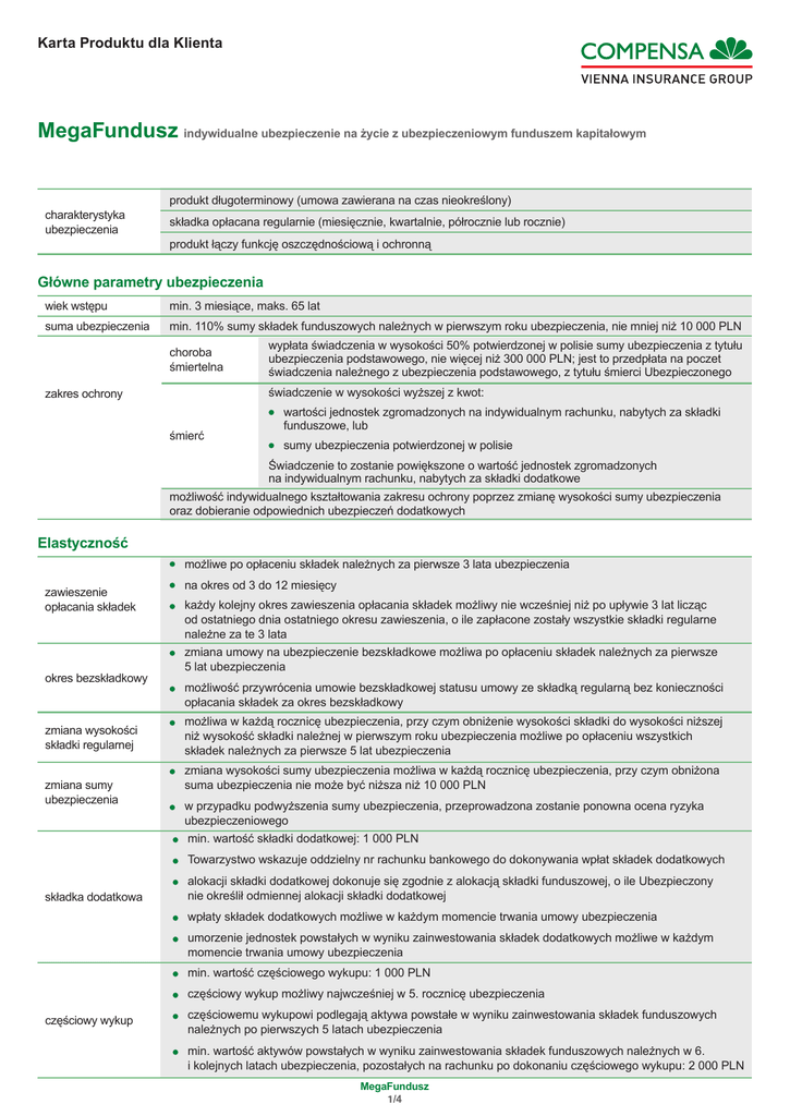 Karta Produktu dla Klienta MegaFundusz indywidualne ubezpieczenie na życie z ubezpieczeniowym funduszem kapitałowym charakterystyka ubezpieczenia produkt długoterminowy (umowa zawierana na czas nieokreślony) składka opłacana regularnie (miesięcznie, kwartalnie, półrocznie lub rocznie) produkt łączy funkcję oszczędnościową i ochronną Główne parametry ubezpieczenia wiek wstępu min. 3 miesiące, maks. 65 lat suma ubezpieczenia min. 110% sumy składek funduszowych należnych w pierwszym roku ubezpieczenia, nie mniej niż 10 000 PLN choroba śmiertelna wypłata świadczenia w wysokości 50% potwierdzonej w polisie sumy ubezpieczenia z tytułu ubezpieczenia podstawowego, nie więcej niż 300 000 PLN; jest to przedpłata na poczet świadczenia należnego z ubezpieczenia podstawowego, z tytułu śmierci Ubezpieczonego świadczenie w wysokości wyższej z kwot: zakres ochrony śmierć wartości jednostek zgromadzonych na indywidualnym rachunku, nabytych za składki funduszowe, lub sumy ubezpieczenia potwierdzonej w polisie Świadczenie to zostanie powiększone o wartość jednostek zgromadzonych na indywidualnym rachunku, nabytych za składki dodatkowe możliwość indywidualnego kształtowania zakresu ochrony poprzez zmianę wysokości sumy ubezpieczenia oraz dobieranie odpowiednich ubezpieczeń dodatkowych Elastyczność możliwe po opłaceniu składek należnych za pierwsze 3 lata ubezpieczenia zawieszenie opłacania składek okres bezskładkowy zmiana wysokości składki regularnej zmiana sumy ubezpieczenia na okres od 3 do 12 miesięcy każdy kolejny okres zawieszenia opłacania składek możliwy nie wcześniej niż po upływie 3 lat licząc od ostatniego dnia ostatniego okresu zawieszenia, o ile zapłacone zostały wszystkie składki regularne należne za te 3 lata zmiana umowy na ubezpieczenie bezskładkowe możliwa po opłaceniu składek należnych za pierwsze 5 lat ubezpieczenia możliwość przywrócenia umowie bezskładkowej statusu umowy ze składką regularną bez konieczności opłacania składek za okres bezskładkowy możliwa w każdą rocznicę ubezpieczenia, przy czym obniżenie wysokości składki do wysokości niższej niż wysokość składki należnej w pierwszym roku ubezpieczenia możliwe po opłaceniu wszystkich składek należnych za pierwsze 5 lat ubezpieczenia zmiana wysokości sumy ubezpieczenia możliwa w każdą rocznicę ubezpieczenia, przy czym obniżona suma ubezpieczenia nie może być niższa niż 10 000 PLN w przypadku podwyższenia sumy ubezpieczenia, przeprowadzona zostanie ponowna ocena ryzyka ubezpieczeniowego min. wartość składki dodatkowej: 1 000 PLN Towarzystwo wskazuje oddzielny nr rachunku bankowego do dokonywania wpłat składek dodatkowych składka dodatkowa alokacji składki dodatkowej dokonuje się zgodnie z alokacją składki funduszowej, o ile Ubezpieczony nie określił odmiennej alokacji składki dodatkowej wpłaty składek dodatkowych możliwe w każdym momencie trwania umowy ubezpieczenia umorzenie jednostek powstałych w wyniku zainwestowania składek dodatkowych możliwe w każdym momencie trwania umowy ubezpieczenia min. wartość częściowego wykupu: 1 000 PLN częściowy wykup możliwy najwcześniej w 5. rocznicę ubezpieczenia częściowy wykup częściowemu wykupowi podlegają aktywa powstałe w wyniku zainwestowania składek funduszowych należnych po pierwszych 5 latach ubezpieczenia min. wartość aktywów powstałych w wyniku zainwestowania składek funduszowych należnych w 6. i kolejnych latach ubezpieczenia, pozostałych na rachunku po dokonaniu częściowego wykupu: 2 000 PLN MegaFundusz 1/4 możliwość złożenia wniosku o wypłatę świadczenia inwestycyjnego po upływie okresu przysługującego Ubezpieczającemu na odstąpienie od umowy ubezpieczenia świadczenie inwestycyjne wartość świadczenia inwestycyjnego to kwota pieniężna obliczona jako suma kwot powstałych w wyniku umorzenia jednostek zgromadzonych na indywidualnym rachunku zakupionych za: 1. składki funduszowe należne za okres pierwszych 5 lat ubezpieczenia pomnożone przez wartość współczynnika świadczenia inwestycyjnego obowiązującą w danym roku ubezpieczenia, oraz 2. składki funduszowe należne za okres od 6. roku ubezpieczenia, oraz 3. składki dodatkowe jeżeli wniosek o wypłatę świadczenia inwestycyjnego wpłynie po 10. rocznicy ubezpieczenia lub po rocznicy przypadającej w roku kalendarzowym, w którym Ubezpieczony kończy 65 lat, stosuje się współczynnik świadczenia inwestycyjnego równy 100% dokonanie wypłaty świadczenia inwestycyjnego skutkuje rozwiązaniem umowy ubezpieczenia obsługa przez Internet ubezpieczeniowe fundusze kapitałowe możliwość złożenia dyspozycji zmiany alokacji składki lub konwersji jednostek za pośrednictwem portalu mojaCompensa.pl (https://mojacompensa.pl) możliwość alokacji składki w fundusze z wyceną dzienną, nominowane w PLN, USD i EUR do wyboru fundusze akcyjne, zrównoważone, bezpieczne i fundusz gwarantowany Opłaty pobierane z indywidualnego rachunku za obsługę umowy ubezpieczenia za prowadzenie indywidualnego rachunku 8 PLN miesięcznie pobierana miesięcznie jako procent wartości aktywów powstałych w wyniku zainwestowania wpłaconych składek funduszowych i składek dodatkowych, zróżnicowany ze względu na sumę składek funduszowych należnych w pierwszym roku ubezpieczenia i wynosi odpowiednio: wysokość miesięcznej opłaty suma składek funduszowych wysokość miesięcznej opłaty zmniejszonej o połowę po należnych w pierwszym roku w pierwszych 10 latach trwania pierwszych 10 latach trwania ubezpieczenia umowy ubezpieczenia umowy ubezpieczenia do 2 399 PLN 0,16% 0,08% 2 400 PLN - 3 599 PLN 0,14% 0,07% 3 600 PLN - 5 999 PLN 0,12% 0,06% 6 000 PLN - 11 999 PLN 0,09% 0,045% od 12 000 PLN 0,05% 0,025% z tytułu konwersji jednostek pierwsze 12 konwersji w każdym roku ubezpieczenia: 0 PLN, każda następna konwersja w każdym roku ubezpieczenia: 10 PL