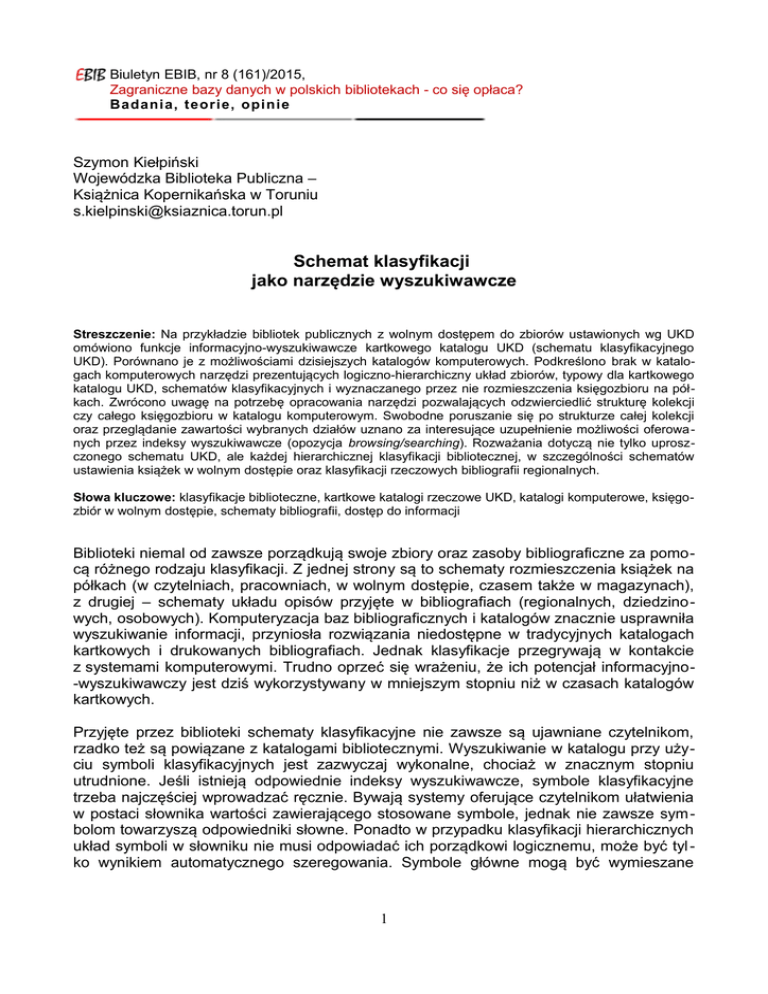 Biuletyn EBIB, nr 8 (161)/2015, Zagraniczne bazy danych w polskich bibliotekach - co się opłaca? Badania, teorie, opinie Szymon Kiełpiński Wojewódzka Biblioteka Publiczna – Książnica Kopernikańska w Toruniu [email protected] Schemat klasyfikacji jako narzędzie wyszukiwawcze Streszczenie: Na przykładzie bibliotek publicznych z wolnym dostępem do zbiorów ustawionych wg UKD omówiono funkcje informacyjno-wyszukiwawcze kartkowego katalogu UKD (schematu klasyfikacyjnego UKD). Porównano je z możliwościami dzisiejszych katalogów komputerowych. Podkreślono brak w katalogach komputerowych narzędzi prezentujących logiczno-hierarchiczny układ zbiorów, typowy dla kartkowego katalogu UKD, schematów klasyfikacyjnych i wyznaczanego przez nie rozmieszczenia księgozbioru na półkach. Zwrócono uwagę na potrzebę opracowania narzędzi pozwalających odzwierciedlić strukturę kolekcji czy całego księgozbioru w katalogu komputerowym. Swobodne poruszanie się po strukturze całej kolekcji oraz przeglądanie zawartości wybranych działów uznano za interesujące uzupełnienie możliwości oferowa nych przez indeksy wyszukiwawcze (opozycja browsing/searching). Rozważania dotyczą nie tylko uproszczonego schematu UKD, ale każdej hierarchicznej klasyfikacji bibliotecznej, w szczególności schematów ustawienia książek w wolnym dostępie oraz klasyfikacji rzeczowych bibliografii regionalnych. Słowa kluczowe: klasyfikacje biblioteczne, kartkowe katalogi rzeczowe UKD, katalogi komputerowe, księgozbiór w wolnym dostępie, schematy bibliografii, dostęp do informacji Biblioteki niemal od zawsze porządkują swoje zbiory oraz zasoby bibliograficzne za pomocą różnego rodzaju klasyfikacji. Z jednej strony są to schematy rozmieszczenia książek na półkach (w czytelniach, pracowniach, w wolnym dostępie, czasem także w magazynach), z drugiej – schematy układu opisów przyjęte w bibliografiach (regionalnych, dziedzinowych, osobowych). Komputeryzacja baz bibliograficznych i katalogów znacznie usprawniła wyszukiwanie informacji, przyniosła rozwiązania niedostępne w tradycyjnych katalogach kartkowych i drukowanych bibliografiach. Jednak klasyfikacje przegrywają w kontakcie z systemami komputerowymi. Trudno oprzeć się wrażeniu, że ich potencjał informacyjno-wyszukiwawczy jest dziś wykorzystywany w mniejszym stopniu niż w czasach katalogów kartkowych. Przyjęte przez biblioteki schematy klasyfikacyjne nie zawsze są ujawniane czytelnikom, rzadko też są powiązane z katalogami bibliotecznymi. Wyszukiwanie w katalogu przy użyciu symboli klasyfikacyjnych jest zazwyczaj wykonalne, chociaż w znacznym stopniu utrudnione. Jeśli istnieją odpowiednie indeksy wyszukiwawcze, symbole klasyfikacyjne trzeba najczęściej wprowadzać ręcznie. Bywają systemy oferujące czytelnikom ułatwienia w postaci słownika wartości zawierającego stosowane symbole, jednak nie zawsze sym bolom towarzyszą odpowiedniki słowne. Ponadto w przypadku klasyfikacji hierarchicznych układ symboli w słowniku nie musi odpowiadać ich porządkowi logicznemu, może być tyl ko wynikiem automatycznego szeregowania. Symbole główne mogą być wymieszane 1 Biuletyn EBIB, nr 8 (161)/2015, Zagraniczne bazy danych w polskich bibliotekach - co się opłaca? Badania, teorie, opinie z symbolami szczegółowymi. Poruszanie się po samym schemacie klasyfikacyjnym, przechodzenie do działów podrzędnych czy nadrzędnych, przeglądanie zbiorów na podstawie struktury schematu jest właściwie niemożliwe. Znamienna jest sytuacja opisana w instrukcji zamieszczonej na stronie internetowej jednej z bibliotek (pisownia i wyróżnienie oryginalne): Książki w Czytelni uporządkowane są na półkach wg klasyfikacji tematycznej Library of Congress. […] Oznaczenie klasyfikacji jest sygnaturą miejsca. Dokładną sygnaturę każdej książki można znaleźć w katalogu komputerowym w rekordzie egzemplarza. Aby zobaczyć w katalogu komputerowym jakie książki znajdują się w danym dziale, należy wprowadzić jako termin wyszukiwawczy w indeksie sygnatur oznaczenie klasyfikacji wg poniższych schematów [...]1. Autor przytoczonej instrukcji uznał za rzecz istotną dla czytelnika możliwość zapoznania się z zawartością konkretnego działu z poziomu katalogu komputerowego. Jednak zaspokojenie takiej potrzeby informacyjnej wymaga od czytelnika sporej wiedzy i umiejętności, odpowiednich kompetencji wyszukiwawczych 2. Czy udostępnienie listy symboli klasyfikacyjnych i wskazanie odpowiedniego indeksu wyszukiwawczego to wszystko, co możemy dziś zaproponować czytelnikowi w zakresie wykorzystania schematów klasyfikacyjnych jako narzędzi wyszukiwawczych w katalogach bibliotecznych? Czy schemat rozmieszczenia księgozbioru na półkach lub opisów bibliograficznych w drukowanej bibliografii to cały potencjał informacyjno-wyszukiwawczy bibliotecznych klasyfikacji? Artykuł kontynuuje i rozszerza rozważania podjęte już wcześniej przez autora3. Jak było? – kartkowy katalog UKD Dobrym przykładem do analizy interesujących nas zagadnień jest Uniwersalna Klasyfikacja Dziesiętna i oparty na niej kartkowy katalog rzeczowy. Obok katalogu alfabetycznego był on do niedawna jednym z najważniejszych narzędzi informacyjno-wyszukiwawczych w wielu typach bibliotek. Z uwagi na rozpowszechnienie tych placówek oraz specyfikę organizacji ich księgozbioru, zakładającej przynajmniej częściowy wolny dostęp do zbiorów, w rozważaniach ograniczę się tylko do bibliotek publicznych. Powszechna obecność klasyfikacji dziesiętnej w polskich bibliotekach różnych typów ma już blisko 70-letnią tradycję. W 1947 r. na mocy zarządzeń wydanych przez Ministra 1 Klasyfikacja [on-line]. Kraków: Biblioteka i Fonoteka Instytutu Muzykologii UJ, 2015 [dostęp 10.11.2015]. Dostępny w: http://www.biblioteka.muzykologia.uj.edu.pl/zbiory/klasyfikacja. 2 Czytelnik musi wiedzieć, co to jest sygnatura miejsca, oznac