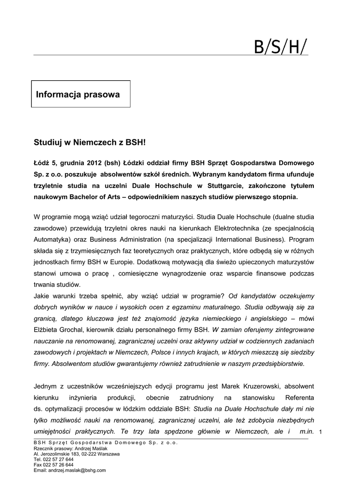 Informacja prasowa Studiuj w Niemczech z BSH! Łódż 5, grudnia 2012 (bsh) Łódzki oddział firmy BSH Sprzęt Gospodarstwa Domowego Sp. z o.o. poszukuje absolwentów szkół średnich. Wybranym kandydatom firma ufunduje trzyletnie studia na uczelni Duale Hochschule w Stuttgarcie, zakończone tytułem naukowym Bachelor of Arts – odpowiednikiem naszych studiów pierwszego stopnia. W programie mogą wziąć udział tegoroczni maturzyści. Studia Duale Hochschule (dualne studia zawodowe) przewidują trzyletni okres nauki na kierunkach Elektrotechnika (ze specjalnością Automatyka) oraz Business Administration (na specjalizacji International Business). Program składa się z trzymiesięcznych faz teoretycznych oraz praktycznych, które odbędą się w różnych jednostkach firmy BSH w Europie. Dodatkową motywacją dla świeżo upieczonych maturzystów stanowi umowa o pracę , comiesięczne wynagrodzenie oraz wsparcie finansowe podczas trwania studiów. Jakie warunki trzeba spełnić, aby wziąć udział w programie? Od kandydatów oczekujemy dobrych wyników w nauce i wysokich ocen z egzaminu maturalnego. Studia odbywają się za granicą, dlatego kluczowa jest też znajomość języka niemieckiego i angielskiego – mówi Elżbieta Grochal, kierownik działu personalnego firmy BSH. W zamian oferujemy zintegrowane nauczanie na renomowanej, zagranicznej uczelni oraz aktywny udział w codziennych zadaniach zawodowych i projektach w Niemczech, Polsce i innych krajach, w których mieszczą się siedziby firmy. Absolwentom studiów gwarantujemy również zatrudnienie w naszym przedsiębiorstwie. Jednym z uczestników wcześniejszych edycji programu jest Marek Kruzerowski, absolwent kierunku inżynieria produkcji, obecnie zatrudniony na stanowisku Referenta ds. optymalizacji procesów w łódzkim oddziale BSH: Studia na Duale Hochschule dały mi nie tylko możliwość nauki na renomowanej, zagranicznej uczelni, ale też zdobycia niezbędnych umiejętności praktycznych. Te trzy lata spędzone głównie w Niemczech, ale i BSH Sprzęt Gospodarstwa Domowego Sp. z o.o. Rzecznik prasowy: Andrzej Maślak Al. Jerozolimskie 183, 02-222 Warszawa Tel. 022 57 27 644 Fax 022 57 26 644 Email: [email protected] m.in. 1 trzymiesięczna faza praktyczna w fabryce koncernu BSH w Turcji, to był świetny i bardzo rozwijający okres, nie tylko pod względem zawodowym. Dodatkowym atutem była oczywiście dla mnie perspektywa zatrudnienia w firmie po zakończeniu studiów. Wielu z moich rówieśników, którzy ukończyli studia, nie mogło liczyć na taki luksus. Aby wziąć udział w programie, należy zarejestrować się na stronie www.bsh-group.pl, w zakładce praca i kariera, a następnie https://bsh.talentfinder.pl/AdvertSearch.aspx. złożyć aplikację pod adresem Zgłoszenia można składać do poniedziałku, 17 grudnia. Firma BSH Lider polskiego i europejskiego rynku AGD firma BSH Sprzęt Gospodarstwa Domowego jest polską spółką-córką niemieckiego koncernu BSH Bosch und Siemens Hausgeräte GmbH z siedzibą w Monachium. Globalne roczne obroty wynoszą ponad 9,7 mld EUR, co daje mu jedną z najsilniejszych pozycji na światowym rynku urządzeń gospodarstwa domowego. BSH GmbH został utworzony w 1967 roku, jako joint venture pomiędzy firmami Robert Bosch GmbH a Siemens AG. Koncern posiada dziś na świecie 42 zakłady produkcyjne i ponad 70 oddziałów w 40 krajach oraz zatrudnia ponad 43.000 pracowników. Polska spółka-córka BSH Sprzęt Gospodarstwa Domowego – lider na rynku AGD w Polsce - w swoich trzech łódzkich fabrykach produkuje pralki, zmywarki, suszarki do ubrań oraz dystrybuuje sprzęt AGD marek Bosch, Siemens i Gaggenau. Spółka osiągnęła obroty w 2011 r. w kwocie 3,7 mld zł, z czego ok. 75% stanowił eksport. BSH zatrudnienia w Polsce ponad 2.000 osób. Łączna wartość inwestycji wyniosła na koniec 2011 roku ponad 275 mln euro. 2 BSH Sprzęt Gospodarstwa Domowego Sp. z o.o. Rzecznik prasowy: Andrzej Maślak Al. Jerozolimskie 183, 02-222 Warszawa Tel. 022 57 27 644 Fax 022 57 26 644 Email: [email protected]