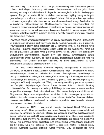 Urodziłem się 15 czerwca 1932 r. w podkrakowskiej wsi Sułkowice jako 8 dziecko Antoniego i Marianny. Wczesne dzieciństwo wspominam jako okres wesołej zabawy z rówieśnikami i biegania po rozległych polach i kwitnących łąkach. Ale już w wieku 8 lat musiałem rozpocząć ciężką pracę u innych gospodarzy by rodzice mogli nas wyżywić. Mając 18 lat pomimo sprzeciwu rodziców wyruszyłem do Krakowa w poszukiwaniu innej pracy. Znalazłem ją w Zakładzie Odlewniczym im. Szatkowskiego przy ul. Grzegórzeckiej. Od dyrektora otrzymałem jednoizbowe mieszkanie w baraku przeznaczonym do własnego remontu, a od pewnego kolejarza koksiak i worek węgla. Żeby osuszyć wilgotne wnętrze paliłem książki i gazety pilnując żeby nie zapaliła się drewniana podłoga. Pewnego ranka wróciłem zmęczony po pracy na nocnej zmianie i zapadłem w głęboki sen również pod wpływem czadu wydobywającego się z piecyka. Powracająca z pracy żona /ożeniłem się 27 kwietnia 1957 r./ nie mogła mnie dobudzić. Pomimo zaawansowanej ciąży udało jej się wyciągnąć mnie na świeże powietrze. Zaczęła mnie polewać zimną wodą. Dzięki tym zabiegom odzyskałem przytomność, czując silny ból głowy. Występujące torsje uratowały mi życie. Dodam, że obok baraku przechodzili ludzie ale nikt nie przystanął i nie udzielił pomocy leżącemu na ziemi człowiekowi. W tych warunkach, w baraku przebywaliśmy 14 lat. W roku 1970 władze Krakowa wydały zarządzenie o zburzeniu baraków, w których mieszkaliśmy. Otrzymaliśmy więc mieszkanie w nowo wybudowanym bloku na osiedlu Na Stoku. Początkowo tęskniliśmy za dobrymi sąsiadami, odległy stał się ogród botaniczny z kwitnącymi roślinami i rozłożystymi drzewami, już nie chodziliśmy pieszo na krakowskie planty lub brzegiem królowej naszych rzek Wisły, nie wstępowaliśmy podczas spaceru do Bazyliki Najświętszego Serca Pana Jezusa lub do Matki Boskiej u Karmelitów. Po pewnym czasie polubiliśmy jednak nasze nowe okolice w pobliżu dawnego Fortu Austriackiego. Na msze święte chodziliśmy do Grębałowa. Były one odprawiane w dużej izbie pewnego gospodarza. Większość ludzi stała na podwórzu pośród drzew, kwiatów i śpiewu ptaków, czułem się jakbym przebywał w rajskim ogrodzie. Ale bywały również deszczowe i mroźne niedziele. W czerwcu 1974 r. przyjechał Ksiądz Kardynał Karol Wojtyła na wizytację parafii. Sam poszedłem na mszę świętą, bo moja zona leżała od kwietnia w szpitalu w ciężkim stanie po operacji zrostów zastawkowych serca. Lekarze nie potrafili powiedzieć czy będzie żyła. Dwie inne pacjentki z tej samej Sali mówiły mi, że żona jest umierająca, że serce nie podejmie pracy i nie pomoże nawet aparatura pod którą leżała. Zrozpaczony modliłem się by dobry Bóg nie odbierał mi żony, a dzieciom matki. Podczas mszy świętej Komunii Świętej udzielał Karol Wojtyła. Gdy podszedł do mnie z Hostią, Ciałem i Krwią Pana Jezusa chwyciłem jego ręce trzymające kielich w swoje dłonie i wyszeptałem ze łzami w oczach: „RATUJ”. Ksiądz Kardynał zapytał: :Żona?”. Odpowiedziałem: „Tak, leży umierająca w szpitalu”. Wojtyła dodał: „Zaufaj Chrystusowi, On ci pomoże, a ja wieczorem będę się modlił i prosił o jej uzdrowienie”. Z nadzieją wróciłem do domu. Następnego dnia lekarze oznajmili mi, że żona musi mieć przeprowadzony zabieg na lewym płucu bo tam jest duży ropień. Po operacji żona poczuła się lepiej, zaczęła jeść i chodzić, a pod koniec września została wypisana ze szpitala. Wierzę głęboko w to, że pan Bóg wysłuchał modlitwy wstawiennicze Karola Wojtyły, bo żona zmarła 29 czerwca 2006 r., a pacjentki z którymi leżała po kilku dniach. Niezbadane są wyroki boskie. Czyżby cud miłosierdzia? Mieszkańcy osiedli Na Stoku i Wzgórzach Krzesławickich odczuwali coraz bardziej brak kościoła. Rozpoczęli więc starania o budowę świątyni zbierając podpisy i wysyłając je do Urzędu do Spraw Wyznań w Warszawie. Był rok 1974. Probostwo objął ksiądz Jakub Gil i to właśnie on po usilnych staraniach otrzymał zezwolenie na rozpoczęcie budowy kaplicy ale dopiero w 1978 r. Oddany pod budowę teren był bardzo nawodniony. Już w pierwszych dniach po rozpoczęciu prac w czerwcu 1979 r. dwa spychacze ugrzęzły w bagnistej ziemi i trzeba był sprowadzić wyciągarkę z Katowic. Ale żadne trudności nie zniechęcały mieszkańców, którzy garnęli się chętnie i dobrowolnie do pracy. Panowała radość duchowa, zapał i mobilizacja wszystkich sił. Najpierw kopano doły pod fundamenty stojąc w wodzie i błocie, czasami w strugach deszczu. Wbito 256 betonowych filarów długości 14 metrów, szerokości 50 cm. Ja pracowałem od początku jako cieśla. Bywały dni, gdy do pracy przychodziło 200 ochotników. O potrzebne materiały oraz specjalistyczny sprzęt budowlany starał się proboszcz, który nieustannie prosił Boga o pomoc w ukończeniu rozpoczętego dzieła. Udawało mu się też zdobyć pieniądze ze składek ludzi dobrej woli w kraju i zagranicą. Prace przebiegały w szybkim tempie, bo nad wszystkim czuwała łaska Jezusa Miłosiernego. Tego patrona dla parafii podpowiedział ksiądz Stanisław Dziwisz pod wpływem Ojca Świętego Jana Pawła II. W moim ukochanym Krakowie przeżyłem już 65 lat. Chwile radości przeplatały się z chwilami smutku. Tu przeżyłem najważniejsze i najcenniejsze wydarzenia w moim życiu. Dziękuję ci za piękny i wspaniały Krakowie. Władysław Piekara