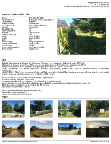 Magdalena Mierzyńska tel.: 510446057 email: [email protected] Sprzedaż Działka - BR001384 Cena: Powierzchnia: Lokalizacja: rodzaj działki: przeznaczenie: kształt: długość (m): szerokość (m): dojazd: teren uzbrojony: woda: prąd: gaz: kanalizacja: rodzaj własności: ogrodzenie: tereny rekreacyjne: drzewostan: 219 680,00 PLN 1 373,00 Metr kwadratowy Bojano budowlana bud. jednorodzinne; prostokąt 46 29 utwardzony tak przy działce przy działce tak miejska/gminna hipoteczna siatka las;jezioro;rzeka; częściowo Opis Działka budowlana w Bojanie ul. Sosnowe Wzgórze, przy granicy z Gdynią o pow. 1373m2. Otoczona pięknymi lasami w oddali oraz wśród zabudowy jednorodzinnej i rezydencjonalnej. Miejsce wyjątkowe, oaza spokoju z dogodnym dojazdem do Gdyni i Gdańska. Droga dojazdowa do działki wyłożona płytami betonowymi, działka jest płaska, nasłoneczniona w kształcie prostokąta. UZBROJENIE: PRAD- skrzynka na działce, WODA- w drodze, KANALIZA -budowa szamba (Gmina będzie realizowała projekt budowy sieci kanalizacyjnej w 2018r), GAZ- brak. BRAK PLANU ZAGOSPODAROWANIA PRZESTRZENNEGO: Wydane zostały warunki zabudowy: budowa budynku jednorodzinnego z możliwością podpiwniczenia, obiekt parterowy z możliwością użytkowego poddasza o wysokości od poziomu kalenicy max. 9m, dach dwu lub wielospadowy o spadku 25-45 stopni, powierzchnia zabudowy -30%. Oferta godna polecenia! Cena do negocjacji. Zapraszam na prezentację! www.nieruchomoscikamienica.pl Zdjęcia Dokument wygenerowany przez eKomako Makler Nieruchomości Data wydruku: 2017-03-02 20:49