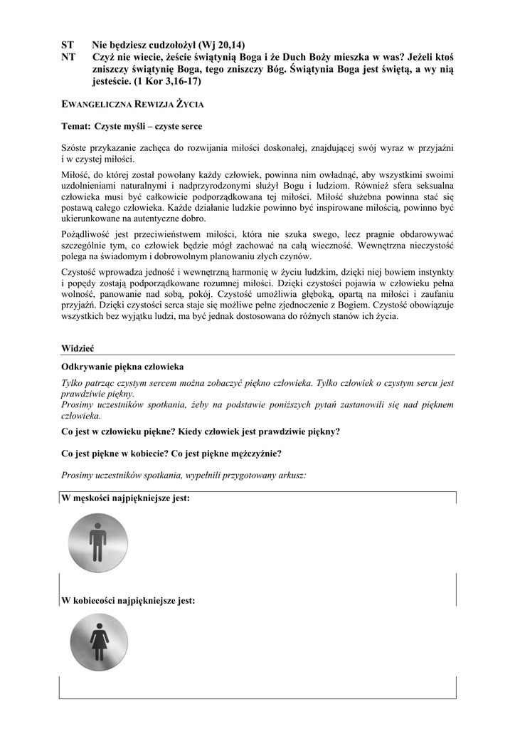 ST NT Nie będziesz cudzołożył (Wj 20,14) Czyż nie wiecie, żeście świątynią Boga i że Duch Boży mieszka w was? Jeżeli ktoś zniszczy świątynię Boga, tego zniszczy Bóg. Świątynia Boga jest świętą, a wy nią jesteście. (1 Kor 3,16-17) EWANGELICZNA REWIZJA ŻYCIA Temat: Czyste myśli – czyste serce Szóste przykazanie zachęca do rozwijania miłości doskonałej, znajdującej swój wyraz w przyjaźni i w czystej miłości. Miłość, do której został powołany każdy człowiek, powinna nim owładnąć, aby wszystkimi swoimi uzdolnieniami naturalnymi i nadprzyrodzonymi służył Bogu i ludziom. Również sfera seksualna człowieka musi być całkowicie podporządkowana tej miłości. Miłość służebna powinna stać się postawą całego człowieka. Każde działanie ludzkie powinno być inspirowane miłością, powinno być ukierunkowane na autentyczne dobro. Pożądliwość jest przeciwieństwem miłości, która nie szuka swego, lecz pragnie obdarowywać szczególnie tym, co człowiek będzie mógł zachować na całą wieczność. Wewnętrzna nieczystość polega na świadomym i dobrowolnym planowaniu złych czynów. Czystość wprowadza jedność i wewnętrzną harmonię w życiu ludzkim, dzięki niej bowiem instynkty i popędy zostają podporządkowane rozumnej miłości. Dzięki czystości pojawia w człowieku pełna wolność, panowanie nad sobą, pokój. Czystość umożliwia głęboką, opartą na miłości i zaufaniu przyjaźń. Dzięki czystości serca staje się możliwe pełne zjednoczenie z Bogiem. Czystość obowiązuje wszystkich bez wyjątku ludzi, ma być jednak dostosowana do różnych stanów ich życia. Widzieć Odkrywanie piękna człowieka Tylko patrząc czystym sercem można zobaczyć piękno człowieka. Tylko człowiek o czystym sercu jest prawdziwie piękny. Prosimy uczestników spotkania, żeby na podstawie poniższych pytań zastanowili się nad pięknem człowieka. Co jest w człowieku piękne? Kiedy człowiek jest prawdziwie piękny? Co jest piękne w kobiecie? Co jest piękne mężczyźnie? Prosimy uczestników spotkania, wypełnili przygotowany arkusz: W męskości najpiękniejsze jest: W kobiecości najpiękniejsze jest: Osądzić Dbanie o piękno człowieka – dbanie o jego czystość Jak dbać / walczyć o czystość? 1. Świadomość swoich słabości – jak to robić? „Jestem bowiem świadom, że we mnie, to jest w moim ciele, nie mieszka dobro; bo łatwo przychodzi mi chcieć tego, co dobre, ale wykonać – nie. Nie czynię bowiem dobra, którego chcę, ale czynię to zło, którego nie chcę.” (Rz 7,18n) 2. Oddanie się Duchowi Bożemu – jak to robić? „Oto, czego uczę: postępujcie według ducha, a nie spełnicie pożądania ciała. Ciało bowiem do czego innego dąży niż duch, a duch do czego innego niż ciało, i stąd nie ma między nimi zgody, tak że nie czynicie tego, co chcecie. Jeśli jednak pozwolicie się prowadzić duchowi, nie znajdziecie się w niewoli Prawa. A ci, którzy należą do Chrystusa Jezusa, ukrzyżowali ciało swoje z jego namiętnościami i pożądaniami. Mając życie od Ducha, do Ducha się też stosujmy.” (Ga 5, 16-18. 24-25) Działać Modlitwa – oddanie swojej czystości, wolności, miłości Bogu Pokrop mnie hizopem, a stanę się czysty, obmyj mnie, a nad śnieg wybieleję. Spraw, bym usłyszał radość i wesele: niech się radują kości, któreś skruszył! Odwróć oblicze swe od moich grzechów i wymaż wszystkie moje przewinienia! Stwórz, o Boże, we mnie serce czyste i odnów w mojej piersi ducha niezwyciężonego! Nie odrzucaj mnie od swego oblicza i nie odbieraj mi świętego ducha swego! Przywróć mi radość z Twojego zbawienia i wzmocnij mnie duchem ochoczym! (Ps 51, 9-14)