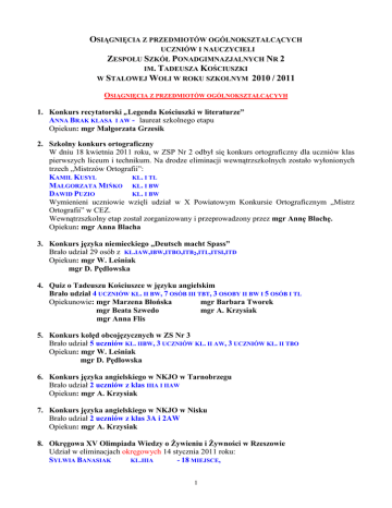 OSIĄGNIĘCIA Z PRZEDMIOTÓW OGÓLNOKSZTAŁCĄCYCH UCZNIÓW I NAUCZYCIELI ZESPOŁU SZKÓŁ PONADGIMNAZJALNYCH NR 2 IM. TADEUSZA KOŚCIUSZKI W STALOWEJ WOLI W ROKU SZKOLNYM 2010 / 2011 OSIĄGNIĘCIA Z PRZEDMIOTÓW OGÓLNOKSZTAŁCĄCYVH 1. Konkurs recytatorski „Legenda Kościuszki w literaturze” ANNA BRAK KLASA I AW - laureat szkolnego etapu Opiekun: mgr Małgorzata Grzesik 2. Szkolny konkurs ortograficzny W dniu 18 kwietnia 2011 roku, w ZSP Nr 2 odbył się konkurs ortograficzny dla uczniów klas pierwszych liceum i technikum. Na drodze eliminacji wewnątrzszkolnych zostało wyłonionych trzech „Mistrzów Ortografii”: KAMIL KUSYL KL. I TL MAŁGORZATA MIŃKO KL. I BW DAWID PUZIO KL. I BW Wymienieni uczniowie wzięli udział w X Powiatowym Konkursie Ortograficznym „Mistrz Ortografii” w CEZ. Wewnątrzszkolny etap został zorganizowany i przeprowadzony przez mgr Annę Blachę. Opiekun: mgr Anna Blacha 3. Konkurs języka niemieckiego „Deutsch macht Spass” Brało udział 29 osób z KL.IAW,IBW,ITBO,ITB2,ITL,ITSI,ITD Opiekun: mgr W. Leśniak mgr D. Pędlowska 4. Quiz o Tadeuszu Kościuszce w języku angielskim Brało udział 4 UCZNIÓW KL. II BW, 7 OSÓB III TBT, 3 OSOBY II BW I 5 OSÓB I TL Opiekunowie: mgr Marzena Błońska mgr Barbara Tworek mgr Beata Szwedo mgr A. Krzysiak mgr Anna Flis 5. Konkurs kolęd obcojęzycznych w ZS Nr 3 Brało udział 5 uczniów KL. IIBW, 3 UCZNIÓW KL. II AW, 3 UCZNIÓW KL. II TBO Opiekun: mgr W. Leśniak mgr D. Pędlowska 6. Konkurs języka angielskiego w NKJO w Tarnobrzegu Brało udział 2 uczniów z klas IIIA I IIAW Opiekun: mgr A. Krzysiak 7. Konkurs języka angielskiego w NKJO w Nisku Brało udział 2 uczniów z klas 3A i 2AW Opiekun: mgr A. Krzysiak 8. Okręgowa XV Olimpiada Wiedzy o Żywieniu i Żywności w Rzeszowie Udział w eliminacjach okręgowych 14 stycznia 2011 roku: SYLWIA BANASIAK KL.IIIA - 18 MIEJSCE, 1 ANNA WĘGLARZ KL.IIBW - 38 MIEJSCE. Opiekun: mgr Elżbieta Podgórska Makieła 9. Ogólnopolski Konkurs Geograficzny GEO-PLANETA W listopadzie 2010 roku odbył się szkolny etap Konkursu Geograficznego Geo-Planeta. W eliminacjach szkolnych uczestniczyły klasy 2TBS,2TD,2TIO,2TB2. W wyniku przeprowadzonych eliminacji (uczniowie pisali test z zakresu geografii fizycznej i społeczno-ekonomicznej Polski i świata) do ogólnopolskiego konkursu zakwalifikowało się 45 uczniów. W marcu 2011 roku ogłoszone zostały wyniki ogólnopolskie. Komitet Organizacyjny Konkursu Geograficznego Geo-Planeta wyróżnił 23 uczniów naszej szkoły. Otrzymali oni nagrody książkowe i dyplomy wyróżnienia: 1. CHCIUK MICHAŁ KL. II TBS 13. WOŁSZYN KATARZYNA KL. II TIO 2. ZŁOTEK DAMIAN KL. II TD 14. MULAWKA ŁUKASZ KL. II TIO 3. WĘZKA RAFAŁ KL. II TBS 15. SKOCZYLAS MATEUSZ KL. II TBS 4. KRASUCKA KATARZYNA KL. II TIO 16. ŚWIRCZ MARCIN KL. II TB2 5. PELIC ŁUKASZ KL. II TBS 17. PARYS WITOLD KL. II TD 6. KIEŁB MARCIN KL. II TIO 18. OCZAK NORBERT KL. II TB2 7. FOLTARZ MAGDALENA KL. II TIO 19. PAJĄK PRZEMEK KL. II TD 8. GOLA KLAUDIA KL. II TIO 20. STAŃKOWSKI PRZEMEK KL. II TD 9. BĄK KAROL KL. II TB2 21. ZIELIŃSKI WOJCIECH KL. II TBS 10. JURECKI KRZYSZTOF KL. II TB2 22. KUTYŁA KONRAD KL. II TD 11. KOZIOŁ ŁUKASZ KL. I TD 23. SZKUTNIK PATRYK KL. II TBS 12. WERMIŃSKA HALINA KL. II TIO Szkolny etap konkursu został zorganizowany i przeprowadzony przez mgr Annę Nowak Opiekun: mgr Anna Nowak 10. Okręgowa XV Olimpiada Wiedzy o Żywieniu i Żywności w Rzeszowie Udział w eliminacjach okręgowych 14 stycznia 2011 roku: SYLWIA BANASIAK KL.IIIA - 18 MIEJSCE, ANNA WĘGLARZ KL.IIBW - 38 MIEJSCE. Opiekun: mgr Elżbieta Podgórska Makieła 11. Konkurs plastyczny na najlepszy komiks pt. „Klasa ze snów” Uczeń z klasy II AW KONRAD RĘDZIA przeszedł do etapu centralnego. Konkurs został zorganizowany i przeprowadzony przez mgr Lidię Harasymów. Opiekun: mgr Lidia Harasymów 12. Konkurs „Mam Haka na Raka”. Wzięli w nim udział uczniowie klasy II AW: PATRYK HERDZIK KATARZYNA GUZIK , MATEUSZ Rębacz Michał Małys. Działania związane z tym konkursem, to: Własnoręczne przygotowanie ulotek na temat raka, audycja przez radiowęzeł szkolny, przeprowadzenie lekcji w oparciu o prezentacje multimedialne, współpraca z ZS Nr 5 w Nisku, przemarsz ulicami i zbieranie podpisów dotyczących przeprowadzonej akcji. Konkurs został zorganizowany i przeprowadzony przez mgr Lidię Harasymów. Opiekun: mgr Lidia Harasymów 13. Konkurs plastyczny z okazji Dni Ziemi pt. Szanujmy Matkę Ziemię. Etap szkolny W konkursie ekologicznym wzięli udział uczniowie z KL II AW. Następujący uczniowie zostali wyróżnieni: 2 SARZYNIAK JOANNA PIWOWAR DOMINIKA HARA EWELINA HOJŁO KORNELIA Konkurs został zorganizowany i przeprowadzony przez mgr Lidię Harasymów. Opiekun: mgr Lidia Harasymów 14. Konkurs "Radosne Obchody Święta Odzyskania Niepodległości" Został zorganizowany przez Kuratorium Oświaty w Rzeszowie. Nasza szkoła zajęła II miejsce wśród szkół ponadgimnazjalnych Opiekun: mgr Iwona Szewc 15. Konkurs wiedzy o Tadeuszu Kościuszce Szkolny etap konkursu wiedzy o Tadeuszu Kościuszce; ALEKSANDRA NOWAK Z KL. II TO zajęła I miejsce W finale tego konkursu, który był pod Patronatem Starostwa Powiatowego w Stalowej Woli, zajęła I miejsce uzyskując najwyższą ilość punktów. Opiekun: mgr Iwona Szewc 16. Konkurs fizyczny polsko – ukraiński „Lwiątko 2011” W konkursie z fizyki i astronomii brało udział 23 uczniów: 1. NOWAK MATEUSZ KL. I TBO 2. IGRAS MATEUSZ KL. I TBO 13. FOLTARZ MAGDALENA KL. II TIO 3. WARCHOŁ ALBERT KL. I TB2 14. PUZIO TOMASZ KL. II TB2 4. PUZIO DAWID KL. I A 15. JURECKI KRZYSZTOF KL. II TB2 5. DZIECHCIARZ KONRAD KL. I TBO 16. ŚWIRCZ MARCIN KL. II TB2 KL. I AW 17. ROJAN RAAŁ KL. II TB2 6. CICHOŃ MARIANNA 7. BRAK ANNA KL. I AW 18. BĄK KAROL KL. II TB2 8. BANACZYK RAFAŁ KL. I BW 19. MAZUR GRRZEGORZ KL. II TB2 9. CHOLEWIŃSKI MATEUSZ KL. I TBO 20. SARZYNIAK JOANNA KL. II AW 10. GUJDA PAWEŁ KL. II TB2 21. WOŁOSZYN JUSTYNA K