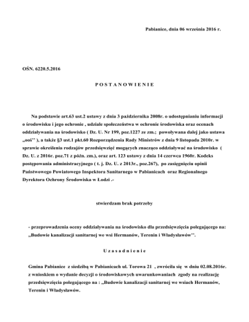 Pabianice, dnia 06 września 2016 r. OŚN. 6220.5.2016 POSTANOWIENIE Na podstawie art.63 ust.2 ustawy z dnia 3 października 2008r. o udostępnianiu informacji o środowisku i jego ochronie , udziale społeczeństwa w ochronie środowiska oraz ocenach oddziaływania na środowisko ( Dz. U. Nr 199, poz.1227 ze zm.; powoływana dalej jako ustawa ,,ooś’’ ), a także §3 ust.1 pkt.60 Rozporządzenia Rady Ministrów z dnia 9 listopada 2010r. w sprawie określenia rodzajów przedsięwzięć mogących znacząco oddziaływać na środowisko ( Dz. U. z 2016r. poz.71 z późn. zm.), oraz art. 123 ustawy z dnia 14 czerwca 1960r. Kodeks postępowania administracyjnego ( t. j. Dz. U. z 2013r., poz.267), po zasięgnięciu opinii Państwowego Powiatowego Inspektora Sanitarnego w Pabianicach oraz Regionalnego Dyrektora Ochrony Środowiska w Łodzi .- stwierdzam brak potrzeby - przeprowadzenia oceny oddziaływania na środowisko dla przedsięwzięcia polegającego na: ,,Budowie kanalizacji sanitarnej we wsi Hermanów, Terenin i Władysławów’’. Uzasadnienie Gmina Pabianice z siedzibą w Pabianicach ul. Torowa 21 , zwróciła się w dniu 02.08.2016r. z wnioskiem o wydanie decyzji o środowiskowych uwarunkowaniach zgody na realizację przedsięwzięcia polegającego na : ,,Budowie kanalizacji sanitarnej we wsiach Hermanów, Terenin i Władysławów. Do wniosku dołączono dokumenty wymienione w art. 74 ust.1 pkt 2,3,i 6 ustawy ooś. Pismem z dnia 04.08.2016r.znak OŚN.6220.5.2016, Wójt Gminy Pabianice, wystąpił do Państwowego Powiatowego Inspektora Sanitarnego w Pabianicach oraz Regionalnego Dyrektora Ochrony Środowiska w Łodzi z prośbą o wydanie opinii w sprawie konieczności sporządzenia raportu oddziaływania planowanego przedsięwzięcia na środowisko oraz ewentualne określenie jego zakresu. Państwowy Powiatowy Inspektor Sanitarny w Pabianicach ,w piśmie znak PPIS-Pb-ZNS470/64/16 z dnia 08.08.2016r. proponuje odstąpić od sporządzenia raportu o oddziaływaniu przedsięwzięcia na środowisko. Regionalny Dyrektor Ochrony Środowiska w Łodzi pismem znak. WOOŚI.4240.713.2016.PTa. z dnia 18 sierpnia 2016 r., uznał , że nie istnieje konieczność przeprowadzenia oceny oddziaływania na środowisko w/w przedsięwzięcia. Biorąc pod uwagę powyższe stanowiska oraz kierując się kryteriami zawartymi w art. 63 ust. 1 ustawy ,,ooś’’, Wójt Gminy Pabianice uznał , że nie jest konieczne przeprowadzenie oceny oddziaływania przedmiotowego przedsięwzięcia na środowisko argumentując to w przedstawiony poniżej sposób : Przedsięwzięcie będzie polegało na budowie kanalizacji sanitarnej podciśnieniowej w obrębie wsi: Hermanów , Terenin i Władysławów, gmina Pabianice. Planowana do budowy kanalizacja w systemie podciśnieniowym obejmuje: - rurociągi podciśnieniowe, przyłącza grawitacyjne, studnie zaworowe, grawitacyjne studzienki rewizyjne oraz maksymalnie 5 stacji napowietrzających, zlokalizowanych w poboczu drogi (szafka z zaworem napowietrzającym zasilana energią elektryczną połączona z siecią kanalizacji podciśnieniowej rurociągiem PE Dz90), - instalację podciśnieniowo - tłoczną zlokalizowaną na działce o numerze ewidencyjnej 265 (Terenin) do której będą odprowadzone ścieki z budynków mieszkalnych oraz osiedla Dolina Pabianki. - rurociąg tłoczny odprowadzający ścieki z instalacji podciśnieniowo - tłocznej do włączenia do istniejącego rurociągu tłocznego w drodze wojewódzkiej nr 485. Rurociągi projektowanej kanalizacji (o łącznej długości ok. 2,3 km) umieszczone będą pod powierzchnią terenu i nie spowodują stałego zajęcia nieruchomości. Zajęcie terenu wystąpi przez instalację podciśnieniowo-tłoczną w sieci kanalizacji podciśnieniowej. Elementami zagospodarowania terenu zajętego przez instalację podciśnieniowo-tłoczną będą: jednokondygnacyjny budynek oraz urządzenia (zbiorniki podciśnieniowe, przepompownia, biofiltr. studnia rozprężna, studnia zaworowa, tłocznia, agregat prądotwórczy} i rurociągi umieszczone w ziemi, teren zostanie wydzielony ogrodzeniem. Powierzchnie zajmowanej zabudowy instalacji podciśnieniowo-tłocznej wynosić ma nie więcej niż 400 m2. Projektowana kanalizacja zostanie ułożona w otwartych wykopach (a w niektórych miejscach metodami bezwykopowymi) na odpowiednio przygotowanym podłożu zgodnie z warunkami geologicznymi, na podsypce piaskowej. Przed rozpoczęciem robol ziemnych zdjęła zostanie warstwa humusu i odrębnie spryzmowania. Podglebie i głębsze warstwy gruntu będą odkładane na oddzielnych pryzmach. Po ułożeniu rurociągów zastosowane zostaną obsypki i zasypki warstwami, zagęszczane mechanicznie. Powyżej tego wykop będzie zasypany gruntem rodzimym lub dowiezionym, o ile rodzimy okaże się nieodpowiedni. Na zakończenie rozłożony zostanie humus (lub odtwarzana inna warstwa wierzchnia). W miejscach gdzie kanalizacja układana będzie w ciągach dróg, wykop nad obsypką zasypany zostanie gruntem niespoistym, tłuczniem lub kruszywem, a nad nim ułożona będzie podbudowa i nawierzchnia drogi. Odtworzenie nawierzchni dróg przeprowadzone zostanie zgodnie z warunkami technicznymi wydanymi przez zarządcę drogi. Kanalizacja wykonana zostanie z materiałów posiadających wymagane aprobaty techniczne oraz dopuszczenie do stosowania (deklarację zgodności wydaną przez dostawcę) na cały asortyment elementów użytych do budowy. Przewiduje się stosowanie następujących sposobów odwadniania wykopów: - w przypadku zawodnienia wykopu spowodowanego wodami opadowymi - odwodnienie metodą pompowania z wykopu, - w przypadku zawodnienia wykopu sączeniami wód gruntowych - odwodnienie z zastosowaniem igłofiltrów, - w przypadku wykopów w rejonach napływu wód gruntowych przewiduje się stosowanie ścianek szczelnych dla ograniczenia napływu wód do wykopu. Instalację podciśnieniowo-tłoczną przewidziano zlokalizować na części działki nr ewid. 26