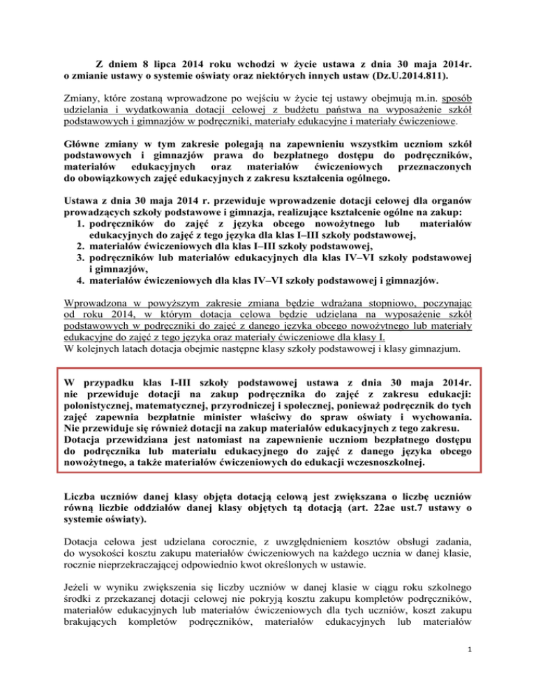 Z dniem 8 lipca 2014 roku wchodzi w życie ustawa z dnia 30 maja 2014r. o zmianie ustawy o systemie oświaty oraz niektórych innych ustaw (Dz.U.2014.811). Zmiany, które zostaną wprowadzone po wejściu w życie tej ustawy obejmują m.in. sposób udzielania i wydatkowania dotacji celowej z budżetu państwa na wyposażenie szkół podstawowych i gimnazjów w podręczniki, materiały edukacyjne i materiały ćwiczeniowe. Główne zmiany w tym zakresie polegają na zapewnieniu wszystkim uczniom szkół podstawowych i gimnazjów prawa do bezpłatnego dostępu do podręczników, materiałów edukacyjnych oraz materiałów ćwiczeniowych przeznaczonych do obowiązkowych zajęć edukacyjnych z zakresu kształcenia ogólnego. Ustawa z dnia 30 maja 2014 r. przewiduje wprowadzenie dotacji celowej dla organów prowadzących szkoły podstawowe i gimnazja, realizujące kształcenie ogólne na zakup: 1. podręczników do zajęć z języka obcego nowożytnego lub materiałów edukacyjnych do zajęć z tego języka dla klas I–III szkoły podstawowej, 2. materiałów ćwiczeniowych dla klas I–III szkoły podstawowej, 3. podręczników lub materiałów edukacyjnych dla klas IV–VI szkoły podstawowej i gimnazjów, 4. materiałów ćwiczeniowych dla klas IV–VI szkoły podstawowej i gimnazjów. Wprowadzona w powyższym zakresie zmiana będzie wdrażana stopniowo, poczynając od roku 2014, w którym dotacja celowa będzie udzielana na wyposażenie szkół podstawowych w podręczniki do zajęć z danego języka obcego nowożytnego lub materiały edukacyjne do zajęć z tego języka oraz materiały ćwiczeniowe dla klasy I. W kolejnych latach dotacja obejmie następne klasy szkoły podstawowej i klasy gimnazjum. W przypadku klas I-III szkoły podstawowej ustawa z dnia 30 maja 2014r. nie przewiduje dotacji na zakup podręcznika do zajęć z zakresu edukacji: polonistycznej, matematycznej, przyrodniczej i społecznej, ponieważ podręcznik do tych zajęć zapewnia bezpłatnie minister właściwy do spraw oświaty i wychowania. Nie przewiduje się również dotacji na zakup materiałów edukacyjnych z tego zakresu. Dotacja przewidziana jest natomiast na zapewnienie uczniom bezpłatnego dostępu do podręcznika lub materiału edukacyjnego do zajęć z danego języka obcego nowożytnego, a także materiałów ćwiczeniowych do edukacji wczesnoszkolnej. Liczba uczniów danej klasy objęta dotacją celową jest zwiększana o liczbę uczniów równą liczbie oddziałów danej klasy objętych tą dotacją (art. 22ae ust.7 ustawy o systemie oświaty). Dotacja celowa jest udzielana corocznie, z uwzględnieniem kosztów obsługi zadania, do wysokości kosztu zakupu materiałów ćwiczeniowych na każdego ucznia w danej klasie, rocznie nieprzekraczającej odpowiednio kwot określonych w ustawie. Jeżeli w wyniku zwiększenia się liczby uczniów w danej klasie w ciągu roku szkolnego środki z przekazanej dotacji celowej nie pokryją kosztu zakupu kompletów podręczników, materiałów edukacyjnych lub materiałów ćwiczeniowych dla tych uczniów, koszt zakupu brakujących kompletów podręczników, materiałów edukacyjnych lub materiałów 1 ćwiczeniowych jest refundowany ze środków dotacji celowej przekazanej na kolejny rok szkolny (art. 22ae ust. 10 ustawy o systemie oświaty). Prawo do bezpłatnego dostępu do podręczników, materiałów edukacyjnych lub materiałów ćwiczeniowych, w brzmieniu nadanym niniejszą ustawą, uczniowie szkół podstawowych i gimnazjów uzyskują, począwszy od roku szkolnego: 1) 2014/2015 - uczniowie klasy I szkoły podstawowej; 2) 2015/2016 - uczniowie klas II i IV szkoły podstawowej oraz klasy I gimnazjum; 3) 2016/2017 - uczniowie klas III i V szkoły podstawowej oraz klasy II gimnazjum; 4) 2017/2018 - uczniowie klasy VI szkoły podstawowej oraz klasy III gimnazjum. 1. Dotacja na zakup podręcznika do języka obcego nowożytnego lub materiałów edukacyjnych oraz zakup materiałów ćwiczeniowych do edukacji wczesnoszkolnej. Dotacja z budżetu państwa przewidziana jest na zapewnienie uczniom klas I–III szkoły podstawowej bezpłatnego dostępu do: podręcznika lub materiału edukacyjnego do zajęć z danego języka obcego nowożytnego do wysokości 25 zł na ucznia1), materiałów ćwiczeniowych do edukacji wczesnoszkolnej (do każdego z obowiązkowych obszarów tej edukacji, w tym nauki języka obcego nowożytnego) – do wysokości 50 zł na ucznia2). Dotacja na zakup materiałów ćwiczeniowych może być przeznaczona na różnego rodzaju materiały ćwiczeniowe przeznaczone do wszystkich obowiązkowych obszarów edukacji wczesnoszkolnej określonych w podstawie programowej kształcenia ogólnego. Biorąc pod uwagę sukcesywne, począwszy od roku szkolnego 2015/2016, wprowadzanie zmian w zakresie dotyczącym spełniania przez podręczniki dopuszczone do użytku szkolnego wymogu przygotowania ich w sposób umożliwiający korzystanie przez kolejne roczniki uczniów, w przypadku podręczników do zajęć z danego języka obcego nowożytnego dotacja w początkowym okresie będzie udzielana częściej niż raz na trzy lata. W roku szkolnym 2014/2015 – dla klasy I szkoły podstawowej, a w roku szkolnym 2015/2016 – ponownie dla klasy I oraz dla klasy II szkoły podstawowej, przy czym zakupione przez szkołę podręczniki powinny być już używane przez uczniów klasy I przez co najmniej dwa lata szkolne. Kolejna dotacja celowa na zakup podręczników do zajęć z danego języka obcego nowożytnego dla uczniów klasy I szkoły podstawowej będzie udzielana począwszy od 2017 r. – zakupione podręczniki będą musiały być już używane co najmniej przez trzy lata szkolne (art. 13 ust. 3 ustawy z dnia 30 maja 2014 r.). 1) Maksymalny koszt materiałów ćwiczeniowych może wynosić 24,75 zł (1% wykorzystanej dotacji jednostka samorządu terytorialnego otrzymuje na pokrycie kosztów obsługi zadania). 2) Maksymalny koszt materiałów ćwiczeniowych może wynosić 49