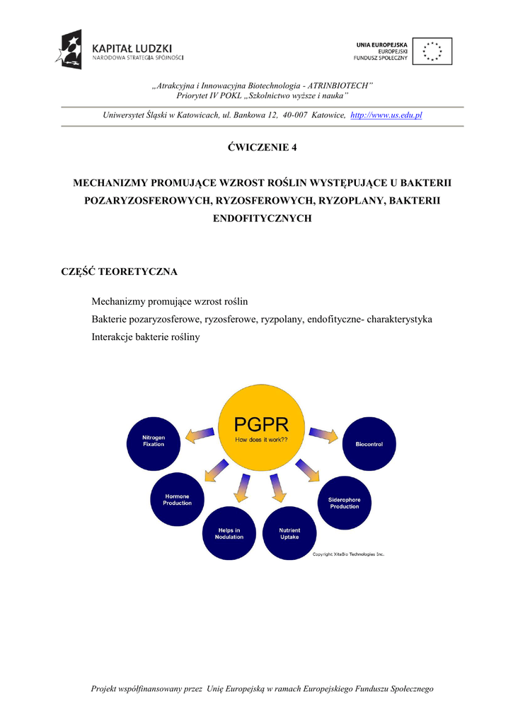 „Atrakcyjna i Innowacyjna Biotechnologia - ATRINBIOTECH” Priorytet IV POKL „Szkolnictwo wyższe i nauka” Uniwersytet Śląski w Katowicach, ul. Bankowa 12, 40-007 Katowice, http://www.us.edu.pl ĆWICZENIE 4 MECHANIZMY PROMUJĄCE WZROST ROŚLIN WYSTĘPUJĄCE U BAKTERII POZARYZOSFEROWYCH, RYZOSFEROWYCH, RYZOPLANY, BAKTERII ENDOFITYCZNYCH CZĘŚĆ TEORETYCZNA Mechanizmy promujące wzrost roślin Bakterie pozaryzosferowe, ryzosferowe, ryzpolany, endofityczne- charakterystyka Interakcje bakterie rośliny Projekt współfinansowany przez Unię Europejską w ramach Europejskiego Funduszu Społecznego „Atrakcyjna i Innowacyjna Biotechnologia - ATRINBIOTECH” Priorytet IV POKL „Szkolnictwo wyższe i nauka” Uniwersytet Śląski w Katowicach, ul. Bankowa 12, 40-007 Katowice, http://www.us.edu.pl CZĘŚĆ PRAKTYCZNA 1. Posiew wcześniej wyizolowanych bakterii pozaryzosferowych, ryzosferowych, ryzoplanu i endofitów na podłoża sprawdzające właściwości promujące wzrost roślin. Inkubację wszystkich podłoży przeprowadzić w temperaturze 28 oC przez 7 dni. a) Wytwarzanie sideroforów- podłoże CAS- posiew redukcyjny. Podłoże CAS jest niebieskie i zawiera jony żelaza Fe3+. Bakterie wydzielając do środowiska siderofory powodują wyłapywanie żelaza i usuwanie go z kompleksu jaki tworzy z barwnikiem chrome azurol S (CAS). Dlatego podłoże zmienia kolor. Pod wpływem wydzielanych sideroforów katecholowych zmienia barwę na fioletowy, a w przypadku wydzielania sideroforów hydroksamowych staje się żółto-pomarańczowe. b) Produkcja enzymów rozkładających ścianę komórkową fitopatogenów- podłoże z karboksymetylocelulozą (CMC)- posiew redukcyjny. CMC w podłożu jest jedynym źródłem węgla dla bakterii. Płyn Lugola łączy się z powstałymi po rozkładzie cukrami prostymi co powoduje, że podłoże barwi się na kolor żółty. Jeżeli CMC nie została rozłożona to wchodzi w reakcję z płynem Lugola i powstaje brązowo-czarne zabarwienie. Kompleks enzymatyczny- celulaza- rozkładający celulozę składa się z trzech głównych enzymów: endoglukanaza– hydrolizuje wiązania β -1,4 w środku łańcucha, egzoglukanaza– odłącza disacharyd celobiozę, celobiaza (βglukozydaza)– hydrolizuje disacharydy. c) Uwalnianie fosforu z jego nierozpuszczalnych związków- podłoże Pikowskaya agarposiew punktowy za pomocą sterylnej igły bakteriologicznej w trzech powtórzeniach na jednej płytce Petriego. Podłoże Pikowskaya zawiera Ca3(PO4)2 jako źródło nierozpuszczalnego fosforu. Wokół kolonii bakterii zdolnych do jego rozpuszczania powstają charakterystyczne strefy przejaśnień. Ich wielkość świadczy o zróżnicowanych zdolnościach do wydzielania kwasów organicznych a tym samym uwalniania fosforu. Projekt współfinansowany przez Unię Europejską w ramach Europejskiego Funduszu Społecznego „Atrakcyjna i Innowacyjna Biotechnologia - ATRINBIOTECH” Priorytet IV POKL „Szkolnictwo wyższe i nauka” Uniwersytet Śląski w Katowicach, ul. Bankowa 12, 40-007 Katowice, http://www.us.edu.pl Mikrobiologiczne rozpuszczanie nieorganicznych fosforanów to proces nieenzymatyczny. Mikroorganizmy produkują i wydzielają do środowiska kwasy organiczne obniżając w ten sposób pH gleby, w którym trudno dostępna forma fosforanu trójwapniowego (Ca3(PO4)2) przechodzi w formę bardziej dostępną dla roślin (fosforan dwuwapniowy i jednowapniowy). Najefektywniejsze mikroorganizmy (bakterie, grzyby, promieniowce) zdolne do uruchamiania fosforu glebowego z jego nierozpuszczalnych związków to PSM (ang. Phosphate Solubilizing Microorganisms). d) Produkcja kwasu indolilo-3-octowego (IAA, auksyna)- podłoże LB z dodatkiem tryptofanu (500 µg/ml)- posiew na podłoże płynne. Auksyny są hormonami spełniającymi wiele funkcji w roślinie. Jedną z najbardziej znanych auksyn jest IAA. Odpowiada za kontrolę i aktywację podziałów komórkowych oraz pobudzanie wzrostu wydłużeniowego tkanek. Jako prekursor w syntezie IAA bakterie mogą wykorzystywać tryptofan, indol, serynę, kwas antranilowy. Reakcja wykrywania IAA to reakcja barwna, gdzie intensywność różowo-czerwonego zabarwienia jest skorelowana ze stężeniem powstałego związku. e) Produkcja amoniaku- podłoże woda peptonowa- posiew na podłoże płynne. Amoniak jest łatwo przyswajalnym źródłem azotu dla roślin. Mikroorganizmy przeprowadzając proces amonifikacji rozkładają aminokwasy uwalniając między innymi amoniak jako produkt uboczny. f) Produkcja cyjanowodoru- podłoże z glicyną (4,4 g/l)- posiew na podłoże płynne. Bezpośrednim prekursorem cyjanowodoru jest glicyna, aminokwas który w dużej ilości jest wydzielany przez korzenie do ryzosfery. Reakcja barwna polega na zabarwieniu bibuły nasączonej Na2CO3 i kwasem pikrynowym na kolor brązowy. Projekt współfinansowany przez Unię Europejską w ramach Europejskiego Funduszu Społecznego „Atrakcyjna i Innowacyjna Biotechnologia - ATRINBIOTECH” Priorytet IV POKL „Szkolnictwo wyższe i nauka” Uniwersytet Śląski w Katowicach, ul. Bankowa 12, 40-007 Katowice, http://www.us.edu.pl 2. Określenie zdolności badanych szczepów do wzrostu na podłożu z ACC jako jedynym źródłem azotu oraz oznaczanie aktywności enzymu deaminazy ACC. Bakterie zdolne do wykorzystywania kwasu 1-aminocyklopropano-1-karboksylowego (ACC) wytwarzają enzym deaminazę ACC. Końcowym produktem reakcji hydrolizy ACC jest kwas α-ketomasłowy. Na podstawie ilości produktu końcowego wyznacza się aktywność enzymu deaminazy ACC. Posiać wyizolowane bakterie na podłoże płynne DF z ACC w stężeniu 3 mM. Projekt współfinansowany przez Unię Europejską w ramach Europejskiego Funduszu Społecznego