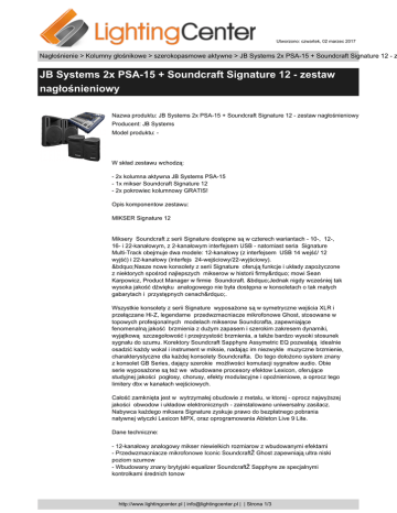 Utworzono: czwartek, 02 marzec 2017 Nagłośnienie > Kolumny głośnikowe > szerokopasmowe aktywne > JB Systems 2x PSA-15 + Soundcraft Signature 12 - z JB Systems 2x PSA-15 + Soundcraft Signature 12 - zestaw nagłośnieniowy Nazwa produktu: JB Systems 2x PSA-15 + Soundcraft Signature 12 - zestaw nagłośnieniowy Producent: JB Systems Model produktu: - W skład zestawu wchodzą: - 2x kolumna aktywna JB Systems PSA-15 - 1x mikser Soundcraft Signature 12 - 2x pokrowiec kolumnowy GRATIS! Opis komponentow zestawu: MIKSER Signature 12 Miksery Soundcraft z serii Signature dostępne są w czterech wariantach - 10-, 12-, 16- i 22-kanałowym, z 2-kanałowym interfejsem USB - natomiast seria Signature Multi-Track obejmuje dwa modele: 12-kanałowy (z interfejsem USB 14 wejść/ 12 wyjść) i 22-kanałowy (interfejs 24-wejściowy/22-wyjściowy). „Nasze nowe konsolety z serii Signature oferują funkcje i układy zapożyczone z niektorych spośrod najlepszych mikserow w historii firmy” mowi Sean Karpowicz, Product Manager w firmie Soundcraft. „Jednak nigdy wcześniej tak wysoka jakość dźwięku analogowego nie była dostępna w konsoletach o tak małych gabarytach i przystępnych cenach”. Wszystkie konsolety z serii Signature wyposażone są w symetryczne wejścia XLR i przełączane Hi-Z, legendarne przedwzmacniacze mikrofonowe Ghost, stosowane w topowych profesjonalnych modelach mikserow Soundcrafta, zapewniające fenomenalną jakość brzmienia z dużym zapasem i szerokim zakresem dynamiki, wyjątkową szczegołowość i przejrzystość brzmienia, a także bardzo wysoki stosunek sygnału do szumu. Korektory Soundcraft Sapphyre Assymetric EQ pozwalają idealnie osadzić każdy wokal i instrument w miksie, nadając im niezwykle muzyczne brzmienie, charakterystyczne dla każdej konsolety Soundcrafta. Do tego dołożono system znany z konsolet GB Series, dający szerokie możliwości komutacji sygnałow audio. Obie serie wyposażone są też we wbudowane procesory efektow Lexicon, oferujące studyjnej jakości pogłosy, chorusy, efekty modulacyjne i opoźnieniowe, a oprocz tego limitery dbx w kanałach wejściowych. Całość zamknięta jest w wytrzymałej obudowie z metalu, w ktorej - oprocz najwyższej jakości obwodow i układow elektronicznych - zainstalowano uniwersalny zasilacz. Nabywca każdego miksera Signature zyskuje prawo do bezpłatnego pobrania natywnej wtyczki Lexicon MPX, oraz oprogramowania Ableton Live 9 Lite. Dane techniczne: - 12-kanałowy analogowy mikser niewielkich rozmiarow z wbudowanymi efektami - Przedwzmacniacze mikrofonowe Iconic SoundcraftŽ Ghost zapewniają ultra niski poziom szumow - Wbudowany znany brytyjski equalizer SoundcraftŽ Sapphyre ze specjalnymi kontrolkami średnich tonow http://www.lightingcenter.pl | [email protected] | | Strona 1/3 Utworzono: czwartek, 02 marzec 2017 Nagłośnienie > Kolumny głośnikowe > szerokopasmowe aktywne > JB Systems 2x PSA-15 + Soundcraft Signature 12 - z JB Systems 2x PSA-15 + Soundcraft Signature 12 - zestaw nagłośnieniowy - Wielokrotnie nagradzany silnik efektow LexiconŽ zawiera m.in. Reverb, Delay, Chorus i modulacje dźwiękow. - dbxŽ Limiters (kompresory High-ratio) na kanałach wejściowych - 2-kanałowy interfejs USB umożliwia odtwarzanie i nagrywanie dźwięku - Przełącznik wejścia Hi-Z do gitar, basow i innych instrumentow - Filtry Hi-pass (low-cut) i zasilanie phantom 48V na wszystkich kanałach mikrofonowych - Gładkie suwaki najwyższej jakości - Solidna metalowa konstrukcja najwyższej jakości zapewnia niezawodność sprzętu na trasach koncertowych- Wbudowany uniwersalny zasilacz Szerokopasmowa kolumna aktywna PSA-15 - Profesjonalna aktywna kolumna głośnikowa do uniwersalnych zastosowań - Solidna, wytrzymała obudowa z polipropylenu - Technologia Bi-amp z oddzielnymi wzmacniaczami dla woofera i tweetera dla uzyskania maksymalnego efektu: woofer 245W + tweeter o mocy 55W RMS - korekcja barwy (treble,bass) - Aktywna 2-drożna zwrotnica - Idealna zarowno dla stałych instalacji i użytkowania przenośnego (wypożyczalni, mobilnych DJ, zespołow, szkoł itp. ... ) - Wyposażona w 15" głośnik niskotonowy o dużej mocy i 1,75 " driver wysokotonowy - 2 Symetryczne wejścia MIC + LINE z regulacją poziomu - Symetryczne wyjście LINE - Korekcja barwy i poziomu głośności - Niebieska dioda LED na przednim panelu wskazująca zasilanie - Wbudowane gwinty M8 do podwieszenia - Wbudowany adapter 35mm na statyw - Obudowa umożliwiająca postawienie kolumny jako monitor sceniczny - Wbudowane mocne uchwyty - Solidne gumowe nożki Informacja techniczna PSA-15: - Wzmacniacz tweetera: 55Wrms - Wzmacniacz głośnika: 245Wrms - Pasmo przenoszenia ( + /-3dB ): 40 - 20.000Hz - THD (1kHz / 1 W) : 0,10% - Czułość linii wejścia : 1V - Czułość wejścia micro : 15 mV - Impedancja wejśćia: 20 kohm - Stosunek S / R ( mic off ) : > 85dB - Niski EQ: + / -12dB @ 100Hz - Wysoki EQ: + / -12dB @ 10kHz - Chłodzenie: naturalne chłodzenie powietrzem - Wejście mikrofonowe : symetryczne / niesymetryczne XLR / Jack - Wejście liniowe : symetryczne / niesymetryczne XLR 3pin - Linie wyjścia: symetryczne / niesymetryczne XLR 3pin - Bezpiecznik ( 5x20mm ) : F5A / 250V - Zasilanie: 115Vac/60Hz 230VAC/50Hz - Wymiary WxSxG (mm) : 680 x 470x 400 - Waga (kg ): 23.3 http://www.lightingcenter.pl | [email protected] | | Strona 2/3 Utworzono: czwartek, 02 marzec 2017 Nagłośnienie > Kolumny głośnikowe > szerokopasmowe aktywne > JB Systems 2x PSA-15 + Soundcraft Signature 12 - z JB Systems 2x PSA-15 + Soundcraft Signature 12 - zestaw nagłośnieniowy Cena: 3667.00zł http://www.lightingcenter.pl | [email protected] | | Strona 3/3