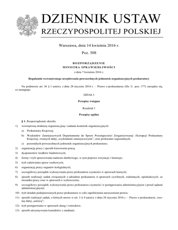 DZIENNIK USTAW RZECZYPOSPOLITEJ POLSKIEJ Warszawa, dnia 14 kwietnia 2016 r. Poz. 508 RO ZPO R ZĄ D ZE N I E M INI S TR A SPR AW I E DL I WO ŚC I z dnia 7 kwietnia 2016 r. Regulamin wewnętrznego urzędowania powszechnych jednostek organizacyjnych prokuratury Na podstawie art. 36 § 1 ustawy z dnia 28 stycznia 2016 r. – Prawo o prokuraturze (Dz. U. poz. 177) zarządza się, co następuje: DZIAŁ I Przepisy wstępne Rozdział 1 Przepisy ogólne § 1. Rozporządzenie określa: 1) wewnętrzną strukturę organizacyjną i zadania komórek organizacyjnych: a) Prokuratury Krajowej, b) Wydziałów Zamiejscowych Departamentu do Spraw Przestępczości Zorganizowanej i Korupcji Prokuratury Krajowej, zwanych dalej „wydziałami zamiejscowymi”, oraz prokuratur regionalnych, c) pozostałych powszechnych jednostek organizacyjnych prokuratury; 2) organizację pracy i sposób kierowania pracą; 3) dysponentów środków budżetowych; 4) formy i tryb sprawowania nadzoru służbowego, w tym poprzez wizytacje i lustracje; 5) tryb załatwiania spraw osobowych; 6) organizację pracy organów kolegialnych; 7) szczegółowy porządek wykonywania przez prokuratora czynności w sprawach karnych; 8) sposób realizacji zadań związanych z udziałem prokuratora w sprawach cywilnych, rodzinnych, opiekuńczych, ze stosunku pracy oraz w sprawach o wykroczenia; 9) szczegółowy porządek wykonywania przez prokuratora czynności w postępowaniu administracyjnym i przed sądami administracyjnymi; 10) tryb działań podejmowanych przez prokuratora w celu zapobieżenia naruszeniom prawa; 11) sposób realizacji zadań, o których mowa w art. 3 § 4 ustawy z dnia 28 stycznia 2016 r. – Prawo o prokuraturze, zwanej dalej „ustawą”; 12) tryb postępowania w sprawach skarg i wniosków; 13) sposób utrzymywania kontaktów z mediami. Dziennik Ustaw –2– Poz. 508 § 2. Właściwość prokuratora oznacza zakres jego czynności w jednostce organizacyjnej prokuratury, do której został powołany, chyba że niniejsze rozporządzenie stanowi inaczej. § 3. 1. Zadania związane ze współpracą powszechnej jednostki organizacyjnej prokuratury, zwanej dalej „jednostką”, z mediami wykonuje prokurator kierujący tą jednostką, lub naczelnik wydziału zamiejscowego, w zakresie spraw prowadzonych w wydziale. 2. Prokurator kierujący jednostką może powierzyć prokuratorowi wykonującemu czynności w tej jednostce pełnienie funkcji rzecznika prasowego. W prokuraturze rejonowej funkcję rzecznika prasowego pełni prokurator rejonowy. W uzasadnionych przypadkach prokurator okręgowy może powierzyć pełnienie funkcji rzecznika prasowego w prokuraturze rejonowej innemu prokuratorowi. 3. Zadania rzecznika prasowego określone w art. 39 § 2 ustawy mogą być realizowane w szczególności poprzez konferencje prasowe, udział w programach telewizyjnych i radiowych lub informacje prasowe. Realizacja tych zadań powinna prowadzić do budowania pozytywnego wizerunku prokuratury. Rozdział 2 Nazwy, tablice i pieczęcie urzędowe prokuratur § 4. 1. Nazwę prokuratury regionalnej, okręgowej i rejonowej ustala się zgodnie z nazwą miejscowości stanowiącej jej siedzibę. 2. Nazwę wydziału zamiejscowego ustala się zgodnie z nazwą regionu i miejscowości, w której siedzibę ma prokuratura regionalna, przy której dany wydział został utworzony. § 5. 1. Na zewnątrz budynku jednostki umieszcza się w widocznym miejscu tablicę z nazwą prokuratury oraz godłem państwowym. 2. Wewnątrz budynku umieszcza się tablicę informacyjną, wskazującą pełne nazwy komórek organizacyjnych danej jednostki, ich rozmieszczenie oraz dni i godziny przyjęć interesantów, a także godziny przyjęć kierownika jednostki wyższego stopnia. Informacje umieszczone na tablicy informacyjnej powinny być sformułowane w sposób łatwy do czytania i zrozumienia oraz, w miarę możliwości, dostępne również w alfabecie Braille’a. 3. W budynkach prokuratury powinien być zapewniony, w miarę możliwości, dostęp do pomieszczeń użytkowych w sposób umożliwiający korzystanie z nich osobom mającym ograniczone możliwości poruszania się oraz osobom z różnymi rodzajami niepełnosprawności. § 6. 1. Prokuratura Krajowa, prokuratury regionalne, okręgowe i rejonowe używają pieczęci urzędowych z nazwą jednostki i wizerunkiem orła określonym w ustawie z dnia 31 stycznia 1980 r. o godle, barwach i hymnie Rzeczypospolitej Polskiej oraz o pieczęciach państwowych (Dz. U. z 2005 r. poz. 2000, z późn. zm.1)). 2. Odpowiedzialność za prawidłowość posługiwania się pieczęciami wskazanymi w ust. 1 i za ich właściwe przechowywanie spoczywa na kierownikach sekretariatów danej jednostki. DZIAŁ II Organizacja prokuratury Rozdział 1 Wewnętrzna struktura organizacyjna powszechnych jednostek organizacyjnych prokuratury Oddział 1 Przepisy ogólne § 7. 1. Prokuratorzy wykonują samodzielnie zlecone im czynności na stanowiskach pracy lub samodzielnych stanowiskach pracy, których zakres ustala się rzeczowo lub terytorialnie. 1) Zmiany tekstu jednolitego wymienionej ustawy zostały ogłoszone w Dz. U. z 2006 r. poz. 1600, z 2009 r. poz. 1323, z 2010 r. poz. 96, z 2012 r. poz. 490 oraz z 2015 r. poz. 1045 i 1890. Dziennik Ustaw –3– Poz. 508 2. Łączenie stanowisk pracy w komórki organizacyjne jest wskazane wtedy, gdy liczba wpływających spraw przekracza możliwości sprawowania bezpośredniego nadzoru nad poszczególnymi stanowiskami pracy przez kierownika jednostki i jego zastępcę. § 8. Prokurator Generalny określi, w drodze zarządzenia, szczegółowe zadania i zakres nadzoru nad komórkami organizacyjnymi Prokuratury Krajowej wykonywanego przez Prokuratora Krajowego i pozostałych zastępców Prokuratora Generalnego. Oddział 2 Struktura organizacyjna i zadania realizowane w Prokuraturze Krajowej § 9. W skład Prokuratury Krajowej wchodzą następujące komórki organizacyjne: 1) Biuro Prezydialne; 2) Biuro Kadr; 3)
