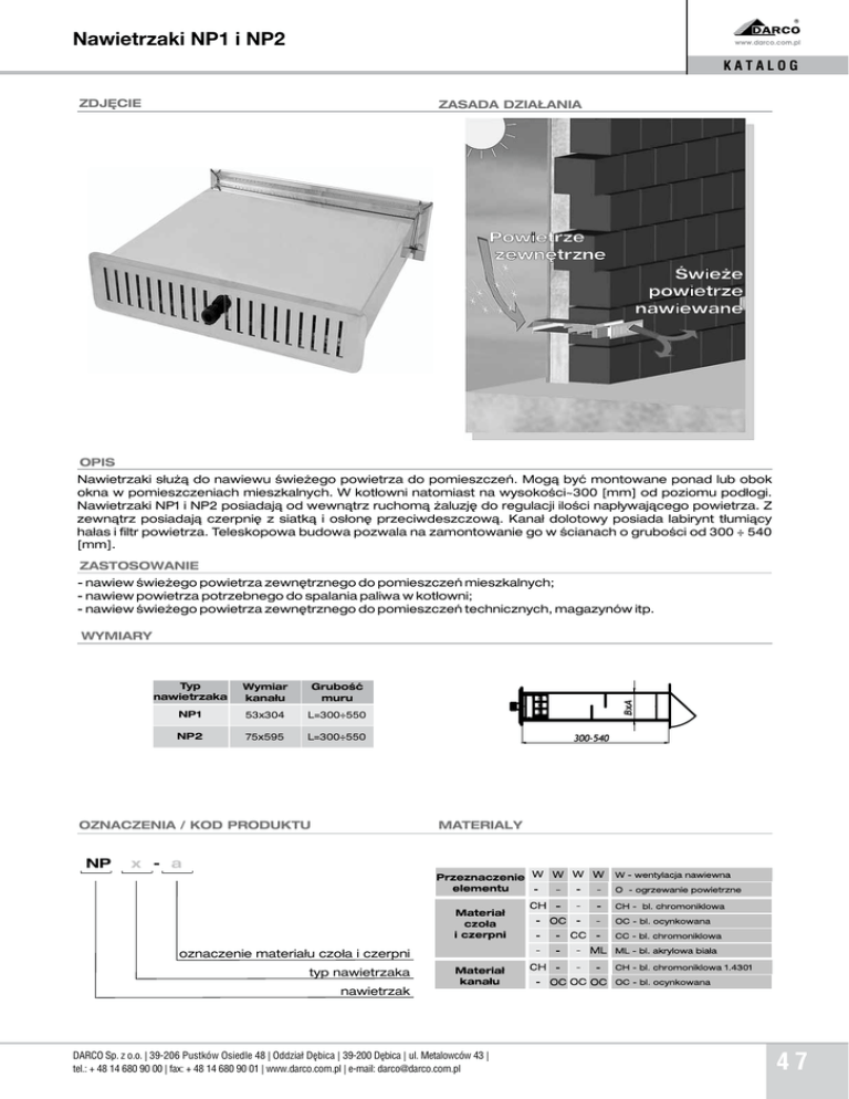 Nawietrzaki NP1 i NP2 KATALOG ZDJÊCIE ZASADA DZIA£ANIA Powietrze zewnêtrzne Œwie¿e powietrze nawiewane OPIS Nawietrzaki s³u¿¹ do nawiewu œwie¿ego powietrza do pomieszczeñ. Mog¹ byæ montowane ponad lub obok okna w pomieszczeniach mieszkalnych. W kot³owni natomiast na wysokoœci~300 [mm] od poziomu pod³ogi. Nawietrzaki NP1 i NP2 posiadaj¹ od wewn¹trz ruchom¹ ¿aluzjê do regulacji iloœci nap³ywaj¹cego powietrza. Z zewn¹trz posiadaj¹ czerpniê z siatk¹ i os³onê przeciwdeszczow¹. Kana³ dolotowy posiada labirynt t³umi¹cy ha³as i filtr powietrza. Teleskopowa budowa pozwala na zamontowanie go w œcianach o gruboœci od 300 ÷ 540 [mm]. ZASTOSOWANIE - nawiew œwie¿ego powietrza zewnêtrznego do pomieszczeñ mieszkalnych; - nawiew powietrza potrzebnego do spalania paliwa w kot³owni; - nawiew œwie¿ego powietrza zewnêtrznego do pomieszczeñ technicznych, magazynów itp. Typ nawietrzaka Wymiar Przekrój kana³u Gruboœæ muru NP1 57x305 53x304 L=300÷550 NP2 70x590 75x595 L=300÷550 OZNACZENIA / KOD PRODUKTU .NP BxA WYMIARY 300-540 MATERIALY x - a oznaczenie materia³u czo³a i czerpni typ nawietrzaka nawietrzak DARCO Sp. z o.o. | 39-206 Pustków Osiedle 48 | Oddział Dębica | 39-200 Dębica | ul. Metalowców 43 | tel.: + 48 14 680 90 00 | fax: + 48 14 680 90 01 | www.darco.com.pl | e-mail: [email protected] 47 Nawietrzaki NP1 i NP2 KATALOG NAWIETRZAKI - WERSJE 1. NAWIETRZAK NP1 NP1 540 2. NAWIETRZAK NP2 NP2 540 ZESTAWIENIE WYMIARÓW Wymiary [mm] Przekrój kana³u Przekrój czynny [cm²] [cm²] Lp Typ nawietrzaka A B C D E F G Waga [kg] 1 NP1 304 53 336 90 325 78 55 160 60 2.80 2 NP2 595 75 630 110 612 95 70 460 158 6.20 PRZEKRÓJ CZERPNIA Z SIATK¥ KANA£ TELESKOPOWY LABIRYNT T£UMI¥CY HA£AS 48 Wydanie Kwiecień 2012 FILTR CZO£O Z ¯ALUZJ¥ Nawietrzaki NP1 i NP2 KATALOG 140 120 Wydajnoœæ Q [m3/h] Wydajnoœæ Q [m3/h] CHARAKTERYSTYKI PRZEP£YWU NP1 100 80 60 250 NP2 200 150 100 40 50 20 0 0 20 40 60 80 100 120 140 160 180 200 Strata ciœnienia p [Pa] Wydajnoœæ nawietrzaka NP1 w funkcji ró¿nicy ciœnieñ. 0 20 40 60 80 100 120 140 160 180 200 Strata ciœnienia p [Pa] Wydajnoœæ nawietrzaka NP2 w funkcji ró¿nicy ciœnieñ. PRZYK£ADY REALIZACJI Kratka wywiewna Pokój Kuchnia lub WC Korytarz Komin wentylacyjny 0 Przep³yw powietrza wewn¹trz mieszkania po zamontowaniu nawietrzaka w pokoju i kratce wentylacyjnej w kuchni. Filtr Filtr Nawietrzak zamontowany w œcianie zewnêtrznej kot³owni. Nawietrzak z kana³em typu Z do nawiewu œwie¿ego powietrza do kot³owni umiejscowionej w piwnicy. DARCO Sp. z o.o. | 39-206 Pustków Osiedle 48 | Oddział Dębica | 39-200 Dębica | ul. Metalowców 43 | tel.: + 48 14 680 90 00 | fax: + 48 14 680 90 01 | www.darco.com.pl | e-mail: [email protected] 49