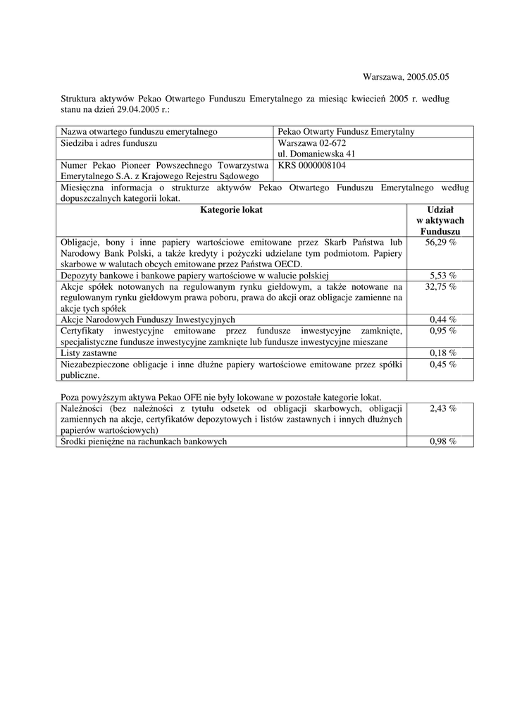 Warszawa, 2005.05.05 Struktura aktywów Pekao Otwartego Funduszu Emerytalnego za miesiąc kwiecień 2005 r. według stanu na dzień 29.04.2005 r.: Nazwa otwartego funduszu emerytalnego Siedziba i adres funduszu Pekao Otwarty Fundusz Emerytalny Warszawa 02-672 ul. Domaniewska 41 Numer Pekao Pioneer Powszechnego Towarzystwa KRS 0000008104 Emerytalnego S.A. z Krajowego Rejestru Sądowego Miesięczna informacja o strukturze aktywów Pekao Otwartego Funduszu Emerytalnego według dopuszczalnych kategorii lokat. Kategorie lokat Udział w aktywach Funduszu Obligacje, bony i inne papiery wartościowe emitowane przez Skarb Państwa lub 56,29 % Narodowy Bank Polski, a takŜe kredyty i poŜyczki udzielane tym podmiotom. Papiery skarbowe w walutach obcych emitowane przez Państwa OECD. Depozyty bankowe i bankowe papiery wartościowe w walucie polskiej 5,53 % Akcje spółek notowanych na regulowanym rynku giełdowym, a takŜe notowane na 32,75 % regulowanym rynku giełdowym prawa poboru, prawa do akcji oraz obligacje zamienne na akcje tych spółek Akcje Narodowych Funduszy Inwestycyjnych 0,44 % Certyfikaty inwestycyjne emitowane przez fundusze inwestycyjne zamknięte, 0,95 % specjalistyczne fundusze inwestycyjne zamknięte lub fundusze inwestycyjne mieszane Listy zastawne 0,18 % Niezabezpieczone obligacje i inne dłuŜne papiery wartościowe emitowane przez spółki 0,45 % publiczne. Poza powyŜszym aktywa Pekao OFE nie były lokowane w pozostałe kategorie lokat. NaleŜności (bez naleŜności z tytułu odsetek od obligacji skarbowych, obligacji zamiennych na akcje, certyfikatów depozytowych i listów zastawnych i innych dłuŜnych papierów wartościowych) Środki pienięŜne na rachunkach bankowych 2,43 % 0,98 %