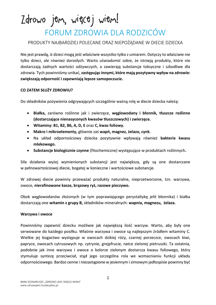 FORUM ZDROWIA DLA RODZICÓW PRODUKTY NAJBARDZIEJ POLECANE ORAZ NIEPOŻĄDANE W DIECIE DZIECKA Nie jest prawdą, iż dzieci mogą jeść właściwie wszystko tylko z umiarem. Dotyczy to właściwie nie tylko dzieci, ale również dorosłych. Warto uświadomić sobie, że istnieją produkty, które nie dostarczają żadnych wartości odżywczych, a zawierają substancje toksyczne i szkodliwe dla zdrowia. Tych powinniśmy unikać, zastępując innymi, które mają pozytywny wpływ na zdrowie: zwiększają odporność i zapewniają lepsze samopoczucie. CO ZATEM SŁUŻY ZDROWIU? Do składników pożywienia odgrywających szczególnie ważną rolę w diecie dziecka należą: • • • • • Białka, zarówno roślinne jak i zwierzęce, węglowodany i błonnik, tłuszcze roślinne (dostarczające nienasyconych kwasów tłuszczowych) i zwierzęce. Witaminy: B1, B2, B6, A, D, E oraz C, kwas foliowy. Makro i mikroelementy, głównie zaś wapń, magnez, żelazo, cynk. Na układ odpornościowy dziecka pozytywnie wpływają również bakterie kwasu mlekowego. Substancje biologicznie czynne (fitochemiczne) występujące w produktach roślinnych. Siła działania wyżej wymienionych substancji jest największa, gdy są one dostarczane w pełnowartościowej diecie, bogatej w konieczne i wartościowe substancje. W zdrowej diecie powinny przeważać produkty naturalne, nieprzetworzone, tzn. warzywa, owoce, nierafinowane kasze, brązowy ryż, razowe pieczywo. Obok węglowodanów złożonych (w tym poprawiającego perystaltykę jelit błonnika) i białka dostarczają one witamin z grupy B, składników mineralnych: wapnia, magnezu, żelaza. Warzywa i owoce Powinniśmy zapewnić dziecku możliwie jak największą ilość warzyw. Warto, aby były one serwowane do każdego posiłku. Właśnie warzywa i owoce są najlepszym źródłem witaminy C. Wielkie jej bogactwo występuje w owocach dzikiej róży, czarnej porzeczce, owocach kiwi, papryce, owocach cytrusowych np. cytrynie, grejpfrucie, natce zielonej pietruszki. Ta ostatnia, podobnie jak inne warzywa i owoce o kolorze zielonym dostarcza kwasu foliowego, który stymuluje syntezę przeciwciał, stąd jego szczególna rola we wzmacnianiu funkcji układu odpornościowego. Bardzo cenne i niezastąpione w jesiennym i zimowym jadłospisie powinny być BANK SCENARIUSZY „ZDROWO JEM, WIĘCEJ WIEM” www.zdrowojem.fundacjabos.pl 1 warzywa kwaszone, nie tylko kapusta, ale również buraki, selery. Dostarczają one witaminy C, jak również witamin z grupy B, zapewniają też korzystny skład bakterii w przewodzie pokarmowym. Nasiona roślin strączkowych Są bardzo dobrym źródłem białka roślinnego. Aby było ono w jak największym stopniu wykorzystywane przez organizm - groch, fasolę, soczewicę, powinno się jadać w połączeniu z kaszami, ryżem, kukurydzą. Warzywa strączkowe dostarczają też: wapnia fosforu, żelaza, witamin z grupy B, witaminy C. Ryby To doskonałe źródło kwasów omega-3, bardzo dobre źródło pełnowartościowego białka oraz witamin A i D. Obecność kwasów tłuszczowych wielonienasyconych bardzo służy zdrowiu, w szczególności zaś EPA i DHA wspomagają pracę mózgu. Zalecane jest, aby w diecie dziecka ryby występowały przynajmniej 2-3 razy w tygodniu. Cennym uzupełnieniem diety, z uwagi na bardzo dużą zawartość składników mineralnych i witamin powinny być zjadane codziennie: pestki dyni, słonecznika, migdały, orzechy. Mogą one zastąpić niepożądane ze względów zdrowotnych słodycze. Kefir, jogurt, fermentowane napoje mleczne W diecie dziecka stanowią one cenne źródło białka oraz wapnia, witaminy B2. Dostarczają one bardzo cennych i wskazanych w codziennej diecie probiotyków. Szczególna ich rola polega na wywieraniu korzystnego wpływu na organizm poprzez przywrócenie i zachowanie właściwej mikroflory jelitowej. Chronią przed przeziębieniami, pomagają zwalczać wiele chorób. Stanowią cenną alternatywę wobec mleka. Woda (najlepiej mineralna, niegazowana, niesłodzona) Woda jest najbardziej niezbędnym i niezastąpionym składnikiem diety. Nie zawiera kalorii, a młody organizm przyswaja ją najlepiej ze wszystkich napojów. Dzieci powinny pić przynajmniej około 1 l wody. Najlepsza jest woda średnio zmineralizowana z właściwą zawartością wapnia (powyżej 150 mg) i magnezu (powyżej 50 mg) na litr. Obok właściwego sposobu odżywiania dla zachowania zdrowia konieczna jest codzienna aktywność fizyczna. Warto wygospodarować przynajmniej pół godziny dziennie na spacer czy jogging na świeżym powietrzu. BANK SCENARIUSZY „ZDROWO JEM, WIĘCEJ WIEM” www.zdrowojem.fundacjabos.pl 2 PRODUKTY, KTÓRYCH LEPIEJ UNIKAĆ ALBO PRZYNAJMNIEJ OGRANICZYĆ Słodycze Szczególnie są to kolorowe żelki, ale również batoniki, ciasteczka, słodkie przekąski. Jak można się spodziewać, zawierają one całą gamę sztucznych substancji: barwników, aromatów, ulepszaczy, poprawiaczy smaku, środków konserwujących. Zawierają także przetworzony tłuszcz, przed którym ostrzegają lekarze i dietetycy. Duże ilości rafinowanego cukru powodują „ucieczkę” witamin oraz składników mineralnych z organizmu. Słodycze nie mogą w żadnym wypadku zastępować pełnowartościowego posiłku, jakim powinno być w szkole drugie śniadanie. Wszelkiego rodzaju fast- foody Szkodliwość fast-foodów wynika po pierwsze z ich składu: dużej ilości nasyconych tłuszczów, niskiej jakości węglowodanów, dużej zawartości soli, przy braku błonnika i korzystnych tłuszczów, a także olbrzymiej ilości kalorii. Fast-foody charakteryzują się tzw. dużą gęstością kaloryczną, czyli znaczną ilością kalorii w małej masie produktu. To one są odpowiedzialne za nadmierny przyrost wagi tych, którzy je polubili. Wartość odżywcza takiego posiłku jest bardzo niska. Podczas długotrwałej obróbki termicznej np. ziemniaków w tłuszczach dochodzi do powstawania wielu toksycznych związków, 