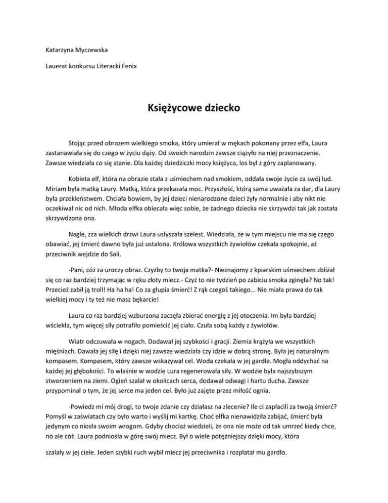 Katarzyna Myczewska Lauerat konkursu Literacki Fenix Księżycowe dziecko Stojąc przed obrazem wielkiego smoka, który umierał w mękach pokonany przez elfa, Laura zastanawiała się do czego w życiu dąży. Od swoich narodzin zawsze ciążyło na niej przeznaczenie. Zawsze wiedziała co się stanie. Dla każdej dziedziczki mocy księżyca, los był z góry zaplanowany. Kobieta elf, która na obrazie stała z uśmiechem nad smokiem, oddała swoje życie za swój lud. Miriam była matką Laury. Matką, która przekazała moc. Przyszłość, którą sama uważała za dar, dla Laury była przekleństwem. Chciała bowiem, by jej dzieci nienarodzone dzieci żyły normalnie i aby nikt nie oczekiwał nic od nich. Młoda elfka obiecała więc sobie, że żadnego dziecka nie skrzywdzi tak jak została skrzywdzona ona. Nagle, zza wielkich drzwi Laura usłyszała szelest. Wiedziała, że w tym miejscu nie ma się czego obawiać, jej śmierć dawno była już ustalona. Królowa wszystkich żywiołów czekała spokojnie, aż przeciwnik wejdzie do Sali. -Pani, cóż za uroczy obraz. Czyżby to twoja matka?- Nieznajomy z kpiarskim uśmiechem zbliżał się co raz bardziej trzymając w ręku złoty miecz.- Czyż to nie tydzień po zabiciu smoka zginęła? No tak! Przecież zabił ją troll! Ha ha ha! Co za głupia śmierć! Z rąk czegoś takiego... Nie miała prawa do tak wielkiej mocy i ty też nie masz bękarcie! Laura co raz bardziej wzburzona zaczęła zbierać energię z jej otoczenia. Im była bardziej wściekła, tym więcej siły potrafiło pomieścić jej ciało. Czuła sobą każdy z żywiołów. Wiatr odczuwała w nogach. Dodawał jej szybkości i gracji. Ziemia krążyła we wszystkich mięśniach. Dawała jej siłę i dzięki niej zawsze wiedziała czy idzie w dobrą stronę. Była jej naturalnym kompasem. Kompasem, który zawsze wskazywał cel. Woda czekała w jej gardle. Mogła oddychać na każdej jej głębokości. To właśnie w wodzie Lura regenerowała siły. W wodzie była najszybszym stworzeniem na ziemi. Ogień szalał w okolicach serca, dodawał odwagi i hartu ducha. Zawsze przypominał o tym, że jej serce ma jeden cel. Było już zajęte przez miłość ognia. -Powiedz mi mój drogi, to twoje zdanie czy działasz na zlecenie? Ile ci zapłacili za twoją śmierć? Pomyśl w zaświatach czy było warto i wyślij mi kartkę. Choć elfka nienawidziła zabijać, śmierć była jedynym co niosła swoim wrogom. Gdyby chociaż wiedzieli, że ona nie może od tak umrzeć kiedy chce, no ale cóż. Laura podniosła w górę swój miecz. Był o wiele potężniejszy dzięki mocy, która szalały w jej ciele. Jeden szybki ruch wybił miecz jej przeciwnika i rozpłatał mu gardło. Modlitwa, którą złożyła bogini za duszę przeciwnika, uspokoiła ją na tyle, by móc spokojnie oddychać. Stanowczym krokiem wyszła z Sali, widząc służącego kręcącego się po salach muzeum skrzywiła się. -Posprzątaj to, a hojnie cię wynagrodzę, tu masz połowę, reszta jutropowiedziała rzucając mu woreczek ze srebrnymi monetami przy wyjściu. *** -Nie! Nie zgadzam się! Nie będę z nią pracować- mocno wzburzony warknął Daniel.- Ona jest nienormalna. Jak możesz mnie w ogóle o to prosić. Twarz wyższego maga była spokojna, patrząc na swego najlepszego ucznia, a zarazem przyszłego następcę, nie miał wątpliwości, że dokonał słusznego wyboru. Nikt w gildii nie był na tylko odważny by oponować przed postawionym mu zadaniem, nawet tak trudnym jak to. - Danielu, to nie podlega dyskusji. Wiem, że Ty i Laura nie jesteście w zbyt przyjacielskich stosunkach… -Przyjacielskie stosunki, jakby było to możliwe z ta flądrą. Mistrz nie zważając na słowa swego ucznia mówił dalej. -…ale nie masz wyboru. Wasza misja stoi na pierwszym miejscu i bardzo cię proszę, nie zawiedź mnie- nachylając się nad dokumentami dał jednoznaczny sygnał, że rozmowa jest zakończona. Po chwili jednak usłyszał otwierane drzwi. Do gabinetu wchodził nie kto inny jak przyczyna sprzeczki z Danielem. Laura. -O kochana, jak miło cię widzieć. Właśnie omawiam z Danielem to, iż będziecie razem pracować, może się dołączysz do naszej dyskusji?- Laura z przerażeniem patrzyła na swego poczciwego wuja. - Chyba żartujesz, przecież wiesz, że nasza współpraca nie jest możliwaoburzenie i pogarda z jaką patrzyła na Daniela ubodła go. Co innego gdy on tak mówi, a co innego ona! - Mistrzu Akkarinie z radością będę współpracować z Laurą. Nawet sobie nie wyobrażasz jak cudownie będzie nam razem- z dwuznacznym uśmiechem pochylił się do Laury i szepnął- tylko ty możesz spełnić wszystkie warunki idealnego druha. - Proszę powiedz, że to żart, błagam- jęknęła elfka. - Kochana uspokój się proszę. Już postanowiłem. A teraz podejdźcie do mnie. Połączę wasze umysły. Będziecie mogli się ze sobą kontaktować. Każda wasza myśl stanie się myślą tej drugiej osoby, będzie Wam to potrzebne jeśli macie przeżyć. Młode elfy z wahaniem i strachem podchodziły do swego mistrza. Gdy Akkarin położył na ich głowach ręce świat nagle zawirował. Obojgu pociemniało w głowach i jak jeden mąż runęli na ziemię. `Hmmm- pomyślał starszy mag- chyba będą zgraną parą`. Nie zrażony leżącymi postaciami zaczął przeglądać dokumenty. *** Trzy dni po połączeniu umysłów Laura dalej nie mogła zdzierżyć tego, że dzieli swoje myśli z tak uparta, arogancka i wredna jaką był Daniel. -Kotku, nie obrażaj mnie, ja staram się być miły. Staram się przynajmniej- powiedział mag jadący obok na koniu.- A teraz te ważne sprawy. Dzisiaj musimy się zatrzymać w zajeździe koło lasu orków. Ty grzecznie pójdziesz spać, a ja… ja muszę coś załatwić. Laura prychnęła ze złości. Nie ma mowy, żeby jakiś niedorobiony człowieczek mówił jej co ma robić. Jeszcze tego by brakowało. Uśmiechając się pod nosem zaczęła nucić swoją ulubioną p