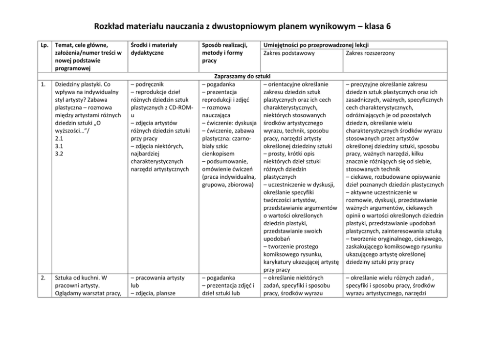 Rozkład materiału nauczania z dwustopniowym planem wynikowym – klasa 6 Lp. Temat, cele główne, założenia/numer treści w nowej podstawie programowej Środki i materiały dydaktyczne 1. Dziedziny plastyki. Co wpływa na indywidualny styl artysty? Zabawa plastyczna – rozmowa między artystami różnych dziedzin sztuki „O wyższości…”/ 2.1 3.1 3.2 – podręcznik – reprodukcje dzieł różnych dziedzin sztuk plastycznych z CD-ROMu – zdjęcia artystów różnych dziedzin sztuki przy pracy – zdjęcia niektórych, najbardziej charakterystycznych narzędzi artystycznych 2. Sztuka od kuchni. W pracowni artysty. Oglądamy warsztat pracy, – pracowania artysty lub – zdjęcia, plansze Sposób realizacji, metody i formy pracy Umiejętności po przeprowadzonej lekcji Zakres podstawowy Zakres rozszerzony Zapraszamy do sztuki – pogadanka – orientacyjne określanie – prezentacja zakresu dziedzin sztuk reprodukcji i zdjęć plastycznych oraz ich cech – rozmowa charakterystycznych, nauczająca niektórych stosowanych – ćwiczenie: dyskusja środków artystycznego – ćwiczenie, zabawa wyrazu, technik, sposobu plastyczna: czarnopracy, narzędzi artysty biały szkic określonej dziedziny sztuki cienkopisem – prosty, krótki opis – podsumowanie, niektórych dzieł sztuki omówienie ćwiczeń różnych dziedzin (praca indywidualna, plastycznych grupowa, zbiorowa) – uczestniczenie w dyskusji, określanie specyfiki twórczości artystów, przedstawianie argumentów o wartości określonych dziedzin plastyki, przedstawianie swoich upodobań – tworzenie prostego komiksowego rysunku, karykatury ukazującej artystę przy pracy – pogadanka – określanie niektórych – prezentacja zdjęć i zadań, specyfiki i sposobu dzieł sztuki lub pracy, środków wyrazu – precyzyjne określanie zakresu dziedzin sztuk plastycznych oraz ich zasadniczych, ważnych, specyficznych cech charakterystycznych, odróżniających je od pozostałych dziedzin, określanie wielu charakterystycznych środków wyrazu stosowanych przez artystów określonej dziedziny sztuki, sposobu pracy, ważnych narzędzi, kilku znacznie różniących się od siebie, stosowanych technik – ciekawe, rozbudowane opisywanie dzieł poznanych dziedzin plastycznych – aktywne uczestniczenie w rozmowie, dyskusji, przedstawianie ważnych argumentów, ciekawych opinii o wartości określonych dziedzin plastyki, przedstawianie upodobań plastycznych, zainteresowania sztuką – tworzenie oryginalnego, ciekawego, zaskakującego komiksowego rysunku ukazującego artystę określonej dziedziny sztuki przy pracy – określanie wielu różnych zadań , specyfiki i sposobu pracy, środków wyrazu artystycznego, narzędzi zadajemy pytania / 3.1 3.2 przedstawiające pracownie artystów różnych dziedzin sztuki – dzieła sztuki różnych dziedzin wykonane rozmaitymi technikami z CD-ROM-u 3. Co to jest walor? Kolor i walor – ćwiczenia, zabawy plastyczne. / „Światła w nocnym pejzażu” lub „Portret jak czarno-białe zdjęcie” / 2.1 3.1 3.2 – podręcznik: Co to jest walor, s. 35 – reprodukcje dzieł plastycznych o zróżnicowanym walorze z CD-ROM-u 4. Świat trójwymiarowy. – podręcznik: Świat oglądanie pracowni – rozmowa nauczająca – podsumowanie artystycznego narzędzi, przyborów i materiałów używanych przez artystów różnych dziedzin sztuki – orientacyjne określanie – rozmowa w niektórych etapów pracowni artysty lub powstawania dzieła od analiza pracy pomysłu do ostatecznego artystów różnych kształtu dziedzin sztuki w sali – określanie niektórych szkolnej) przyczyn indywidualnego (paca indywidualna, stylu artystów, opisywanie zbiorowa) formy dzieł i wybranych technik pracy O świetle w dziele sztuki – pogadanka – znajomość, orientacyjne – prezentacja określanie pojęcia waloru, reprodukcji i zdjęć określanie jasności i – rozmowa nasycenia barwy nauczająca – zauważanie wybranych – ćwiczenie różnic walorowych, jasności i – ćwiczenie nasycenia barwy w plastyczne: rysunek ćwiczeniach i w wybranym czarno-biały dziele sztuki ołówkiem lub – zastosowanie czarno-biała mozaika zróżnicowanego waloru w z gazet prostym rysunku czarno– prezentacja i białym lub mozaice z gazet omówienie prac uczniów (praca indywidualna, zbiorowa) – pogadanka – orientacyjne określanie używanych przez artystów różnych dziedzin sztuki – określanie kolejnych etapów powstawania dzieła od zamysłu do ostatecznego kształtu – określanie wielu przyczyn indywidualnego stylu artystów, znaczenia temperamentu, doświadczeń, wpływu innych artystów, mody, opisywanie formy dzieł i różnych technik pracy, możliwości twórczych – dobra znajomość pojęcia waloru, porównywanie waloru różnych barw, określanie związku waloru z jasnością i nasyceniem barwy, porównywanie jasności i nasycenia różnych barw – zauważanie i dokładne określanie różnic walorowych, jasności, nasycenia barwy w ćwiczeniach oraz w dziełach sztuki o zróżnicowanym charakterze – celowe posługiwanie się zróżnicowanym walorem w ciekawym pod względem formy plastycznej i pomysłu czarno-białym rysunku ołówkiem lub mozaice z gazet – precyzyjne określanie pojęcia 5 Martwa natura – to, co przypomina walec, to, co przypomina kulę. / „Warzywa na stole” / 2.1 3.1 3.2 trójwymiarowy, s. 38–40 – reprodukcje wybranych dzieł sztuki, w których widać wyraźne różnice walorowe, światłocień i cieniowanie z CD-ROM-u – warzywa, owoce przypominające bryły geometryczne – materiał do zrobienia tła martwej natury – praca z tekstem – prezentacja reprodukcji – rozmowa nauczająca – ćwiczenie plastyczne: rysunek ołówkiem lub praca malarska plakatówkami – prezentacja i omówienie prac uczniów (praca indywidualna, zbiorowa) Światło w rzeźbie. / „Krajobraz” / 2.1 3.1 3.2 – podręcznik: Światło w rzeźbie, s. 39–40 – zdjęc
