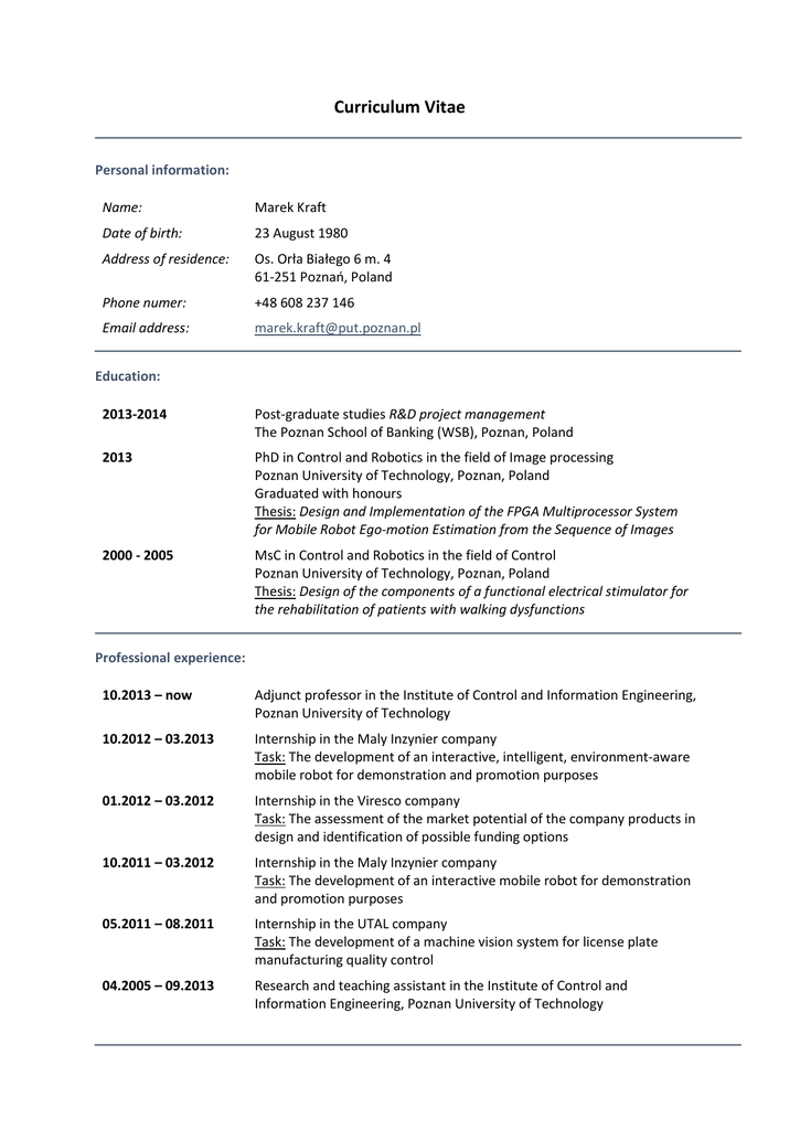 Curriculum Vitae Personal information: Name: Marek Kraft Date of birth: 23 August 1980 Address of residence: Os. Orła Białego 6 m. 4 61-251 Poznań, Poland Phone numer: +48 608 237 146 Email address: [email protected] Education: 2013-2014 Post-graduate studies R&D project management The Poznan School of Banking (WSB), Poznan, Poland 2013 PhD in Control and Robotics in the field of Image processing Poznan University of Technology, Poznan, Poland Graduated with honours Thesis: Design and Implementation of the FPGA Multiprocessor System for Mobile Robot Ego-motion Estimation from the Sequence of Images 2000 - 2005 MsC in Control and Robotics in the field of Control Poznan University of Technology, Poznan, Poland Thesis: Design of the components of a functional electrical stimulator for the rehabilitation of patients with walking dysfunctions Professional experience: 10.2013 – now Adjunct professor in the Institute of Control and Information Engineering, Poznan University of Technology 10.2012 – 03.2013 Internship in the Maly Inzynier company Task: The development of an interactive, intelligent, environment-aware mobile robot for demonstration and promotion purposes 01.2012 – 03.2012 Internship in the Viresco company Task: The assessment of the market potential of the company products in design and identification of possible funding options 10.2011 – 03.2012 Internship in the Maly Inzynier company Task: The development of an interactive mobile robot for demonstration and promotion purposes 05.2011 – 08.2011 Internship in the UTAL company Task: The development of a machine vision system for license plate manufacturing quality control 04.2005 – 09.2013 Research and teaching assistant in the Institute of Control and Information Engineering, Poznan University of Technology Research projects: 2014 – 2016 Investigator in in the research project nr 2013/09/B/ST7/01583 New simultaneous localization and mapping method with RGB-D data for precise navigation of autonomous robots in complex environments funded by the Polish National Science Centre 2012 – 2015 Investigator in in the research project nr 2011/03/N/ST6/03022 New concept of the network of smart cameras with enchanced autonomy for automatic surveillance systems funded by the Polish National Science Centre 2011 – 2013 Investigator in in the research project nr N/ST7/05940 The generalized, multirobot framework for an augmented, visual simultaneous localization and mapping system funded by the Polish National Science Centre 2010 – 2012 Main developer in the research project nr N N514 213238: Implementation of a fast embedded system for image analysis using FPGA technology, for application in mobile systems funded by the Polish Ministry of Science and Higher Education 2008 – 2010 Developer in the research project nr N N514 294635: An autonomous walking robot with a multisensor perception system for patrol missions in complicated indoor and ill-structured outdoor environments funded by the Polish Ministry of Science and Higher Education 2004 – 2007 Main developer in the research project nr 3 T11E041 27: A new control system for functional electrical stimulation applied to the rehabilitation of locomotion functions for patients with muscle group strokes funded by the Polish Ministry of Science and Higher Education Awards and achievements: 2014 Rector’s award for scientific achievements 04.2013 – 06.2013 Supervisor of a visiting PhD student at the Poznan University of Technology, joint work on research project and publication 2011 – 2012 Scholarship within the project Scholarship support for PhD students specializing in majors strategic for Wielkopolska's development, Submeasure 8.2.2 Human Capital Operational Programme, co-financed by European Union under the European Social Fund 2011 Laureate of the Scientist in business – enterprise internships for scholars programme organized by the Poznan City Council in the Sub-measure 8.2.2 Human Capital Operational Programme, co-financed by European Union under the European Social Fund 2009 Granted the Best lecturer award from the Student Council of the Faculty of Electrical Engineering, Poznan University of Technology 2008 – now Supervisor of the Xilinx University Program initiative at the Institute of Control and Information Engineering, Poznan University of Technology 2008 – 2012 Supervisor of the student’s scientific organization CybAiR 2006 Distinction in the Open Door contest for the best MSc theses organized by the Polish State Fund for Rehabilitation of Disabled People Promotional activities: 2013 Shows and demos during the Researcher’s Night 2011 Shows and demos during the Researcher’s Night 2010 Shows and demos during the Researcher’s Night 2005 – now Numerous multi-lecture open courses for the CybAiR student science organization, topics of which include: embedded systems, computer vision, electronics. 2005 – 2012 Co-founder and co-organizer of the CybAiRBot annual robotics festival at the Poznan University of Technology Memberships, committees and reviews: Memberships: IEEE (Signal Processing Society) International Carnivorous Plants Society Committees: International Conference on Advanced Concepts for Intelligent Vision Systems – Organizing Committee, Program Committee (2013) International Conference on Artificial Intelligence and Soft Computing, special session Pattern recognition and image processing in robotics – Organizing Committee (2012) International Conference On Artificial Intelligence and Soft Computing (2012, 2013) International Conference on Computer Recognition Systems (2013) International Conference on Advanced Concepts for Intelligent Vision Systems (2013) Conference reviews: Journal reviews: IEEE Transactions on Circuits and Systems for Video Technology (2012, 2013, 2014) Journal of Infrared Physics and Technology (2010) Skills: Language: Polish (native), English (fluent), German (basic) Programming: C/C++, Matlab, Python, VHDL