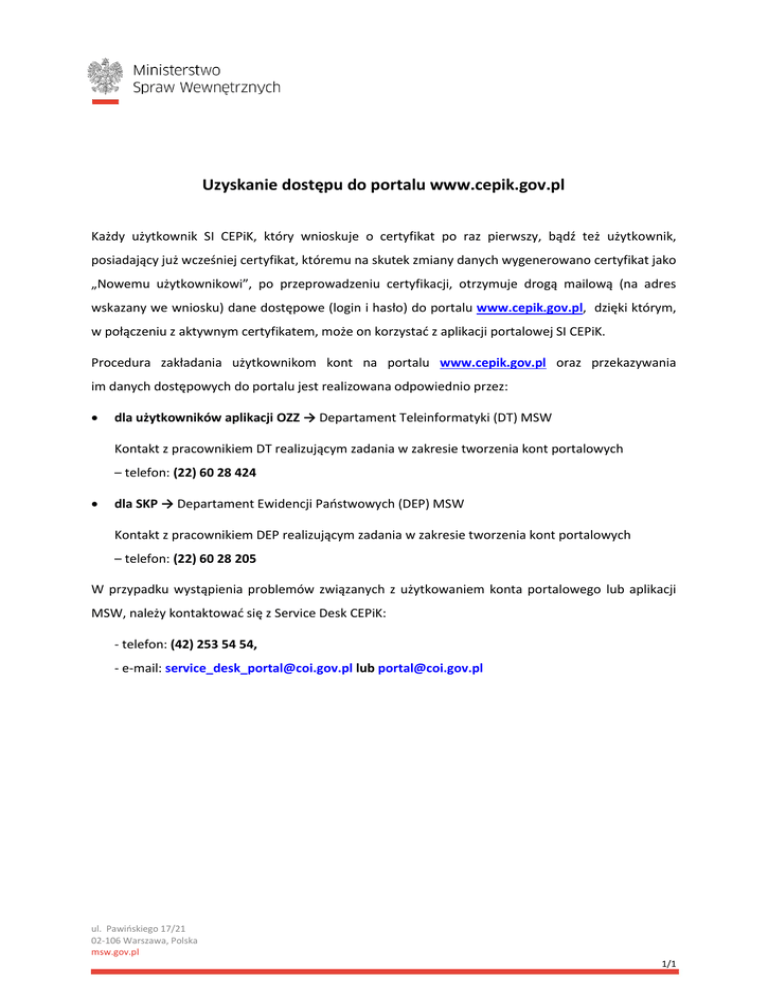 Uzyskanie dostępu do portalu www.cepik.gov.pl Każdy użytkownik SI CEPiK, który wnioskuje o certyfikat po raz pierwszy, bądź też użytkownik, posiadający już wcześniej certyfikat, któremu na skutek zmiany danych wygenerowano certyfikat jako „Nowemu użytkownikowi”, po przeprowadzeniu certyfikacji, otrzymuje drogą mailową (na adres wskazany we wniosku) dane dostępowe (login i hasło) do portalu www.cepik.gov.pl, dzięki którym, w połączeniu z aktywnym certyfikatem, może on korzystać z aplikacji portalowej SI CEPiK. Procedura zakładania użytkownikom kont na portalu www.cepik.gov.pl oraz przekazywania im danych dostępowych do portalu jest realizowana odpowiednio przez: dla użytkowników aplikacji OZZ → Departament Teleinformatyki (DT) MSW Kontakt z pracownikiem DT realizującym zadania w zakresie tworzenia kont portalowych – telefon: (22) 60 28 424 dla SKP → Departament Ewidencji Państwowych (DEP) MSW Kontakt z pracownikiem DEP realizującym zadania w zakresie tworzenia kont portalowych – telefon: (22) 60 28 205 W przypadku wystąpienia problemów związanych z użytkowaniem konta portalowego lub aplikacji MSW, należy kontaktować się z Service Desk CEPiK: - telefon: (42) 253 54 54, - e-mail: [email protected] lub [email protected] ul. Pawińskiego 17/21 02-106 Warszawa, Polska msw.gov.pl 1/1