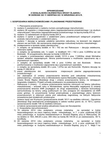 SPRAWOZDANIE Z DZIAŁALNOŚCI BURMISTRZA ŚRODY ŚLĄSKIEJ W OKRESIE OD 11 SIERPNIA DO 10 WRZEŚNIA 2014 R. I. GOSPODARKA NIERUCHOMOŚCIAMI I PLANOWANIE PRZESTRZENNE 1) 2) 3) 4) 5) 6) • • • • • 7) • • • • • 1) 2) 1. Planowanie przestrzenne wydano 5 zawiadomień o nadaniu numeru porządkowego nieruchomości, wydano 26 wypisów z miejscowego planu zagospodarowania przestrzennego i ze studium uwarunkowań i kierunków zagospodarowania przestrzennego na łączną kwotę 670 zł. wydano 12 zaświadczeń na łączną kwotę 204 zł, wydano 3 opinie o zgodności z ustaleniami planu przedłożonych wstępnych projektów podziału nieruchomości z ustaleniami planu, wydano 1 decyzję w sprawie ustalenia warunków zabudowy, na terenach nie objętych planem we wsi Kulin, dla zamierzenia obejmującego rozbudowę budynku mieszkalnego, postępowania w sprawie opłaty planistycznej : w związku ze sprzedażą działek nr 16 i 142 we wsi Rakoszyce – decyzja ostateczna, dokonano wpłaty w związku ze sprzedażą udz. ½ część w działkach 151 i 152 o pow. 0,2090ha we wsi Bukówek. W przygotowaniu decyzja na kwotę 3.039,00 zł. w związku z przeniesieniem własności działki 121/3 o pow. 7,3263ha; obręb Michałów tytułem wkładów niepieniężnych. Strona poinformowana o możliwości zapoznania się z poprawionym operatem, w związku ze sprzedażą działki 146 o pow. 0,04ha we wsi Bukówek. Strona poinformowana o możliwości zapoznania się z poprawionym operatem, w związku ze sprzedażą działki 39 o pow. 1,47ha we wsi Komorniki. Wydano decyzję na kwotę 21.582,60 zł. prace planistyczne dot. opracowania miejscowych planów zagospodarowania przestrzennego : wsi Jastrzębce (2 zmiany przeznaczenia terenów pod zabudowę mieszkaniową jednorodzinną) – wniosek rolny w Ministerstwie (opinia Marszałka negatywna) miasto Środa Śląska (likwidacja drogi i zmiana przeznaczenia terenu na istniejącym targowisku miejskim). Projekt uchwały przekazano na posiedzenia komisji, Rakoszyce 3 zmiany : 1) zmiana przeznaczenia terenów rolniczych na tereny zabudowy mieszkaniowej – wniosek rolny w Ministerstwie, opinia Marszałka negatywna 2) zmiana przeznaczenia terenów ANR przyległych do drogi wojewódzkiej z terenów komunikacji samochodowej na tereny usług publicznych (w celu przejęcia ich nieodpłatnie od ANR przez gminę), 3) przywrócenie funkcji przemysłowej z poprzedniego planu terenom przeznaczonym w obecnym planie pod zabudowę zagrodową, na których faktycznie prowadzona jest działalność produkcyjna zmiana mpzp wsi Kryniczno (przeznaczenie działki 161/1 na siedlisko rolnicze) , Ogrodnica (likwidacja dogi wewnętrznej przebiegającej w całości wzdłuż granic dz. nr 16/1), Lipnica (przeznaczenie działki 108 na siedlisko rolnicze). w trakcie opracowania jest analiza aktualności mpzp wsi Szczepanów. 2. Gospodarka nieruchomościami 19 sierpnia 2014 roku podpisano umowę notarialną na sprzedaż w trybie bezprzetargowym na rzecz najemcy lokalu mieszkalnego nr 7 o pow. użytkowej 62,36 mkw, położonego w budynku wielolokalowym w Środzie Śląskiej przy ul. Malczyckiej 35 na działce nr 19/2, AM-25 o pow. 355 mkw za kwotę 85.144.00 zł, po zastosowaniu 60 % bonifikaty. 29 sierpnia 2014 roku podpisano umowę notarialną na sprzedaż w trybie bezprzetargowym na rzecz najemcy lokalu mieszkalnego nr 6 o pow. użytkowej 32,71 mkw, położonego w budynku wielolokalowym w Środzie Śląskiej przy ul. 1. Maja 1 na 1 działce nr 35, AM-16 o pow. 287 m 2 za kwotę 12.510.70 zł, po zastosowaniu 80 % bonifikaty. 3) Przygotowano dokumentację do sprzedaży w trybie bezprzetargowym na rzecz najemcy lokalu mieszkalnego nr 9 o pow. użytkowej 30.95. mkw w budynku położonym w Środzie Śląskiej przy ul. Wrocławskiej 9. Po zastosowaniu 80% bonifikaty kwota do zapłaty wynosi 12.949,40 zł . 4) Przygotowano dokumentację do sprzedaży w trybie bezprzetargowym na rzecz najemcy lokalu mieszkalnego nr 2 o pow. użytkowej 92.37. mkw w budynku położonym w Środzie Śląskiej przy ul. Wrocławskiej 27 . Po zastosowaniu 60% bonifikaty kwota do zapłaty wynosi 101.142,36 zł . 5) Przygotowano dokumentację do sprzedaży w trybie ustnego przetargu nieograniczonego lokal usługowy o pow. użytkowej 44.04. mkw w budynku położonym w Środzie Śląskiej przy ul. Malczyckiej 33 . Wartość rynkowa nieruchomość lokalowej rzeczoznawca majątkową określił na kwotę 104.680 zł . 6) Przygotowano dokumentację do sprzedaży w trybie ustnego przetargu nieograniczonego nieruchomości zabudowanej położone we wsi Proszków na działce nr 267/7 , AM-2 o pow. 2435 m 2. Wartość rynkowa nieruchomość rzeczoznawca majątkową określił na kwotę 119.366 zł . 7) Przygotowano dokumentację dla rzeczoznawcy majątkowego niezbędną do sporządzenia wyceny lokalu mieszkalnego nr 5 położonego w Środzie Śląskiej przy pl. Wolności 41 i lokalu mieszkalnego nr 2 położonego w Środzie Śląskiej przy ul. Świdnickiej 26 , przeznaczonych do sprzedaży w trybie bezprzetargowym na rzecz najemców. 8) Przygotowano dokumentację do Starostwa Powiatowego dla potrzeb wydania zaświadczenia o samodzielności lokalu mieszkalnego nr 5 położonego w budynku wielolokalowym w Środzie Śląskiej przy pl. Wolności 41 . 9) Zlecono wykonanie podziału działki nr 68/12 położonej w Wojczycach z przeznaczeniem pod przepompownię ścieków. Właściciel nieruchomości: Agencja Nieruchomości Rolnych. 10) Założono i przeniesiono do księgowości 2 kartoteki użytkownika wieczystego gruntów położonych na terenie miasta Środa Śląska 11) Ogłoszono na dzień 26.09.2014r.drugi przetarg ustny nieograniczony na sprzedaż : a) pięciu działek niezabudowanych położonych przy ul. Kilińskiego w Środzie Śląskiej przeznaczonych pod zabudowę garażową: • działka nr 123/3, AM-18 o pow. 0,0020 ha, cena wywoławcza 4.722 zł, wysokość wadium 800,00 zł • działka nr 123/4, AM-18 o pow. 0,0019 ha