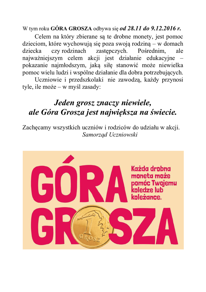 W tym roku GÓRA GROSZA odbywa się od 28.11 do 9.12.2016 r. Celem na który zbierane są te drobne monety, jest pomoc dzieciom, które wychowują się poza swoją rodziną – w domach dziecka czy rodzinach zastępczych. Pośrednim, ale najważniejszym celem akcji jest działanie edukacyjne – pokazanie najmłodszym, jaką siłę stanowić może niewielka pomoc wielu ludzi i wspólne działanie dla dobra potrzebujących. Uczniowie i przedszkolaki nie zawodzą, każdy przynosi tyle, ile może – w myśl zasady: Jeden grosz znaczy niewiele, ale Góra Grosza jest największa na świecie. Zachęcamy wszystkich uczniów i rodziców do udziału w akcji. Samorząd Uczniowski