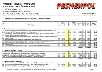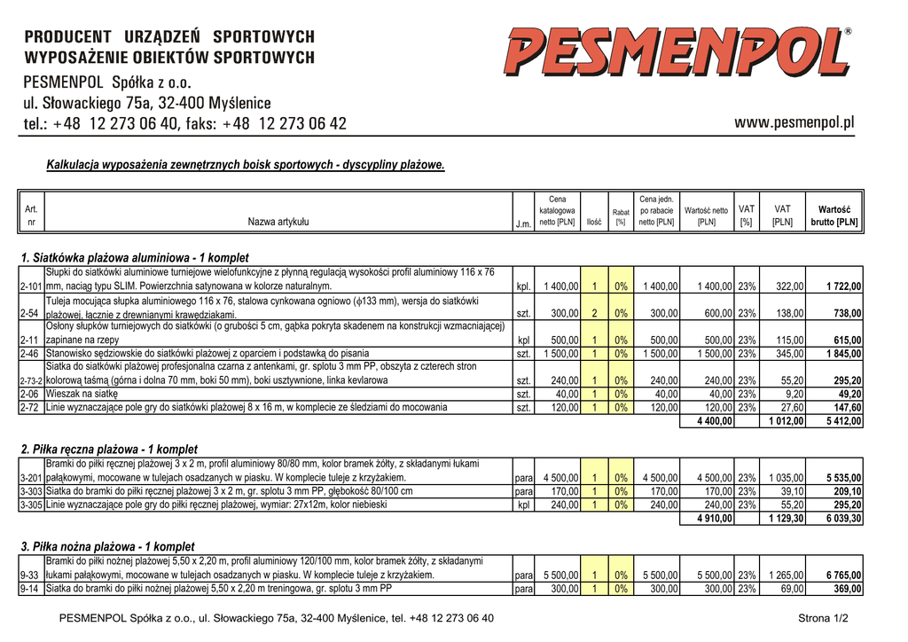Kalkulacja wyposażenia zewnętrznych boisk sportowych - dyscypliny plażowe. Art. nr Nazwa artykułu Cena katalogowa J.m. netto [PLN] Ilość Rabat [%] Cena jedn. po rabacie netto [PLN] Wartość netto [PLN] VAT [%] VAT [PLN] Wartość brutto [PLN] 1. Siatkówka plażowa aluminiowa - 1 komplet 2-101 2-54 2-11 2-46 2-73-2 2-06 2-72 Słupki do siatkówki aluminiowe turniejowe wielofunkcyjne z płynną regulacją wysokości profil aluminiowy 116 x 76 mm, naciąg typu SLIM. Powierzchnia satynowana w kolorze naturalnym. Tuleja mocująca słupka aluminiowego 116 x 76, stalowa cynkowana ogniowo (φ133 mm), wersja do siatkówki plażowej, łącznie z drewnianymi krawędziakami. Osłony słupków turniejowych do siatkówki (o grubości 5 cm, gąbka pokryta skadenem na konstrukcji wzmacniającej) zapinane na rzepy Stanowisko sędziowskie do siatkówki plażowej z oparciem i podstawką do pisania Siatka do siatkówki plażowej profesjonalna czarna z antenkami, gr. splotu 3 mm PP, obszyta z czterech stron kolorową taśmą (górna i dolna 70 mm, boki 50 mm), boki usztywnione, linka kevlarowa Wieszak na siatkę Linie wyznaczające pole gry do siatkówki plażowej 8 x 16 m, w komplecie ze śledziami do mocowania kpl. 1 400,00 1 0% 1 400,00 1 400,00 23% 322,00 1 722,00 szt. 300,00 2 0% 300,00 600,00 23% 138,00 738,00 kpl szt. 500,00 1 500,00 1 1 0% 0% 500,00 1 500,00 500,00 23% 1 500,00 23% 115,00 345,00 615,00 1 845,00 szt. szt. szt. 240,00 40,00 120,00 1 1 1 0% 0% 0% 240,00 40,00 120,00 240,00 23% 40,00 23% 120,00 23% 4 400,00 55,20 9,20 27,60 1 012,00 295,20 49,20 147,60 5 412,00 para para kpl 4 500,00 170,00 240,00 1 1 1 0% 0% 0% 4 500,00 170,00 240,00 4 500,00 23% 170,00 23% 240,00 23% 4 910,00 1 035,00 39,10 55,20 1 129,30 5 535,00 209,10 295,20 6 039,30 para para 5 500,00 300,00 1 1 0% 0% 5 500,00 300,00 5 500,00 23% 300,00 23% 1 265,00 69,00 6 765,00 369,00 2. Piłka ręczna plażowa - 1 komplet Bramki do piłki ręcznej plażowej 3 x 2 m, profil aluminiowy 80/80 mm, kolor bramek żółty, z składanymi łukami 3-201 pałąkowymi, mocowane w tulejach osadzanych w piasku. W komplecie tuleje z krzyżakiem. 3-303 Siatka do bramki do piłki ręcznej plażowej 3 x 2 m, gr. splotu 3 mm PP, głębokość 80/100 cm 3-305 Linie wyznaczające pole gry do piłki ręcznej plażowej, wymiar: 27x12m, kolor niebieski 3. Piłka nożna plażowa - 1 komplet Bramki do piłki nożnej plażowej 5,50 x 2,20 m, profil aluminiowy 120/100 mm, kolor bramek żółty, z składanymi 9-33 łukami pałąkowymi, mocowane w tulejach osadzanych w piasku. W komplecie tuleje z krzyżakiem. 9-14 Siatka do bramki do piłki nożnej plażowej 5,50 x 2,20 m treningowa, gr. splotu 3 mm PP PESMENPOL Spółka z o.o., ul. Słowackiego 75a, 32-400 Myślenice, tel. +48 12 273 06 40 Strona 1/2 9-20-3 Linie wyznaczające pole gry do piłki nożnej plażowej, wymiar 27,5 x 36,5 m, kolor niebieski kpl 300,00 1 0% 300,00 Suma po rabacie 300,00 23% 6 100,00 netto 15 410,00 69,00 1 403,00 369,00 7 503,00 VAT 3 544,30 brutto 18 954,30 __________________________________________________________________________________ Urządzenia posiadają wszystkie wymagane prawem Certyfikaty Zgodności z Normami. Na urządzenia produkcji PESMENPOL udzielamy 36-miesięcznej gwarancji. Termin ważności oferty - 60 dni. PESMENPOL Spółka z o.o., ul. Słowackiego 75a, 32-400 Myślenice, tel. +48 12 273 06 40 Strona 2/2