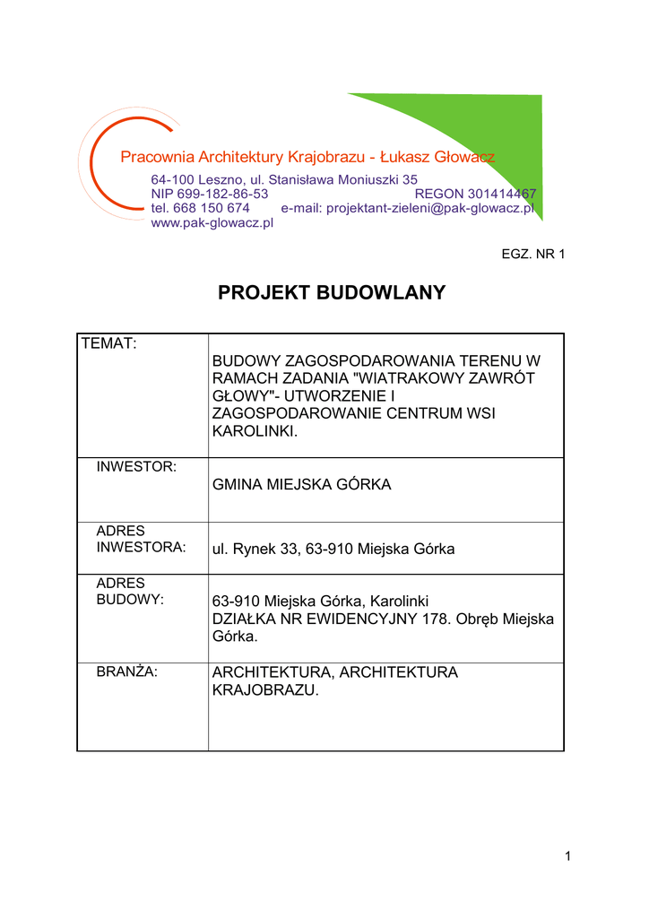 Pracownia Architektury Krajobrazu - Łukasz Głowacz 64-100 Leszno, ul. Stanisława Moniuszki 35 NIP 699-182-86-53 REGON 301414467 tel. 668 150 674 e-mail: [email protected] www.pak-glowacz.pl EGZ. NR 1 PROJEKT BUDOWLANY TEMAT: BUDOWY ZAGOSPODAROWANIA TERENU W RAMACH ZADANIA "WIATRAKOWY ZAWRÓT GŁOWY"- UTWORZENIE I ZAGOSPODAROWANIE CENTRUM WSI KAROLINKI. INWESTOR: GMINA MIEJSKA GÓRKA ADRES INWESTORA: ADRES BUDOWY: BRANŻA: ul. Rynek 33, 63-910 Miejska Górka 63-910 Miejska Górka, Karolinki DZIAŁKA NR EWIDENCYJNY 178. Obręb Miejska Górka. ARCHITEKTURA, ARCHITEKTURA KRAJOBRAZU. 1 ZESPÓŁ PROJEKTOWY Oświadczam, że niniejsza dokumentacja projektowa została wykonana zgodnie z zasadami wiedzy technicznej, obowiązującymi w tym zakresie przepisami i normami, oraz że jest kompletna z punktu widzenia celu, któremu ma służyć. Część PB Imię i nazwisko ARCHITEKTURA MGR INŻ. ARCH. JERZY WOJCIECHOWSKI upr. projekt. arch. nr ewid. 611/84/Lo ARCHITEKTURA INŻ. ARCH. KRAJ. BARTOSZ GŁOWACZ podpis KRAJOBRAZU ARCHITEKTURA MGR INŻ. ŁUKASZ GŁOWACZ KRAJOBRAZU DATA WYKONANIA ------------------Październik 2011 2 SPIS ZAWARTOŚCI TECZKI CZEŚĆ OPISOWA 1. OPIS OGÓLNY; 4 1.1. DANE EWIDENCYJNE; 1.2. PODSTAWA OPRACOWANIA; 4 4 1.3. Lokalizacja; 1.4. Opis stanu istniejącego; 1.5. Program funkcjonalny, zakres opracowania; 1.6. Stan prawny terenu; 1.7. Bilans Terenu: 2. CHARAKTERYSTYKA OBIEKTU; 3. OPIS SZCZEGÓŁOWYCH ELEMENTÓW ZAGOSPODAROWANIA TERENU; 3.1. Nawierzchnia utwardzone. 3.1.1. Nawierzchnia ścieżek i placów z miału kamiennego; 3.1.2. Nawierzchnia utwardzona z kostki granitowej typu niesort. 3.2. Elementy małej architektury. 3.2.1. ŁAWKA Z OPARCIEM 3.2.2. ŁAWKA BEZ OPARCIA 3.2.3. KOSZ NA ŚMIECI 3.3. Plac zabaw. 3.3.1 Opis wyposażenia placu zabaw 3.3.2 Opis stosowanych materiałów do produkcji 3.3.3 Opis urządzenia – Zestaw zabawowy . 3.3.4 Opis urządzenia – Huśtawka wahadłowa pojedyncza. 3.3.4 Opis urządzenia – Huśtawka wahadłowa pojedyncza. 3.3.5 Opis urządzenia – Huśtawka wahadłowa pojedyncza. 3.3.6 Opis urządzeń - Sprężynowce. 3.3.7 Opis urządzeń – karuzela Spodek. 3.3.8 Tablica z regulaminem. 3.3.9 Nawierzchnia pod urządzenia placu zabaw; 3.4. Zieleń. 3.4. Elementy do rozbiórki. 3.5. Schody. 3.6. Wyposażenie boiska do piłki siatkowej na trawie 4. WPŁYW INWESTYCJI NA ŚRODOWISKO; 6. OCHRONA P.POŻ. 7. INSTALACJE. 8. ODWODNIENIE PROJEKTOWANYCH NAWIERZCHNI. 9. DOSTĘPNOŚĆ DLA OSÓB NIEPEŁNOSPRAWNYCH. 10. INFORMACJA NA TEMAT PLANU BIOZ; 11. UWAGI KOŃCOWE; 4 4 4 5 5 5 5 5 5 6 7 7 8 8 9 9 10 10 12 12 13 13 14 15 16 16 18 18 18 18 19 19 19 19 19 19 SPIS CZĘŚCI RYSUNKOWEJ NR RYS. 1. 2. 3. 4. NAZWA RZUT ZAGOSPODAROWANIA TERENU SCHODY NAWIERZCHNIA Z MIAŁU KAMIENNEGO NAWIERZCHNIA Z KOSTKI GRANITOWEJ STRONA 21 22 23 24 Uprawnienia projektantów ….……………………………………………… 25-27 3 OPIS TECHNICZNY DO PROJEKTU ZAGOSPODAROPWANIA TERENU WRAMACH ZADANIA "WIATRAKOWY ZAWRÓT GŁOWY"UTWORZENIE I ZAGOSPODAROWANIE CENTRUM WSI KAROLINKI. 1. OPIS OGÓLNY; 1.1. Dane ewidencyjne; • • • Inwestor: Gmina Miejska Górka Lokalizacja inwestycji: Rynek 33, 63-910 Miejska Górka. Nr ewidencyjny działki: Działka NR 178.Obręb Miejska Górka. 1.2. Podstawa opracowania; • • • • • • • • Zlecenie Inwestora Mapa sytuacyjna terenu w skali 1:500 Uzgodniona z Inwestorem koncepcja architektoniczna Wizja lokalna w terenie Norma PN-EN 1176-1 „Wyposażenie placów zabaw i nawierzchnie”, Norma PN-EN 1177 „Nawierzchnie placów zabaw amortyzujące upadki”, Dokumentacja fotograficzna Obowiązujące normy i normatywy techniczne projektowania. 1.3. Lokalizacja; Teren objęty opracowaniem znajduje się w województwie Wielkopolskim w Gminie Miejska Górka we wsi Karolinki zlokalizowany jest na działce nr ewid. 178. Obręb Miejska Górka. 1.4. Opis stanu istniejącego; Teren objęty opracowaniem znajduje się w Gminie Miejska Górka, we wsi Karolinki. Na w/w terenie znajduje się zabytkowy wiatrak. Teren objęty niniejszym opracowaniem jest terenem płaskim, pokryty trawą oraz pojedynczymi drzewami i krzewami (tworzą one zwarty żywopłot wzdłuż granicy działki). Na działce znajdują drewniany wiatrak. Przez teren przebiega napowietrzna linia energetyczna średniego napięcia. Na działce objętej opracowaniem znajduje się stara nieczynna studnia. 1.5. Program funkcjonalny, zakres opracowania; Program zagospodarowania działki nr ewid. 178 we wsi Karolinki obejmuje budowę nawierzchni utwardzonych i elementów małej architektury (ławki, kosze na śmieci, urządzenia placu zabaw, zialeń). Zakres projektu. obejmuje opis techniczny, rysunki techniczne. 4 1.6. Stan prawny terenu; Teren objęty opracowaniem znajduje się w Gminie Miejska Górka, we wsi Karolinki. Działka nr 178 jest własnością Gminy Miejska Górka. Na terenie objętym opracowaniem występują stanowiska archeologiczne oraz drewniany wiatrak jest wpisany do rejestru zabytków. Teren nie jest wpisany do strefy ochrony konserwatorskiej. Teren nie stanowi obszaru prawnie chronionego. 1.7. Bilans Terenu: - powierzchnia projektowanych nawierzchni z miału kamiennego – 395m² - powierzchnia projektowanych nawierzchni z kostki granitowej – 296m² - powierzchnia projektowanych nawierzchni piasku drobnego – 497m² - powierzchnia projektowana biologicznie czynna – 3330m² - powierzchnia działki – 4518m² 2. CHARAKTERYSTYKA OBIEKTU; Teren objęty opracowaniem znajduje się na terenie Gminy Miejska Górka i dotyczy budowy: - nawierzchni utwardzonych - elementów małej architektury (ławki, kosze na śmieci, urządzenia placu zabaw) - nasadzenia zieleni. Teren ma utrzymać dotychczasową funkcję i dodatkowo ma zwiększyć swoją funkcjonalność i atrakcyjność rekreacyjną dla potrzeb uczniów szkoły. 3. OPIS SZCZEGÓŁOWYCH ELEMENTÓW ZAGOSPODAROWANIA TERENU; 3.1. Nawierzchnia utwardzone. 3.1.1. Nawierzchnia ścieżek i placów z miału kamien