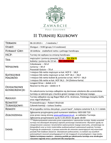 II Turniej Klubowy Termin: 06.10.2013 r. Start: Shotgun – 9:00 (grupy 3-4 osobowe) Format Gry: 18 dołków - stableford netto z pełnego handicapu HCP: Turniej nie wpływa na zmianę handicapu Tee: Wpisowe: Kategorie Nagród: Dodatkowe konkurencje: Reguły: Komitet Turniejowy: Remisy: / niedziela / mężczyźni i juniorzy powyżej 15 lat – TEE ŻÓŁTE kobiety i juniorzy do 15 lat – TEE CZERWONE Członkowie – 50 zł Juniorzy – 30 zł Pozostali Goście – 70 zł I miejsce Stb netto mężczyzn w kat. HCP 0 - 18,0 I miejsce Stb netto mężczyzn w kat. HCP 18,1 – 36,0 I miejsce Stb netto kobiet & juniorów w kat. HCP 0 – 36,0 I miejsce Stb netto w kat. HCP 36,1 - 54 (Zielona Karta) Longest Drive – dołek nr 6 Nearest to the pin – dołek nr 4 Po zakończeniu turnieju odbędzie się darmowe szkolenie dla uczestników turnieju w zakresie gry z bunkra green`owego oraz fairway`owego. Turniej odbędzie się wg Reguł R&A of St. Andrews, Polskiego Związku Golfa oraz reguł lokalnych. Przewodniczący – Robert Woźniak Członek komisji – Łukasz Szadny W przypadku remisu decyduje „count back”, kolejno ostatnie 9, 6, 3 i 1 dołek Zgłoszenia: Zgłoszenia przyjmujemy pod numerem telefonu: 603 630 710 oraz przez naszą stronę www.golfzawarcie.pl , w zakładce Turnieje. Zgłoszenia przyjmowane są do 5.10.2013r do godz 18:00 Inne: ***Wykorzystywanie wizerunku przez organizatora i sponsorów turnieju. Każdy uczestnik turnieju ma obowiązek akceptacji zapisów poniższego oświadczenia: Wyrażam zgodę na nieograniczone czasowo i terytorialnie wykorzystanie mojego wizerunku, utrwalonego na fotografiach oraz w treści materiałów audiowizualnych wykonanych podczas Turnieju Przyjmuję do wiadomości, iż prawa autorskie do utworów zawierających mój wizerunek posiada Pole Golfowe Zawarcie. Oświadczam jednocześnie, iż zrzekam się wszelkich potencjalnych roszczeń przysługujących mi lub mogących mi przysługiwać z tego tytułu. Opłata turniejowa zawiera – smaczny posiłek po zakończeniu turnieju oraz atrakcyjne rzeczowe nagrody wraz z pucharami dla zwycięzców.
