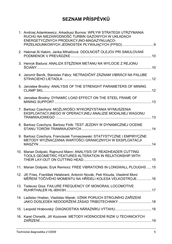SEZNAM PŘÍSPĚVKŮ 1. Andrzej Adamkiewicz, Arkadiusz Burnos: WPŁYW STRATEGII UTRZYMANIA RUCHU NA NIEZAWODNOŚĆ TURBIN GAZOWYCH W UKŁADACH ENERGETYCZNYCH PRODUKCYJNO-MAGAZYNUJĄCOPRZEŁADUNKOWYCH JEDNOSTEK PŁYWAJĄCYCH (FPSO) ................................9 2. Hekmat Al Hakim, Janka Mihalčová: ODOLNOSŤ OLEJOV PRI SIMULOVANÍ PODMIENOK V PREVÁDZKE ...................................................................................10 3. Henryk Badura: ANALIZA STĘŻENIA METANU NA WYLOCIE Z REJONU ŚCIANY......................................................................................................................10 4. Jaromír Beník, Stanislav Fábry: NETRADIČNÝ ZÁZNAM VIBRÁCIÍ NA PALUBE STÍHACIEHO LIETADLA ...........................................................................................12 5. Jarosław Brodny: ANALYSIS OF THE STRENGHT PARAMETERS OF MINING CLAMP SKL ...............................................................................................................12 6. Jarosław Brodny: DYNAMIC LOAD EFFECT ON THE STEEL FRAME OF MINING SUPPORT ....................................................................................................13 7. Bartosz Czechyra: MOŻLIWOŚCI WYKORZYSTANIA WYMUSZENIA EKSPLOATACYJNEGO W OPERACYJNEJ ANALIZIE MODALNEJ WAGONU TRAMWAJOWEGO ...................................................................................................13 8. Bartosz Czechyra, Bartosz Firlik: TEST JEZDNY W DYNAMICZNEJ OCENIE STANU TORÓW TRAMWAJOWYCH ........................................................................14 9. Bartosz Czechyra, Franciszek Tomaszewski: STATYSTYCZNE I EMPIRYCZNE METODY WYZNACZANIA WARTOŚCI GRANICZNYCH W EKSPLOATACJI MASZYN ....................................................................................................................14 10. Marian Dolipski, Rajmund Mann: ANALYSIS OF READHEADER CUTTING TOOLS GEOMETRIC FEATURES ALTERATION IN RELATIONSHIP WITH THEIR LAY-OUT ON CUTTING HEAD......................................................................15 11. Marian Dolipski, Eryk Remiorz: FREE VIBRATIONS IN LONGWALL PLOUGHS .....15 12. Jiří Fries, František Helebrant, Antonín Novák, Petr Klouda, Vlastimil Moni: MĚŘENÍ TOČIVÉHO MOMENTU NA HŘÍDELI KOLESA VELKOSTROJE...............16 13. Tadeusz Giza: FAILURE FREQUENCY OF MONORAIL LOCOMOTIVE RUHRTHALER HL-90H/3H........................................................................................17 14. Ladislav Hrabec, Vladislav Marek: VZNIK PORUCH STROJNÍHO ZAŘÍZENÍ JAKO DŮSLEDEK NEDODRŽENÍ ZÁSAD TRIBOTECHNIKY ..................................18 15. Leopold Hrabovský: DIAGNOSTIKA NÁRAZNÍKU VÝTAHU .....................................18 16. Karel Chmelík, Jiří Koziorek: METODY HODNOCENÍ RIZIK U TECHNICKÝCH ZAŘÍZENÍ...................................................................................................................19 Technická diagnostika z1/2009 5 17. Petr Chytka: JE DOBRÉ MÍT ZNALOSTI Z TRIBODIAGNOSTIKY A NEDĚLAT ZÁVĚRY PŘEDEM, KDYŽ JE VŠE JASNÉ ...............................................................19 18. Martin Janečka, Petr Kozák, Karel Rozum: EXTERNÍ FIXACE NA VŠB – TU OSTRAVA ..................................................................................................................20 19. Štefan Kacvinský, Juraj Sinay, Adrián Tompoš: VYUŽITIE SOFTVÉRU NA HODNOTENIE ÚDRŽBY V PODNIKOCH..................................................................21 20. Jaromír Kijonka, Petr Orság: ANALÝZA ZÁVISLOSTI VIBRACÍ NA KMITOČTU A KONSTRUKCI KOSTRY ASYNCHRONNÍHO MOTORU .......................................21 21. Petr Kozák, Martin Janečka: NEŽELEZNÉ MATERIÁLY – PĚSTOVÁNÍ JEJICH MONOKRYSTALŮ .....................................................................................................22 22. Marcin Krause, Marek Profaska: PRZEGLĄD ZASAD I METOD OCENY RYZYKA ZAWODOWEGO OBOWIĄZUJĄCYCH W POLSCE..................................23 23. Lubomír Lazar: KMITÁNÍ OBĚŽNÉHO KOLA VODNÍ TURBÍNY V EXTRÉMNÍCH PODMÍNKÁCH ...............................................................................23 24. Peter Lipták, Jozef Dudáš, Ivan Kopecký: ŠPECIÁLNA TECHNIKA Z POHĽADU DIAGNOSTIKOVANIA TRIBOLOGICKÝCH ASPEKTOV MOBILNÝMI PRACOVISKAMI ........................................................................................................24 25. Zbigniew Matuszak, Jacek Malesza: CHARAKTERYSTYKA PROGRAMU KOMPUTEROWEGO WSPOMAGAJĄCEGO DIAGNOSTYKĘ I NADZÓR NAD PRACĄ SIŁOWNI KUTRA RYBACKIEGO .................................................................25 26. Zbigniew Matuszak, Elżbieta Milewska: PODATNOŚĆ DIAGNOATYCZNA WYBRANEJ PRODUKCYJNEJ LINII TECHNOLOGICZNEJ.....................................26 27. Jaroslav Melecký: DIAGNOSTICKÁ MĚŘENÍ A MKP V BIOMECHANICE................27 28. Janka Mihalčová, Hekmat Al Hakim: SLEDOVANIE VPLYVU TRIBOTECHNICKEJ DIAGNOSTIKY NA VLASTNOSTI MAZÍV V PREVÁDZKE .....28 29. Stanislav Mišák: DIAGNOSTIKA KABELOVÉHO VEDENÍ - VLIV ZEMNÍHO SPOJENÍ NA IZOLAČNÍ SYSTÉM KABELOVÉHO VEDENÍ .....................................28 30. Pavel Němeček, Lukáš Čapek, Jan Novák: APLIKACE VIBRAČNÍCH METOD V MEDICÍNSKÉ OBLASTI.............................................................................................29 31. Jan Novák: SYSTÉM ŘÍZENÍ A HODNOCENÍ SMĚROVÉ STABILITY RC MODELU VOZIDLA 4WS...........................................................................................29 32. Grażyna Ober: OPIS RUCHU STROPNICY SEKCJI OBUDOWY ZMECHANIZOWANEJ OSŁONOWEJ JEDNOSZEREGOWEJ Z WYKORZYSTANIEM MACIERZY PRZEMIESZCZEŃ...............................................30 33. Małgorzata Orczyk: BADANIA MONITORINGOWE HAŁASU WOKÓŁ ODCINKA AUTOSTRADY A2 KOMORNIKI – KRZESINY ..........................................................30 6 Technická diagnostika z1/2009 34. L