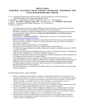 REGULAMIN TURNIEJU HALOWEJ PIŁKI NOŻNEJ ZESPOŁÓW WIEJSKICH 2017 O PUCHAR BURMISTRZA ŚREMU 1. Cel – popularyzacja piłki nożnej jako dyscypliny sportu, prowadzenie rywalizacji sportowej, zagospodarowanie czasu wolnego mieszkańców Śremu. 2. Organizator – Urząd Miejski w Śremie, Śremski Sport Sp. z o.o. – obiekt sportowy, 3. Termin – 29.01.2017r.( niedziela ) godz. 9:00 – informacja pod nr tel. 887 888 214, 604 102 992 4. Miejsce – sala sportowa Śremskiego Sportu Sp. z o.o. ul. Staszica 1a 5. Zasady uczestnictwa: - - - - w Turnieju mogą uczestniczyć zespoły piłkarskie, których zawodnicy są mieszkańcami danej wsi zgłoszonej do rozgrywek / potwierdzony meldunek w dowodzie osobistym / Warunkowo dopuszcza się udział zawodników, którzy są mieszkańcami danych wiosek (nie ważne jest zameldowanie a fakt zamieszkania,) Sołtys jest odpowiedzialny za weryfikację miejsca zamieszkania zawodnika. termin zgłoszeń – do 18 stycznia 2017r. obiekt sportowy ul. Staszica 1a, osobiście lub email: [email protected], istnieje możliwość wspólnego wystawienia reprezentacji z dwóch lub więcej wsi pod warunkiem, ze dana wieś nie bierze udziału w Turnieju ( na zgłoszeniu należy zaznaczyć z jakiej wsi pochodzą poszczególni zawodnicy ), zespół może składać się maksymalnie z 10 zawodników, lista zgłoszonych zawodników powinna być podpisana przez sołtysa danej wsi, w Turnieju nie mogą uczestniczyć zawodnicy zgłoszeni do rozgrywek organizowanych przez WZPN w sezonie 2016/2017r., organizator nie ponosi odpowiedzialności prawnej za udział w Turnieju osób chorych i wynikających z tego powodu wypadków oraz ze skutków wypadków podczas gry, w ramach Turnieju obiekt sportowy jest ubezpieczony od odpowiedzialności cywilnej, ubezpieczenia NW zespoły powinny załatwić we własnym zakresie, zespół zgłaszający protest musi dostarczyć go na piśmie bezpośrednio po rozegranym meczu, organizator rozpatruje sprawę i informuje zainteresowane zespoły, warunkiem przyjęcia protestu jest wpłacenie kaucji w wysokości 100 zł, w przypadku nieuzasadnionego protestu kaucja przepada, w Turnieju mogą uczestniczyć zawodnicy, którzy ukończyli 18 lat, posiadają aktualne badania lekarskie potwierdzone na liście zgłoszeń , W turnieju dopuszcza się uczestnictwo zawodników między 16-18 rokiem życiem za pisemną zgodą rodziców/opiekunów, 6. Zasady bezpieczeństwa, odpowiedzialność 1. Każdy z zawodników bierze udział w turnieju na własną odpowiedzialność, zarówno zdrowotną (zawodnik przystępując do turnieju jest świadom, iż stan jego zdrowia winien umożliwiać mu branie udziału w turnieju, że nie istnieją przeciwwskazania zdrowotne do brania udziału w turnieju) jak i finansową (każdy z zawodników zapewnia sobie do udziału w turnieju właściwą odzież, w szczególności obuwie sportowe dostosowane do danej dyscypliny sportowej. 2. Każdy z zawodników zobowiązany jest na własny koszt i we własnym zakresie skonsultować swój stan zdrowia z lekarzem przed podjęciem decyzji o wzięciu udziału w turnieju. 3. Każdy z zawodników biorący udział w turnieju jest zobligowany we własnym zakresie i na koszt własny zapoznać się z podstawowymi zasadami bezpieczeństwa dla danej dyscypliny sportowej (sposób przeprowadzenia rozgrzewki, ćwiczeń rozciągających przed i w czasie turnieju, właściwej pozycji wykonywania poszczególnych ćwiczeń, zachowania ostrożności itp.). 4. Przystąpienie do turnieju jest jednoznaczne z potwierdzeniem, że zawodnik spełnia warunki do wzięcia udziału w turnieju pod względem zdrowotnym oraz, że zawodnik posiada podstawową wiedze w zakresie bezpieczeństwa. 5. Poucza się zawodników, iż powinni posiadać ubezpieczenie OC od nieszczęśliwych wypadków obejmujące uprawianie sportów. Koszt ww. ubezpieczenia oraz wybór firmy ubezpieczeniowej jest obowiązkiem zawodnika. 7. Zasady przeprowadzenia Turnieju: Podczas rozgrywek obowiązują przepisy gry w halową piłkę nożną z następującymi zmianami: - zespoły uczestniczące w Turnieju podzielone zostaną na grupy, - w Turnieju rozstawione zostaną zespoły, które w ubiegłorocznej edycji zakwalifikowały się do gier półfinałowych, - w grupach zespoły grają systemem każdy z każdym do ćwierćfinału awansują po 2 pierwsze zespoły z każdej grupy, - czas trwania meczu 1 x 10 min. bez zmiany boisk, - nie obowiązują przerwy dla zespołu podczas trwania meczu, - nie obowiązują faule akumulowane, - kartki: żółta – kara 1,5 min czerwona – zawodnik opuszcza boisko i nie może grać w następnym meczu, wykluczenie z gry / czerwona kartka / powoduje 3 min. osłabienie zespołu - od ćwierćfinału obowiązuje system pucharowy, - w przypadku remisu – 3 rzuty karne, a następnie rzuty karne do skutku , 8. Nagrody – zwycięski zespół otrzymuje puchar i dyplomy ufundowane przez organizatorów, oraz nagrody rzeczowe. 9. Uwagi końcowe – wszystkie kwestie sporne rozstrzyga organizator Turnieju. Każdy zespół otrzyma napoje chłodzące.
