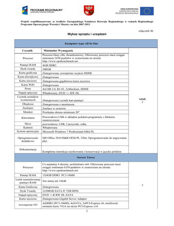 Projekt współfinansowany ze środków Europejskiego Funduszu Rozwoju Regionalnego w ramach Regionalnego Programu Operacyjnego Warmia i Mazury na lata 2007-2013 Wykaz sprzętu i urządzeń załącznik 4b Komputer typu All In One Czynnik Procesor Pamięć RAM Dysk twardy Karta graficzna Karta dźwiękowa Karta sieciowa Karta WiFi Porty Napęd optyczny Czytnik nośników wymiennych Obudowa Zasilanie Monitor Klawiatura Mysz Kamera System operacyjny Oprogramowanie dodatkowe Dokumentacja Minimalne Wymagania Procesor klasy x86, dwurdzeniowy. Oferowany procesor musi osiągać minimum 2450 punktów w zestawieniu na stronie http://www.cpubenchmark.net 4GB DDR3 500GB Zintegrowana, zewnętrzne wyjście HDMI Zintegrowana Zintegrowana gigabitowa karta sieciowa Zintegrowana 4xUSB 2.0, RJ-45, 2xMiniJack, HDMI Wbudowany, DVD +/- RW DL sztuk 2 Zintegrowany czytnik kart pamięci Zintegrowana z monitorem Zasilacz w zestawie Przekątna ekranu minimum 20" Przewodowa USB w układzie polskim programisty z blokiem numerycznym przewodowa, USB, 2 przyciski, rolka Wbudowana Microsoft Windows 7 Professional 64bit PL MS Office 2010 H&B OEM PL 32bit, Oprogramowanie do nagrywania płyt. Kompletna instrukcja użytkowania i konserwacji w języku polskim Serwer Tower Procesor Pamięć RAM Co najmniej 4 rdzenie, architektura x64. Oferowany procesor musi osiągać minimum 6350 punktów w zestawieniu na stronie http://www.cpubenchmark.net 1X4GB DDR3 PC3-10600 Limit zainstalowanej Nie mniej niż 16GB pamięci RAM Karta Graficzna Dysk Twardy Napęd optyczny Karta sieciowa Zintegrowana 2x500GB SATA II 7200 RPM DVD +/-R RW DL SATA Zintegrowana Gigabit Server Adapter wewnętrzne I/O 4xDDR3 (PC3-10600), 4xSATA, 2xPCI-Express x8, możliwość montażu karty VGA na slocie PCI-Express x16 1 2 Projekt współfinansowany ze środków Europejskiego Funduszu Rozwoju Regionalnego w ramach Regionalnego Programu Operacyjnego Warmia i Mazury na lata 2007-2013 Panel tylni RAID Karty rozszerzeń Ilość zasilaczy Moc zasilacza Złącza zasilacza Typ obudowy Cechy obudowy Mysz Klawiatura System operacyjny Oprogramowanie dodatkowe Serwis i gwarancja Dokumentacja 4xUSB, VGA, RJ45 0/1 Karta zarządzająca do serwera. 1 300W w obciążeniu ciągłym, Moc dopasowana do profilu energetycznego pozostałych komponentów Kompatybilne z użytą płytą główną, 6 złącz SATA Tower Beznarzędziowy dostęp do wnętrza obudowy. Na przednim panelu 2 porty USB oraz numeryczny panel diagnostyczny POST, Aktywna wentylacja wewnątrz obudowy. Laserowa, przewodowa, USB, 2 przyciski, rolka Przewodowa USB w układzie polskim programisty z blokiem numerycznym Windows Server 2012 Foundation 64 bit PL OEM + nośnik instalacyjny Microsoft office 2010 H&B 32bit, Oprogramowanie do nagrywania płyt. Gwarancja 3 lata Kompletna instrukcja użytkowania i konserwacji w języku polskim Urządzenie wielofunkcyjne Technologia Maksymalny rozmiar nośnika Rozdzielczości Duplex Szybkość druku mono Monochromatyczne laserowe urządzenie wielofunkcyjne A4 Druk mono: 600x600 Kopiarka: 600x600 skaner: 1200x1200 Automatyczny 20 stron/min 2 Złącza USB, RJ45 Oferowane funkcje Drukowanie, kopiowanie, skanowanie, faksowanie Dokumentacja Obsługiwane formaty i rodzaje nośników Kompletna instrukcja użytkowania i konserwacji w języku polskim Papier: A4, A5, A6 Słuchawki z mikrofonem Typ Słuchawki nauszne z mikrofonem 2 2 Projekt współfinansowany ze środków Europejskiego Funduszu Rozwoju Regionalnego w ramach Regionalnego Programu Operacyjnego Warmia i Mazury na lata 2007-2013 Transmisja Przewodowa Złącze mini Jack Regulacja głośności: Sprzętowa na kablu Projektor WiFi Format obrazu Rozdzielczość obrazu Złącza Audio łączność Dołączone oprogramowanie Dokumentacja Dodatki Przekątna format obrazu obsługa Złącza Oprogramowanie Dokumentacja Kompatybilność Dodatki Pasek skrótów Technologia Funkcje główne Szybkość druku mono Rozdzielczości Podajnik papieru Pojemność kasety Duplex Czas druku pierwszej kopii Prędkość kopiowania Typ skanera standardowy 4:3 SVGA 800 x 600 D-sub, HDMI, DVI, USB, mini Jack Wbudowane głośniki przewodowa i bezprzewodowa 1 Oprogramowanie umożliwiające przewodową i bezprzewodową konfigurację projektora Kompletna instrukcja użytkowania i konserwacji w języku polskim Pilot, torba do projektora, uchwyt sufitowy Tablica interaktywna 56" Standardowy 4:3 dowolny marker lub palec USB w języku polskim Kompletna instrukcja użytkowania i konserwacji w języku polskim 1 Windows 7/Vista/XP Komplet markerów, ścierka/gąbka, uchwyt do montażu na ścianie po obu stronach tablicy Kserokopiarka Monochromatyczne laserowe urządzenie wielofunkcyjne drukowanie, kopiowanie, skanowanie, wysyłanie, faksowanie 20 str/min druk mono: 600x600, skaner mono: 600x600, skaner kolor: 300x300 kaseta + podajnik uniwersalny 400 arkuszy automatyczny nie więcej niż 10 sekund 1 20 str/min Kolorowy skaner płaski z automatycznym dwustronnym podajnikiem dokumentów Wydajność tonera 8000 arkuszy Złącza Sterowanie Zarządzanie Zabezpieczenia Wysyłanie skanów USB 2.0, RJ45 Kolorowy wyświetlacz LCD Sieciowe, programowe. Zabezpieczanie kodem e-mail, faks, nośnik USB 3 Projekt współfinansowany ze środków Europejskiego Funduszu Rozwoju Regionalnego w ramach Regionalnego Programu Operacyjnego Warmia i Mazury na lata 2007-2013 Obsługiwane formaty nośników Obsługiwane typy nośników Kompatybilność Usługi okołosprzedażowe Dokumentacja Inne Technologia Funkcje główne A3, A4, A5 Papier: zwykły, Eco, kolorowy, o dużej gramaturze, broszurowy, koperta, bond; folia przezroczysta, etykiety Windows XP/Vista/7 Instalacja, przeszkolenie 2 osób w obsłudze kserokopiarki Kompletna instrukcja użytkowania i konserwacji w języku polskim Możliwość zamontowania dodatkowych kaset/szuflad, w komplecie toner oraz stolik pod kopiarkę Monochromatyczne laserowe urządzenie wielofunkcyjne drukowanie, kopiowanie, skanowanie, wysyłanie, faksowanie Tele