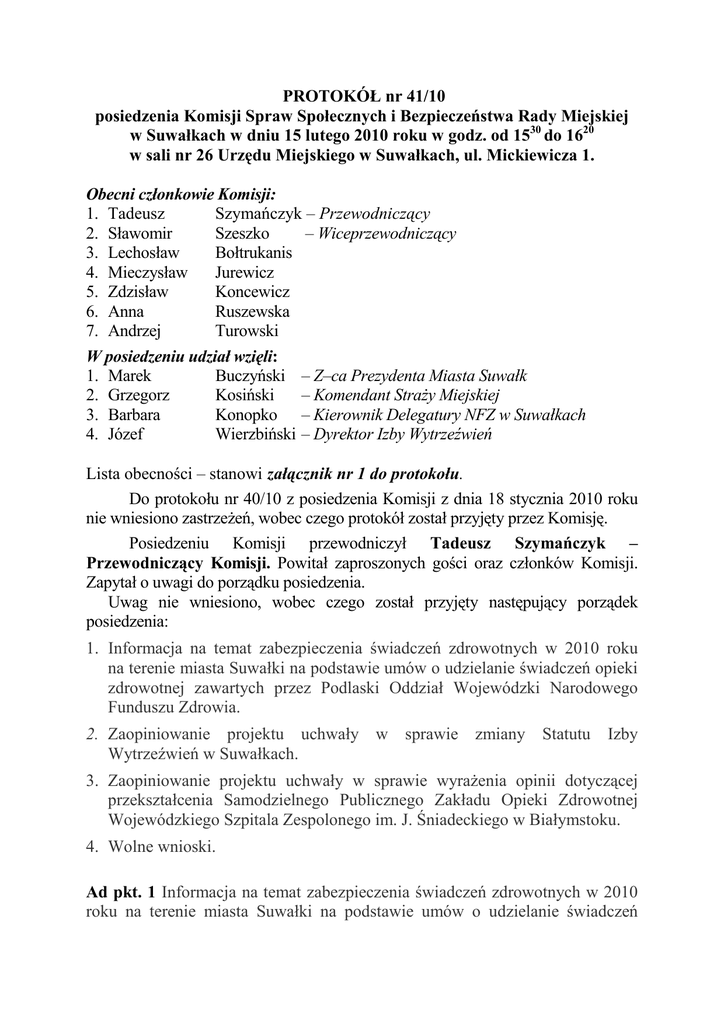 PROTOKÓŁ nr 41/10 posiedzenia Komisji Spraw Społecznych i Bezpieczeństwa Rady Miejskiej w Suwałkach w dniu 15 lutego 2010 roku w godz. od 1530 do 1620 w sali nr 26 Urzędu Miejskiego w Suwałkach, ul. Mickiewicza 1. Obecni członkowie Komisji: 1. Tadeusz Szymańczyk – Przewodniczący 2. Sławomir Szeszko – Wiceprzewodniczący 3. Lechosław Bołtrukanis 4. Mieczysław Jurewicz 5. Zdzisław Koncewicz 6. Anna Ruszewska 7. Andrzej Turowski W posiedzeniu udział wzięli: 1. Marek Buczyński – Z–ca Prezydenta Miasta Suwałk 2. Grzegorz Kosiński – Komendant StraŜy Miejskiej 3. Barbara Konopko – Kierownik Delegatury NFZ w Suwałkach 4. Józef Wierzbiński – Dyrektor Izby Wytrzeźwień Lista obecności – stanowi załącznik nr 1 do protokołu. Do protokołu nr 40/10 z posiedzenia Komisji z dnia 18 stycznia 2010 roku nie wniesiono zastrzeŜeń, wobec czego protokół został przyjęty przez Komisję. Posiedzeniu Komisji przewodniczył Tadeusz Szymańczyk – Przewodniczący Komisji. Powitał zaproszonych gości oraz członków Komisji. Zapytał o uwagi do porządku posiedzenia. Uwag nie wniesiono, wobec czego został przyjęty następujący porządek posiedzenia: 1. Informacja na temat zabezpieczenia świadczeń zdrowotnych w 2010 roku na terenie miasta Suwałki na podstawie umów o udzielanie świadczeń opieki zdrowotnej zawartych przez Podlaski Oddział Wojewódzki Narodowego Funduszu Zdrowia. 2. Zaopiniowanie projektu uchwały w sprawie zmiany Statutu Wytrzeźwień w Suwałkach. Izby 3. Zaopiniowanie projektu uchwały w sprawie wyraŜenia opinii dotyczącej przekształcenia Samodzielnego Publicznego Zakładu Opieki Zdrowotnej Wojewódzkiego Szpitala Zespolonego im. J. Śniadeckiego w Białymstoku. 4. Wolne wnioski. Ad pkt. 1 Informacja na temat zabezpieczenia świadczeń zdrowotnych w 2010 roku na terenie miasta Suwałki na podstawie umów o udzielanie świadczeń opieki zdrowotnej zawartych przez Podlaski Oddział Wojewódzki Narodowego Funduszu Zdrowia – załącznik nr 2 do protokołu. Barbara Konopko poinformowała, iŜ zabezpieczenie świadczeń zdrowotnych na 2010 rok nastąpiło na podstawie aneksowania umów zawartych ze świadczeniodawcami na lata 2009 – 2011. Uzgodnieniom stron podlegała kwota zobowiązania i warunki finansowania w poszczególnych zakresach świadczeń. W większości wypadków propozycje zostały zaakceptowane i podpisano aneksy finansowe na rok 2010. oznacza to, ze w róŜnych rodzajach świadczeń mamy świadczeniodawców takich jak w ubiegłym roku, ani ich nie przybyło, ani tez nie ubyło. Wyjątek stanowi Samodzielny Publiczny Zakład Opieki Zdrowotnej Ośrodek Rehabilitacji, który jako jedyny nie wyraził zgody na proponowane warunki finansowe, w związku z obowiązującymi przepisami na obowiązek świadczyć usługi do końca lutego br., czyli przez dwa pierwsze miesiące na zasadach obowiązujących w 2009 roku, przy takich samych stawkach i takich samych ilościach. Celem zabezpieczenia świadczeń w rodzaju rehabilitacja lecznicza od 1 marca 2010 roku, Podlaski Oddział Wojewódzki NFZ odwłosił konkurs na świadczenie w/w usług, którego rozstrzygnięcie nastąpi w dniu 19 lutego 2010 roku. Mieczysław Jurewicz zapytał na czym polega pielęgniarska opieka długoterminowa? Barbara Konopko wyjaśniła, Ŝe pielęgniarska opieka długoterminowa jest to opieka nad obłoŜnie i przewlekle chorymi przebywającymi w domu. Pacjenci w pielęgniarskiej opiece długoterminowej nie wymagają hospitalizacji w oddziałach lecznictwa stacjonarnego i z róŜnych względów nie chcą lub nie mogą przebywać w zakładach opieki długoterminowej, a ze względu na istniejące problemy zdrowotne wymagają systematycznej i intensywnej opieki pielęgniarskiej udzielanej w warunkach domowych i realizowanej we współpracy z lekarzem podstawowej opieki zdrowotnej. Celem pielęgniarskiej opieki długoterminowej jest zapewnienie świadczeń pielęgniarskich w środowisku domowym pacjentom obłoŜnie chorym, jak równieŜ przygotowanie pacjenta i jego rodziny do samoopieki i samopielęgnacji, w tym radzenia sobie z niepełnosprawnością. Wykwalifikowane pielęgniarki zapewniają opiekę ściśle współpracując z lekarzami rodzinnymi, pomagają w rozwiązywaniu problemów zdrowotnych związanych z samodzielnym funkcjonowaniem w środowisku domowym, prowadzą edukację zdrowotną osób objętych opieką oraz członków ich rodzin. Do pielęgniarskiej opieki długoterminowej mogą być zakwalifikowani pacjenci przewlekle chorzy i niepełnosprawni, niezdolni do samoopieki wymagający bezwzględnie realizacji przynajmniej jednego z wymienionych świadczeń pielęgniarskich przez okres powyŜej 2 tygodni: kroplowego wlewu doŜylnego wynikającego ze stałego zlecenia lekarskiego związanego z prowadzonym procesem leczenia; wykonywania zabiegów pielęgnacyjno-leczniczych w stomiach, przetokach, odleŜynach, troficznych owrzodzeniach podudzi i trudno gojących się ranach; karmienia przez zgłębnik i przez przetokę; płukania pęcherza moczowego; pielęgnacji pacjenta z rurką tracheotomijną; profilaktyki p/odleŜynowej. Podstawą objęcia chorego pielęgniarską opieką długoterminową jest: skierowanie lekarza podstawowej opieki zdrowotnej lub lekarza prowadzącego pacjenta z oddziału szpitalnego, po zakończonym procesie leczenia w warunkach szpitalnych; zgoda pacjenta wyraŜona na piśmie; kwalifikacja pielęgniarska do objęcia opieką długoterminową domową. Czas objęcia chorego opieką jest uwarunkowany stanem zdrowia pacjenta, ale nie moŜe przekraczać 6 miesięcy. W uzasadnionych przypadkach moŜe nastąpić przedłuŜenie tego okresu, za zgodą oddziału NFZ. Zdzisław Koncewicz zwrócił uwagę, Ŝe w br. suwalskie jednostki słuŜby zdrowia otrzymały na poszczególne procedury procentowo mniej pieniędzy niŜ w 2009 roku. Utrudni to dostęp do świadczeń zdrowotnych oraz spowoduje wydłuŜenie kolejek do specjalistów. Z informacj