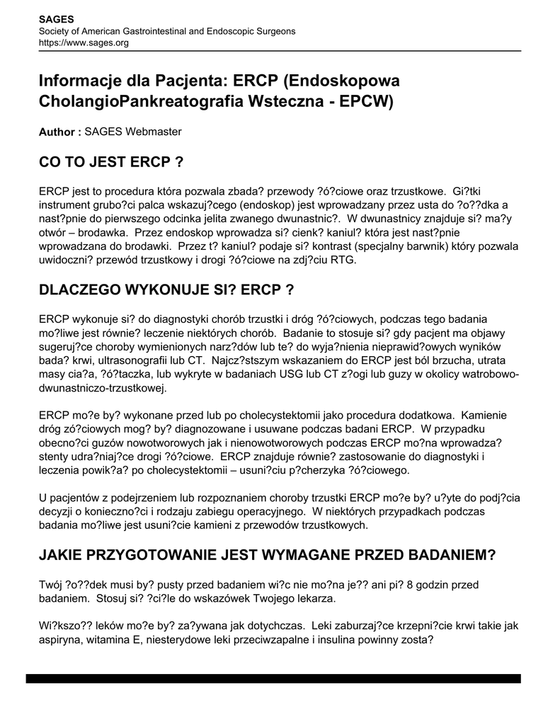 SAGES Society of American Gastrointestinal and Endoscopic Surgeons https://www.sages.org Informacje dla Pacjenta: ERCP (Endoskopowa CholangioPankreatografia Wsteczna - EPCW) Author : SAGES Webmaster CO TO JEST ERCP ? ERCP jest to procedura która pozwala zbada? przewody ?ó?ciowe oraz trzustkowe. Gi?tki instrument grubo?ci palca wskazuj?cego (endoskop) jest wprowadzany przez usta do ?o??dka a nast?pnie do pierwszego odcinka jelita zwanego dwunastnic?. W dwunastnicy znajduje si? ma?y otwór – brodawka. Przez endoskop wprowadza si? cienk? kaniul? która jest nast?pnie wprowadzana do brodawki. Przez t? kaniul? podaje si? kontrast (specjalny barwnik) który pozwala uwidoczni? przewód trzustkowy i drogi ?ó?ciowe na zdj?ciu RTG. DLACZEGO WYKONUJE SI? ERCP ? ERCP wykonuje si? do diagnostyki chorób trzustki i dróg ?ó?ciowych, podczas tego badania mo?liwe jest równie? leczenie niektórych chorób. Badanie to stosuje si? gdy pacjent ma objawy sugeruj?ce choroby wymienionych narz?dów lub te? do wyja?nienia nieprawid?owych wyników bada? krwi, ultrasonografii lub CT. Najcz?stszym wskazaniem do ERCP jest ból brzucha, utrata masy cia?a, ?ó?taczka, lub wykryte w badaniach USG lub CT z?ogi lub guzy w okolicy watrobowodwunastniczo-trzustkowej. ERCP mo?e by? wykonane przed lub po cholecystektomii jako procedura dodatkowa. Kamienie dróg zó?ciowych mog? by? diagnozowane i usuwane podczas badani ERCP. W przypadku obecno?ci guzów nowotworowych jak i nienowotworowych podczas ERCP mo?na wprowadza? stenty udra?niaj?ce drogi ?ó?ciowe. ERCP znajduje równie? zastosowanie do diagnostyki i leczenia powik?a? po cholecystektomii – usuni?ciu p?cherzyka ?ó?ciowego. U pacjentów z podejrzeniem lub rozpoznaniem choroby trzustki ERCP mo?e by? u?yte do podj?cia decyzji o konieczno?ci i rodzaju zabiegu operacyjnego. W niektórych przypadkach podczas badania mo?liwe jest usuni?cie kamieni z przewodów trzustkowych. JAKIE PRZYGOTOWANIE JEST WYMAGANE PRZED BADANIEM? Twój ?o??dek musi by? pusty przed badaniem wi?c nie mo?na je?? ani pi? 8 godzin przed badaniem. Stosuj si? ?ci?le do wskazówek Twojego lekarza. Wi?kszo?? leków mo?e by? za?ywana jak dotychczas. Leki zaburzaj?ce krzepni?cie krwi takie jak aspiryna, witamina E, niesterydowe leki przeciwzapalne i insulina powinny zosta? This document is property of the Society of American Gastrointestinal and Endoscopic Surgeons. All Rights Reserved. Do not repost. przedyskutowane z lekarzem przed badaniem. Bardzo wa?ne jest równie? poinformowanie lekarza o alergiach na które cierpisz. Je?eli przed procedurami stomatologicznymi za?ywasz zwykle antybiotyki poinformuj o tym równie? Twojego lekarza gdy? mo?esz ich wymaga? równie? przed ERCP. Równie? w przypadku chorób uk?adu kr??enia i uk?adu oddechowego poinformuj o nich Twojego lekarza gdy? mo?e to mie? znaczenie podczas badania. W celu poprawy komfortu pacjenta podczas badania stosuje si? leki uspokajaj?ce, dlatego te? nale?y poprosi? kogo? o odwiezienia Ci? do domu po badaniu. Zastosowane leki uspokajaj?ce mog? upo?ledza? Twoje odruchy przez ca?y dzie? po badaniu dlatego te? nie powinno si? prowadzi? urz?dze? mechanicznych do ko?ca dnia. CZEGO MO?NA OCZEKIWA? PODCZAS ERCP? Miejscowy ?rodek znieczulaj?cy w sprayu jest stosowany do znieczulenia gard?a, co pomaga zwalczy? odruch wymiotny. Leki podawane do?ylnie powoduj? ?e badanie jest tolerowane znacznie lepiej. Pacjent uk?adany jest w pozycji le??cej na stole RTG. Nast?pnie przez usta do ?o??dka i dalej do dwunastnicy wprowadzany jest endoskop. Zabieg trwa oko?o 1 godziny. Endoskop nie przeszkadza w oddychaniu. Wi?kszo?? pacjentów zapada w sen podczas badania i odczuwa jedynie lekki dyskomfort. Mo?esz odczuwa? niewielkie rozd?cie podczas i po zabiegu. Powodowane to jest przez powietrze wdmuchiwane podczas badania do ?o??dka. Nast?pnie do przewodu trzustkowego i dróg ?ó?ciowych wstrzykiwany jest kontrast co równie? mo?e powodowa? chwilowy dyskomfort. CO SI? DZIEJE PO ERCP? Po badaniu pozostaniesz pod obserwacj? przez 1?2 godziny do momentu ust?pienia dzia?ania leków sedatywnych. Przez 1-2 dni mo?esz odczuwa? niewielki ból gard?a. Po opuszczeniu szpitala/gabinetu mo?esz powróci? niezw?ocznie do normalnej diety, leków i aktywno?ci ?yciowej, chyba ?e Twój lekarz zaleci inaczej. Twój lekarz poinformuje Ci? o wynikach badania. W przypadku gdy jest wykonywana biopsja na wyniki badania histopatologicznego oczekuje si? przez kilka dni. Dzia?anie leków uspokajaj?cych mo?e spowodowa? ?e nie b?dziesz pami?ta? instrukcji udzielonych ci przez lekarza po badaniu. W takim przypadku nale?y skontaktowa? si? z lekarzem nast?pnego dnia. JAKIE S? POWIK?ANIA BADANIA ERCP? ERCP jest bezpieczn? procedur? w r?kach do?wiadczonego lekarza endoskopisty. Powik?ania s? This document is property of the Society of American Gastrointestinal and Endoscopic Surgeons. All Rights Reserved. Do not repost. rzadkie, jednak?e mog? wyst?pi?. Najcz?stszym powik?aniem jest zapalenie trzustki spowodowane podra?nieniem trzustki przez kontrast lub kaniul?. Innym powik?aniem mo?e by? reakcja na podawane leki uspokajaj?ce. Powik?ania w miejscu podawania do?ylnego leków s? bardzo rzadkie, je?eli wyst?pi? objawiaj? si? w postaci bolesnego guzka który zanika po kilku tygodniach. Ciep?e i wilgotne objawy na bolesne miejsce przynosz? zwykle popraw?. Je?eli podczas ERCP wykonano procedur? terapeutyczn? tak? jak usuni?cie kamienia, za?o?enie stentu/drenu do dróg ?ó?ciowych, istnieje ryzyko dodatkowych powik?a? jak krwawienie lub perforacja (dziura w jelicie). Transfuzje krwi s? rzadko konieczne. Bardzo wa?nym elementem jest wczesne rozpoznanie powik?a? i natychmiastowy kontakt z lekarzem w przypadku wyst?pienia: silnego bólu brzucha, gor?czki, dreszczy, wymiotów, krwawienia z odbytu. This document is property of the Society of American Gastrointestinal and Endoscopic Surgeons. All Rights Reserved. Do not repost. Powered by TCPDF (www.tcpdf.org)